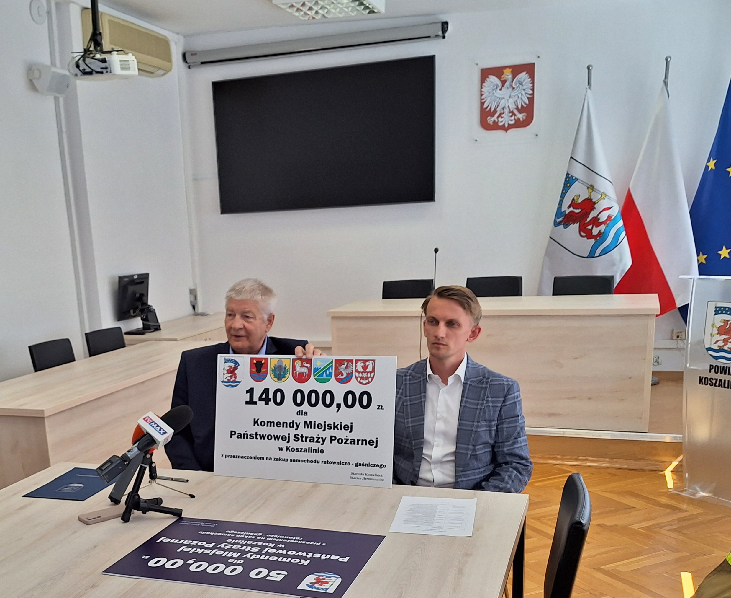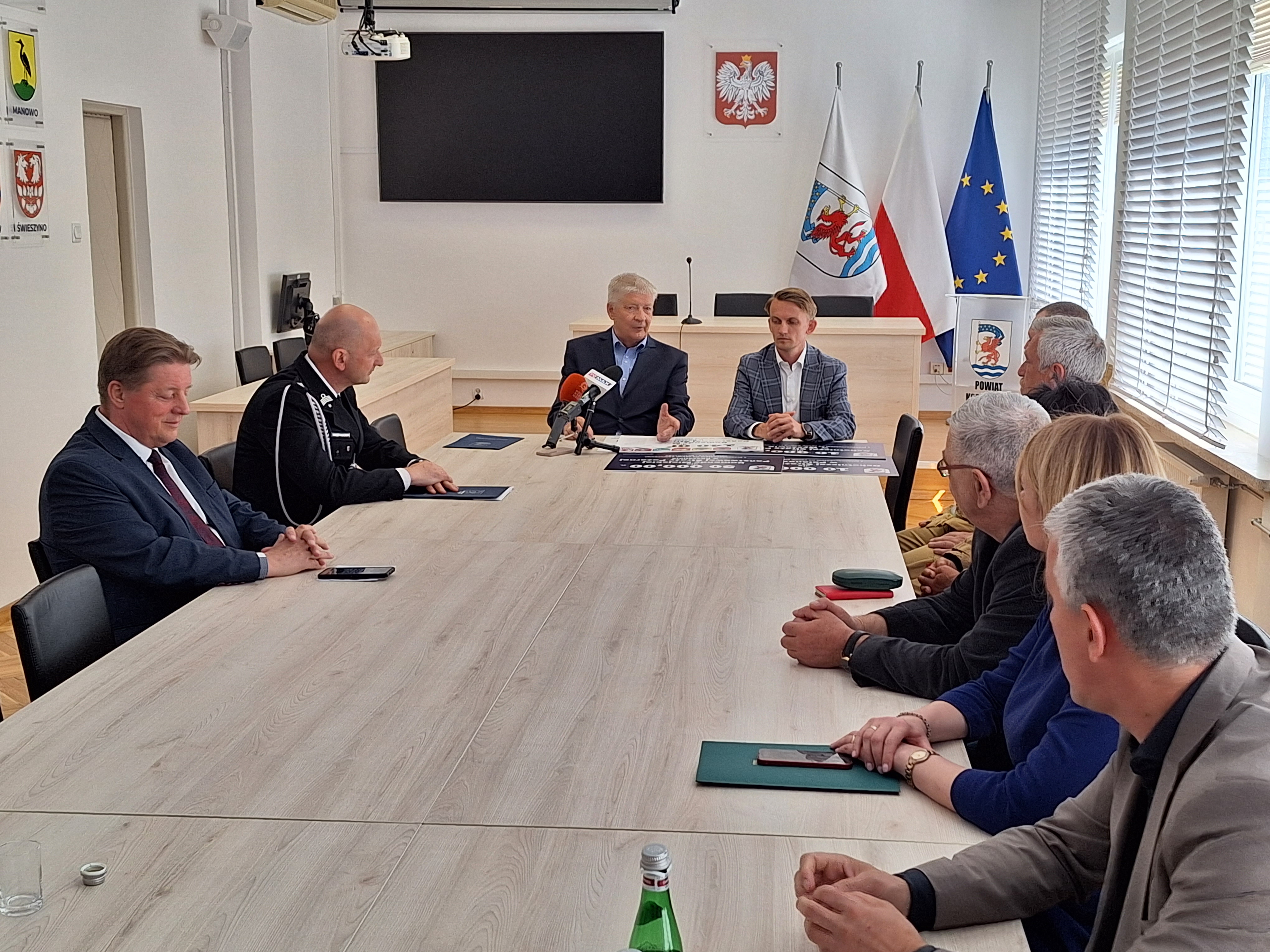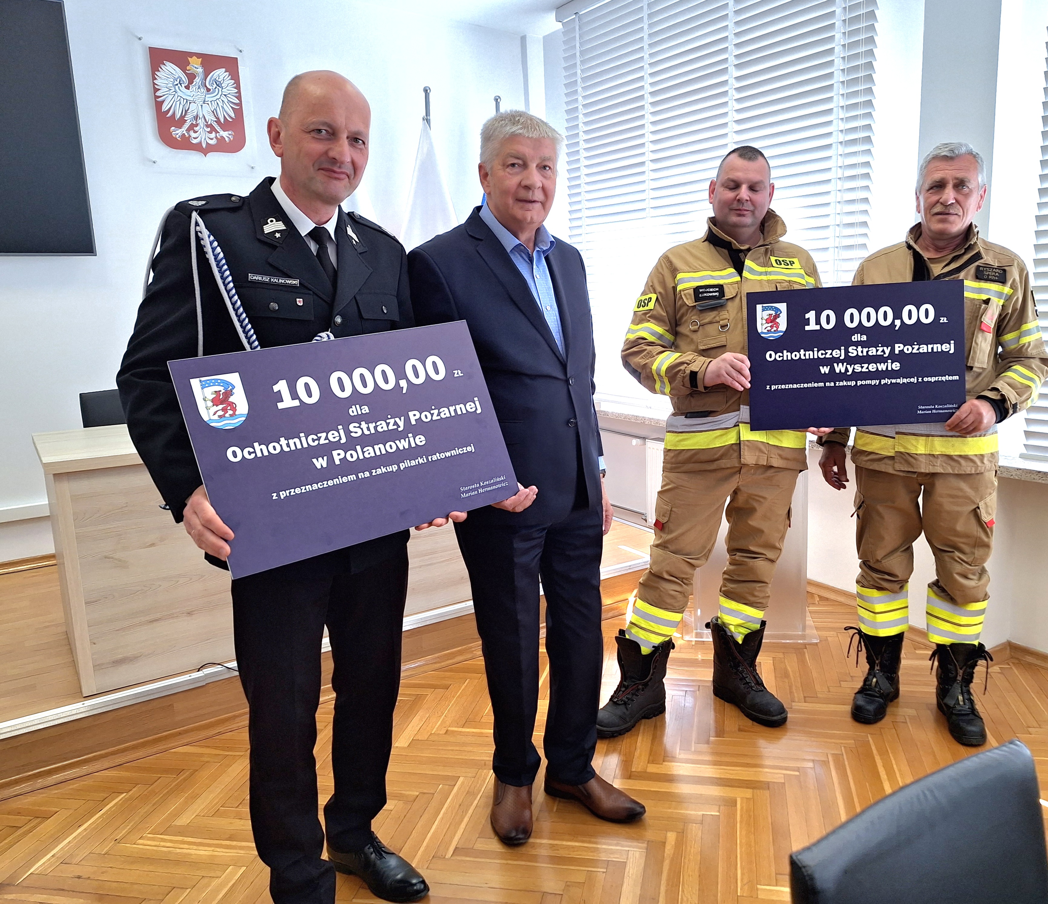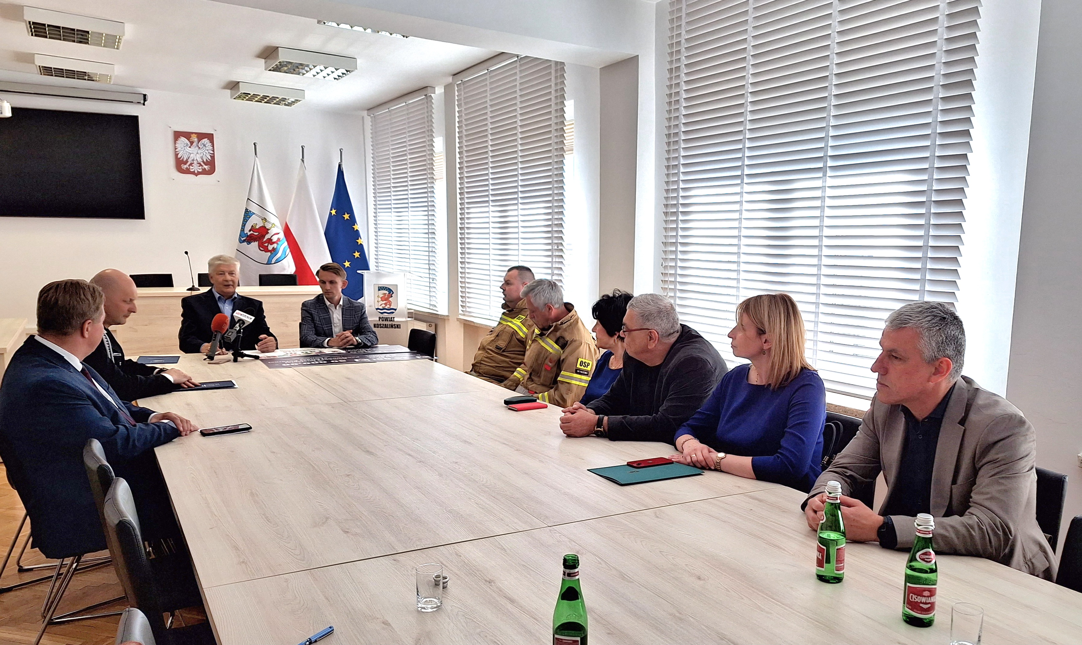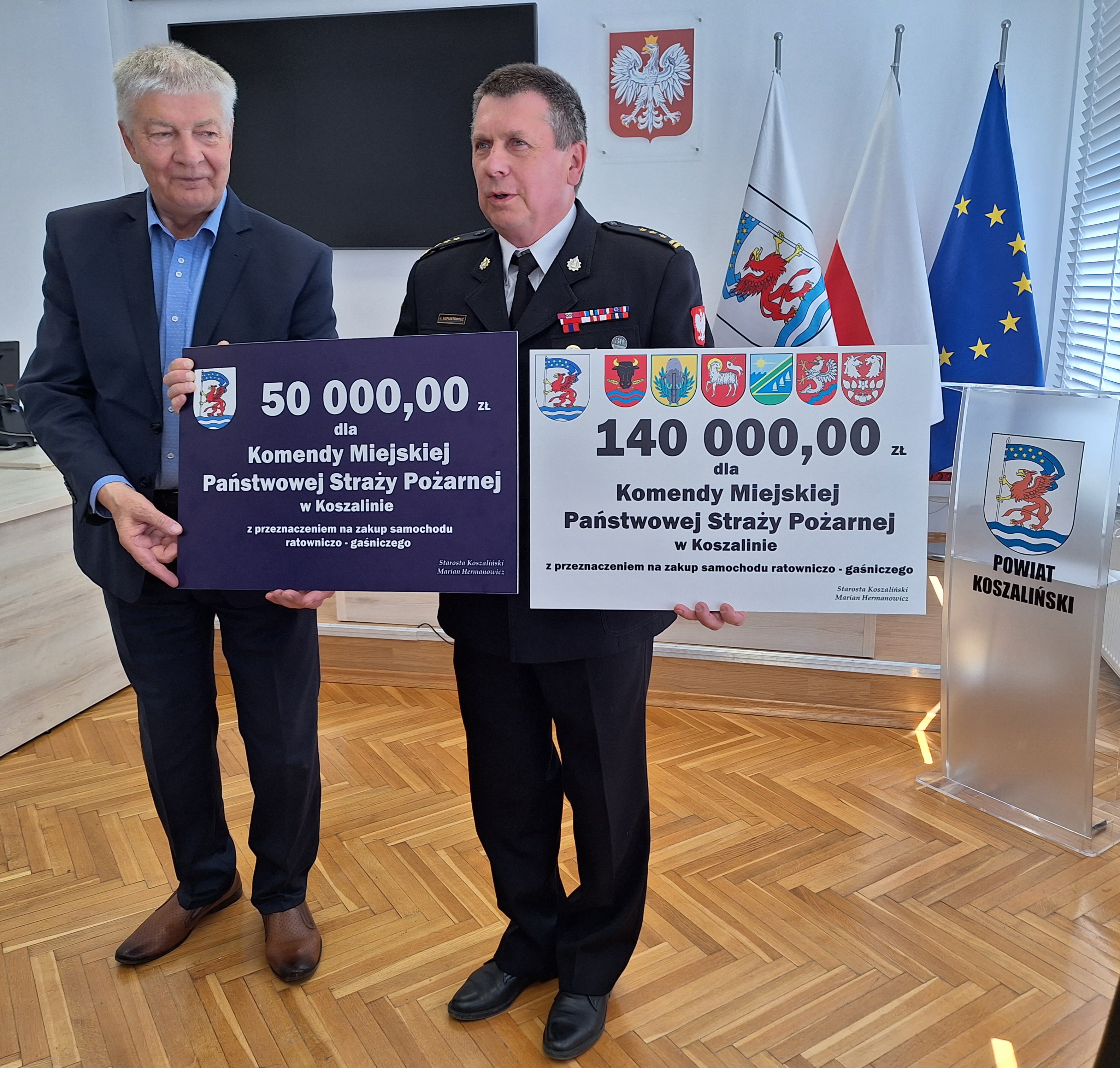 12 maja 2023 r. odbyło się spotkanie Starosty Koszalińskiego Mariana Hermanowicza z Komendantem Państwowej Straży Pożarnej w Koszalinie – st. bryg. Jackiem Szpuntowiczem oraz Wójtami i Burmistrzami Gmin z terenu Powiatu Koszalińskiego, związane z udzieleniem dofinansowania w roku 2023 ze środków budżetu powiatu koszalińskiego przeznaczonych na ochronę środowiska w wysokości 50 000,00 zł – zakup inwestycyjny samochodu ratowniczo – gaśniczego oraz udzieloną dotacją na inwestycje i zakupy inwestycyjne realizowane na podstawie zawartych porozumień (umów) między jednostkami samorządu, tj. gmin: Będzino, Biesiekierz, Bobolice, Mielno, Sianów, Świeszyno, Powiatem Koszalińskim w łącznej wysokości 140 000,00 zł dla Państwowej Straży Pożarnej w Koszalinie.