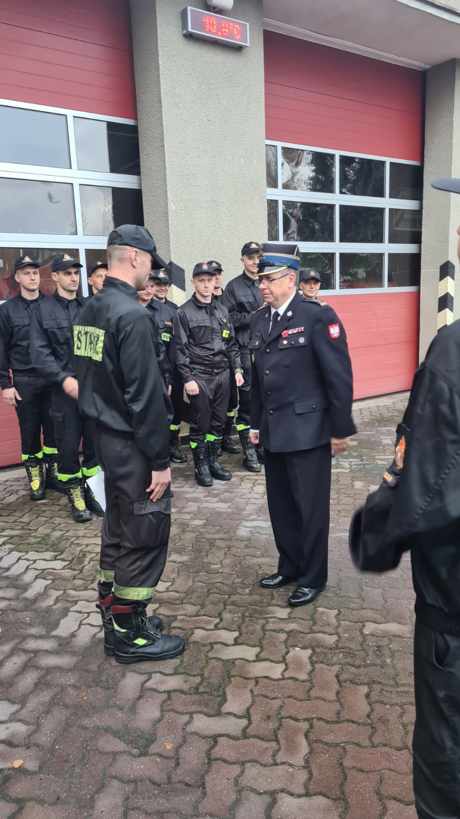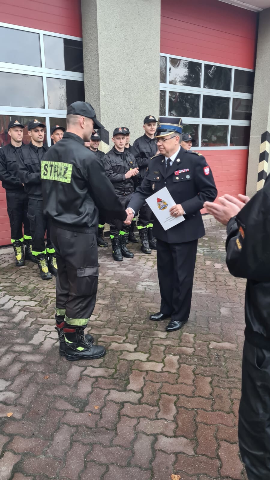 22 października br. około godz. 7.40 Pan asp. sztab. Mariusz Nazar, jadąc na służbę do Jednostki Ratowniczo-Gaśniczej Nr 2 w Koszalinie na ul. Gnieźnieńskiej był świadkiem dramatycznego zdarzenia. Młody mężczyzna przechodząc przez przejście dla pieszych zatrzymał się, a następnie ugodził się nożem w szyję. Funkcjonariusz zatrzymał auto, zabezpieczył miejsce zdarzenia i udzielił pierwszej pomocy poszkodowanemu: zatamował masywny krwotok zagrażający życiu, wezwał zespół ratownictwa medycznego oraz koordynował działania do czasu przyjazdu służb. Po konsultacji telefonicznej z członkami ratownictwa medycznego potwierdzono, że natychmiastowa reakcja i działania asp. sztab. Mariusza Nazara przyczyniły się do uratowania życia poszkodowanemu. Komendant Miejski PSP w Koszalinie st. bryg. Jacek Szpuntowicz podczas zmiany służbowej na JRG 2 dnia 10.11.2022r. wręczył dla asp. sztab. Mariusza Nazara nagrodę za uratowanie życia ludzkiego .