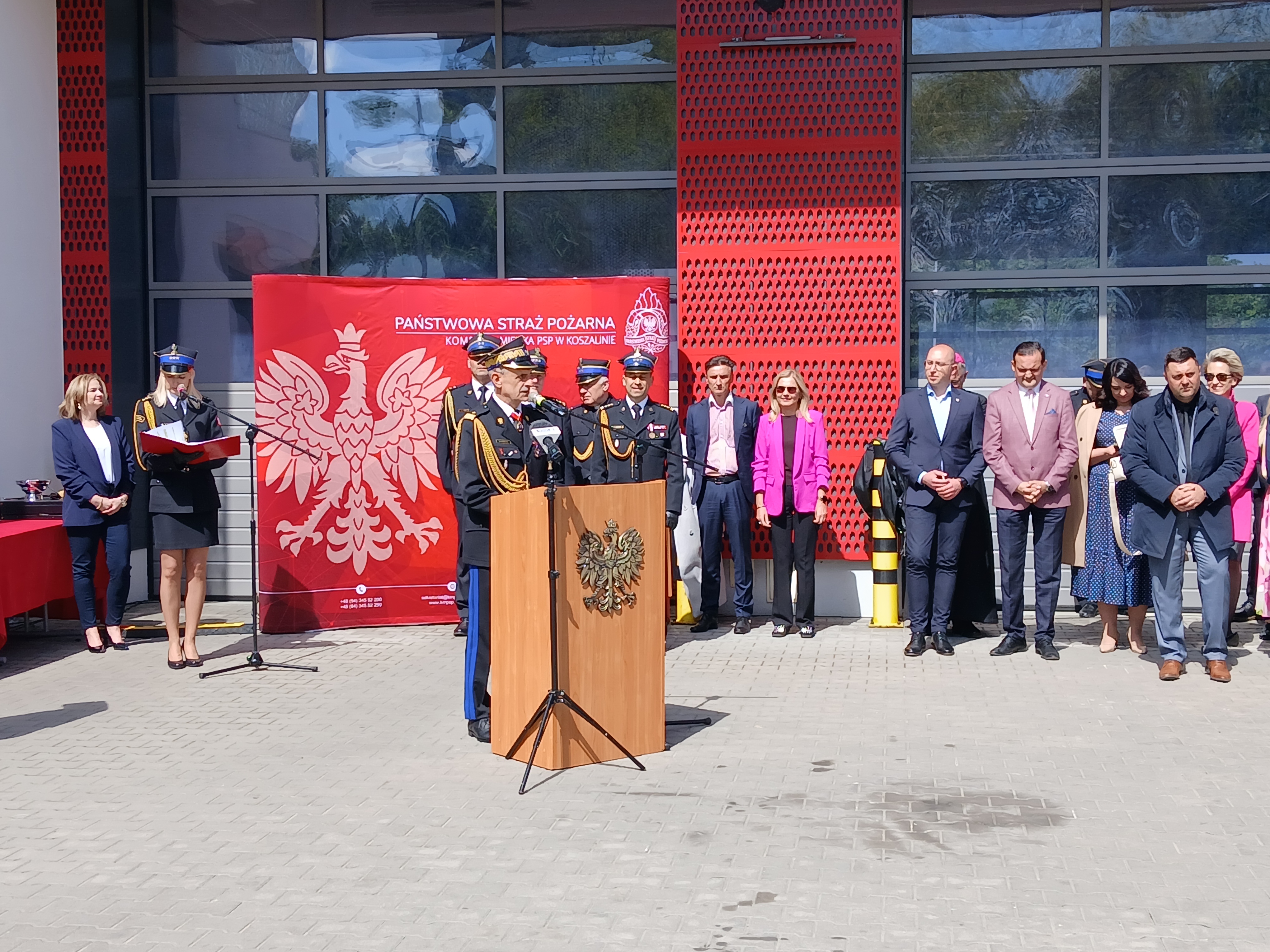 w Koszalinie, gdzie został złożony meldunek przez dowódcę uroczystości mł. bryg. Krzysztofa Gruchałę Zachodniopomorskiemu Komendantowi Wojewódzkiemu PSP. Następnie wprowadzono sztandar Komendy Miejskiej PSP w Koszalinie. Po odśpiewaniu hymnu państwowego Komendant Miejski PSP w Koszalinie st. bryg. Zygmunt Adamczyk przywitał przybyłych gości.