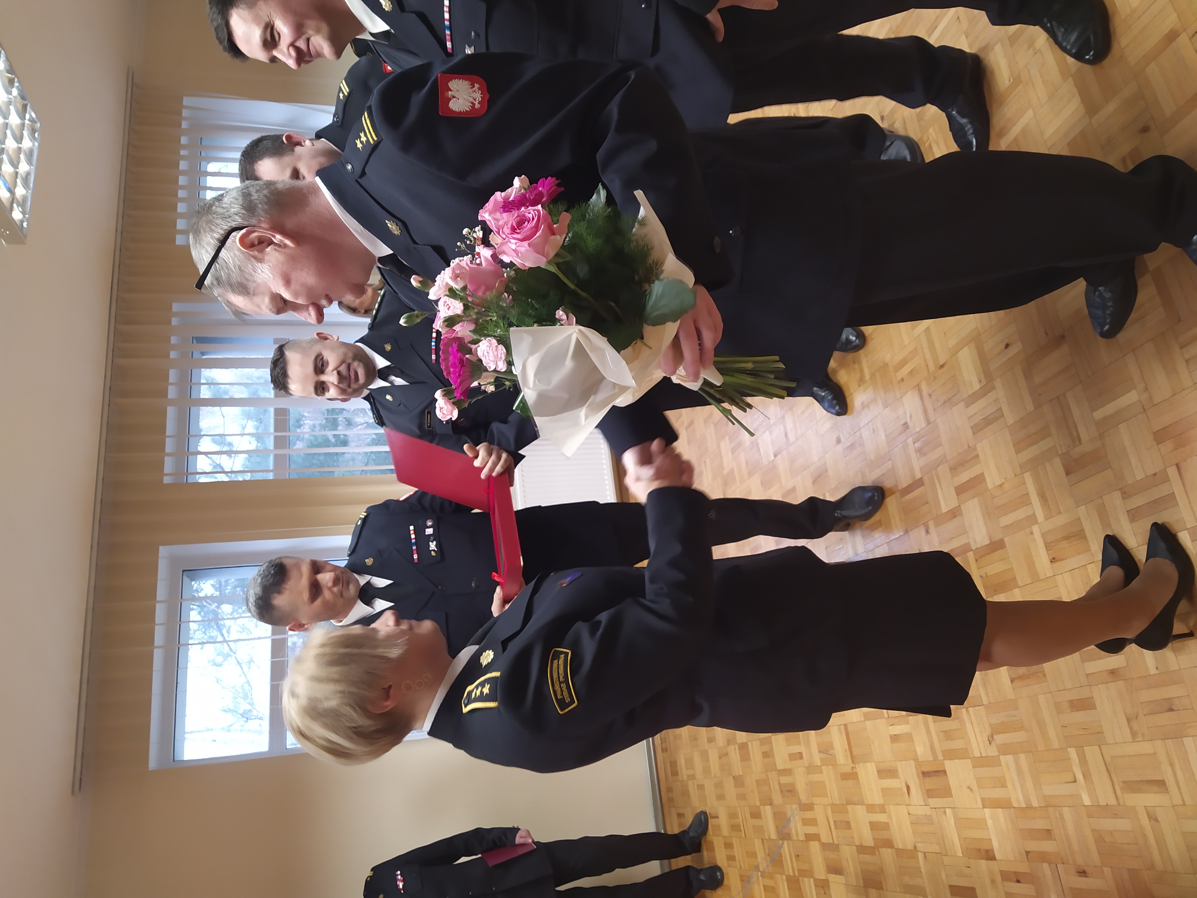 Odchodzącą funkcjonariuszkę żegnali p.o. komendanta miejskiego PSP w Koszalinie bryg. Zygmunt Adamczyk, funkcjonariusze, pracownicy cywilni tutejszej Komendy oraz przybyła delegacja z Komendy Powiatowej PSP w Kamieniu Pomorskim.