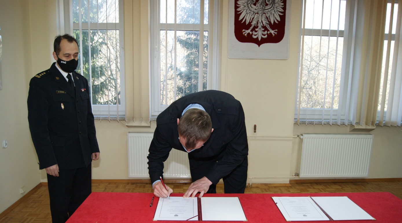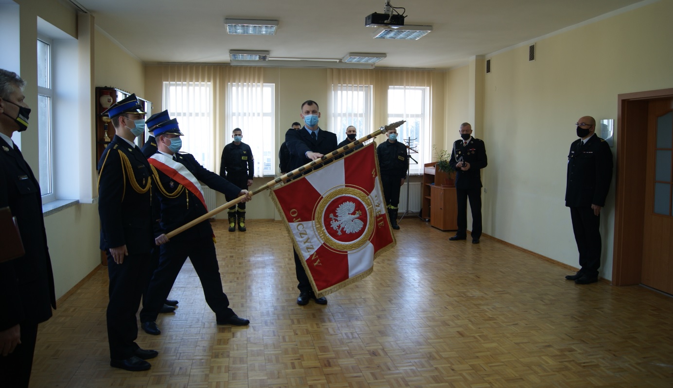 05 marca 2021 w świetlicy Komendy Miejskiej Państwowej Straży Pożarnej w Koszalinie odbyła się uroczysta zbiórka, podczas której, w obecności przełożonych oraz kadry komendy, str. Łukasz Szkołuda złożył ślubowanie na sztandar KM PSP w Koszalinie i z rąk st. bryg. Mirosława Pendera komendanta miejskiego PSP w Koszalinie odebrał akt ślubowania.