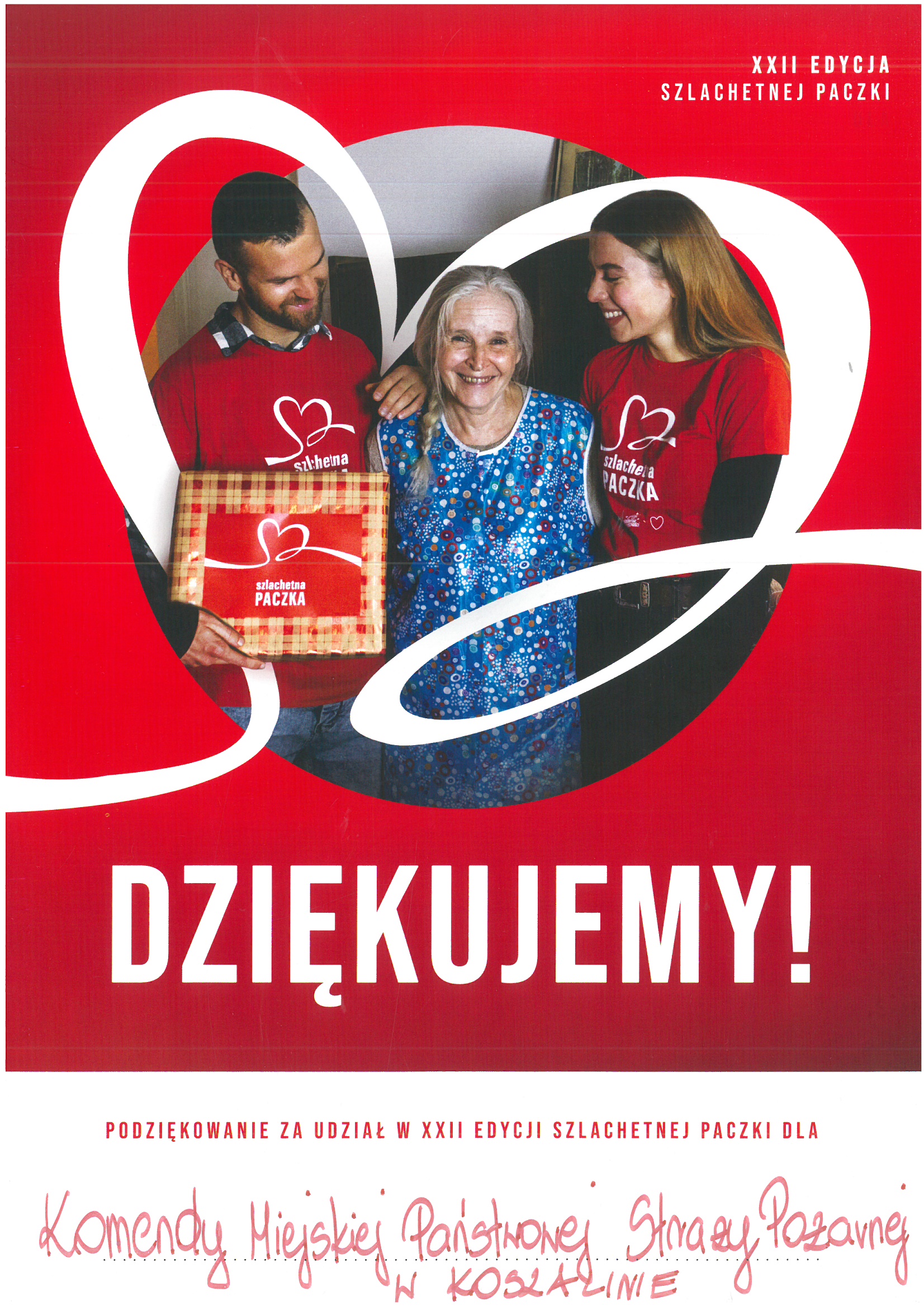 09.12.2022 funkconariusze oraz pracownicy cywilni Komendy Miejskiej PSP w Koszalinie (JRG1, JRG2, KM PSP, mł. bryg. w st. spocz. Piotr Skrzypiński oraz Pani Jadwiga Wasiak) przygotowali dary w ramach akcji Szlachetna Paczka. Dary zostały przekazanie do centrum dystrybucji, gdzie następnie wybrana rodzina w potrzebie zostanie nimi obdarowana. Potrzeby zostały zweryfikowane przez wolontariuszy Szlachetnej Paczki oraz przekazane w ich obecności.