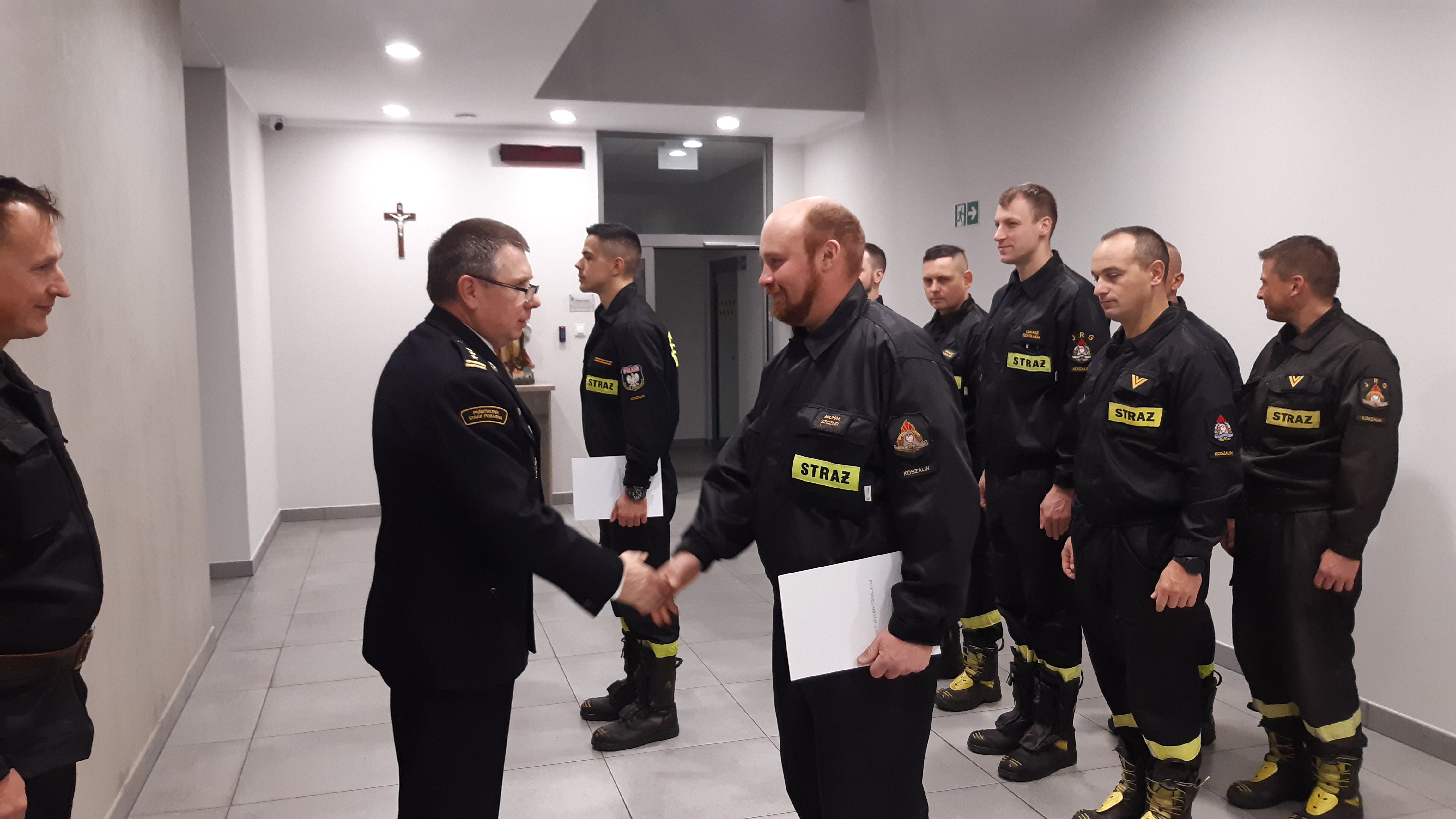w Koszalinie st. bryg. Jacek Szpuntowicz wręczył decyzję Komendanta Głównego PSP, o przyznanej nagrodzie za udział w misji zagranicznej we Francji sekc. Bartoszowi Babireckiemu.