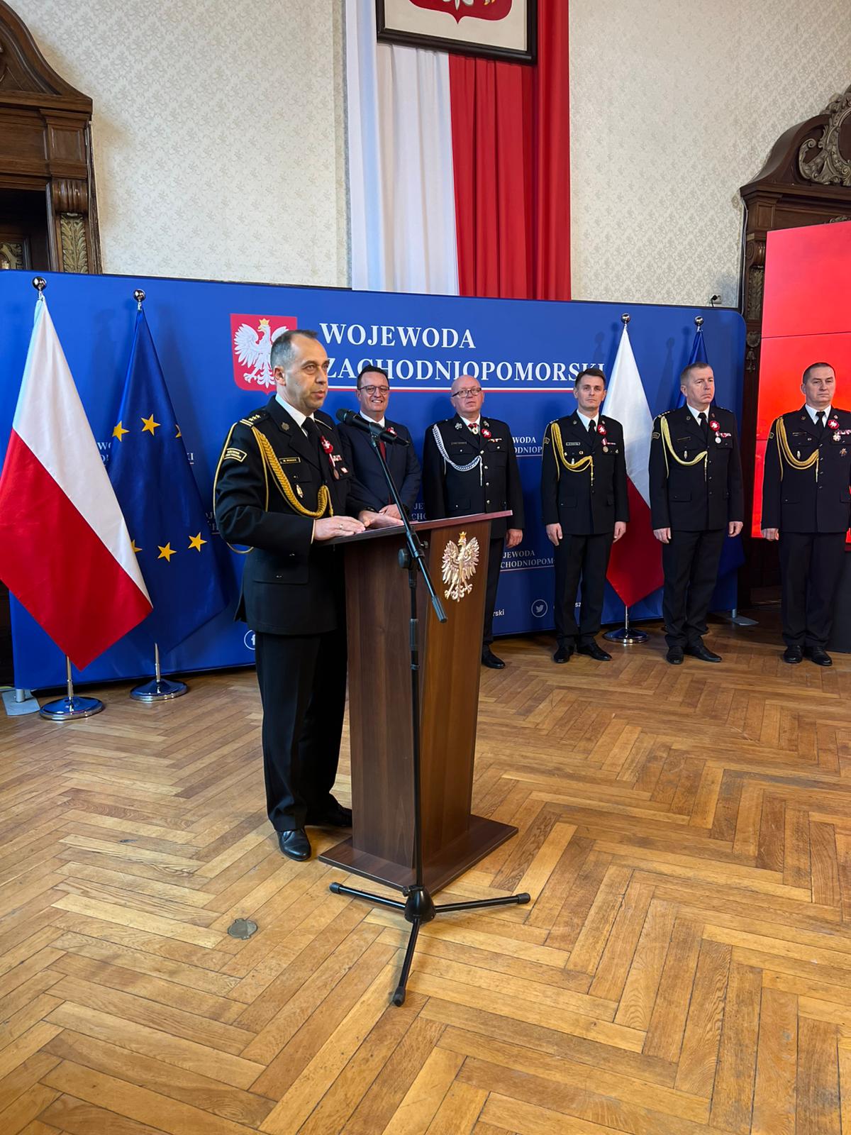 15 listopada 2024 r. w Sali Rycerskiej Zachodniopomorskiego Urzędu Wojewódzkiego odbył się uroczysty apel z okazji Narodowego Święta Niepodległości, podczas którego funkcjonariuszom Państwowej Straży Pożarnej zostały wręczone nagrody, odznaczenia, wyróżnienia oraz awanse na wyższe stopnie służbowe. W uroczystości udział wzięli: Wojewoda Zachodniopomorski Adam Rudawski, członek Zarządu Województwa Zachodniopomorskiego Bogdan Jaroszewicz, Wiceprezes Zarządu Wojewódzkiego ZOSP RP Województwa Zachodniopomorskiego dh Paweł Trzaskoś, Zachodniopomorski Komendant Wojewódzki Państwowej Straży Pożarnej st. bryg. Mirosław Pender wraz z zastępcami, komendanci miejscy i powiatowi PSP oraz funkcjonariusze i pracownicy cywilni woj. zachodniopomorskiego.