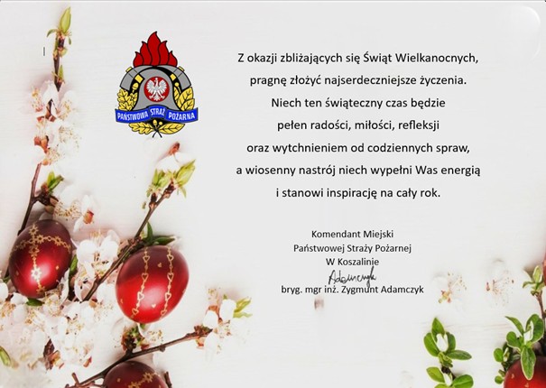 Życzenia Wielkanocne Komendanta Miejskiego PSP w Koszalinie 2025 17.04.2025 Życzenia Wielkanocne Komendanta Miejskiego PSP w Koszalinie 2025 Zdjęcia (1) Pokaż zdjęcie 1 z galerii.