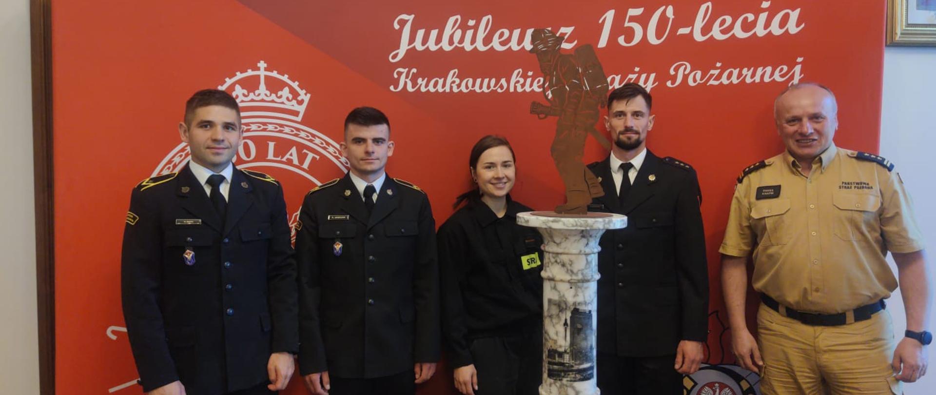 01.06.2023 KM PSP KrakówSpotkanie Komendanta Miejskiego z mistrzami europy w biegach po schodach w umundurowaniu specjalnym