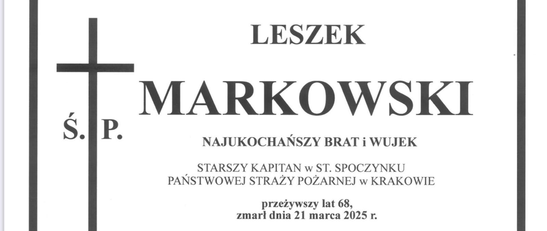 26.03.2025 KM PSP KrakówZmarł Ś.p. Leszek Markowski dawny zastępca dowódcy JRG nr 6 w KrakowieInformujemy, że na wieczną służbę odszedł były zastępca dowódcy JRG 6 Kraków . Starszy kapitan w stanie spoczynku Leszek Markowski.