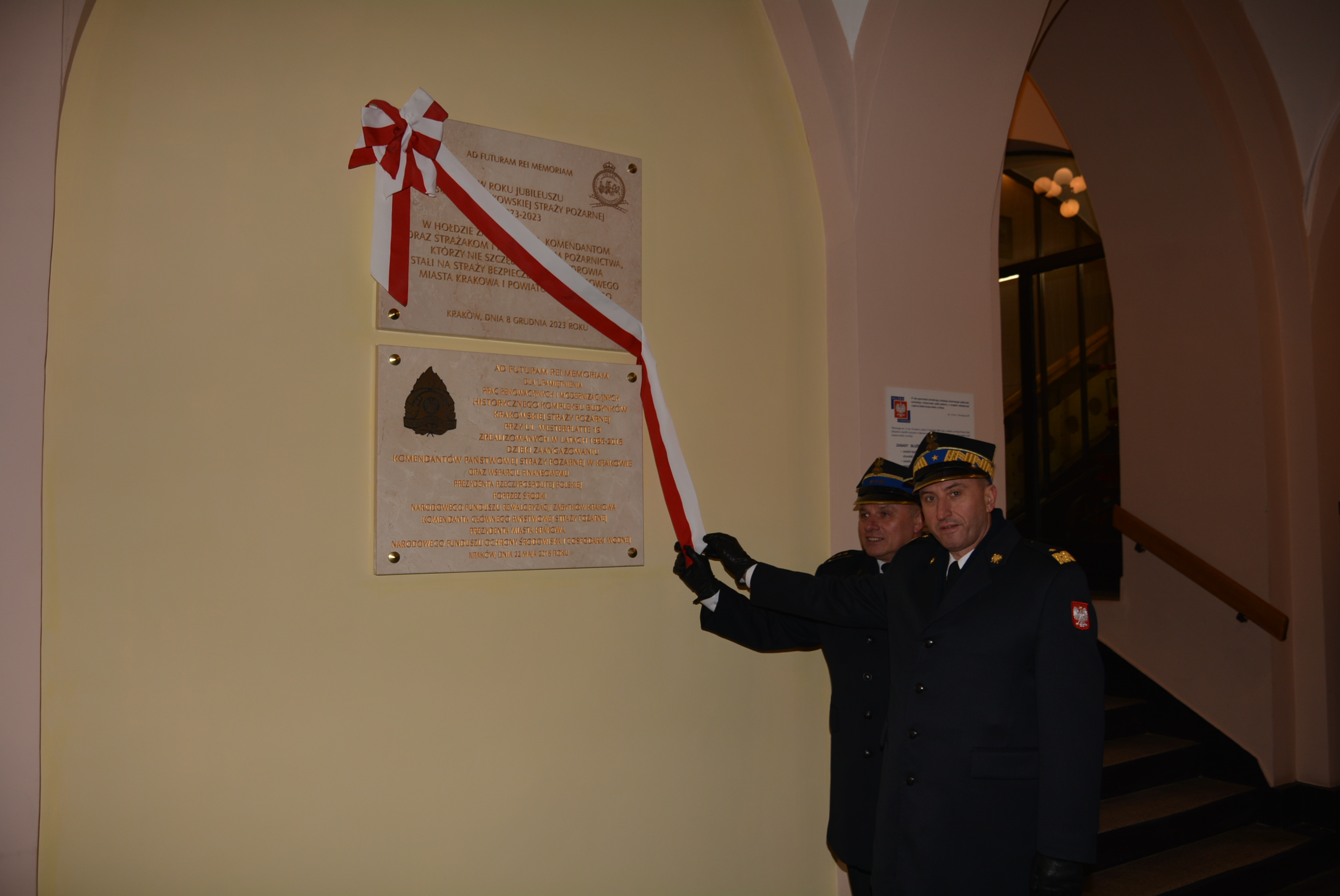 W trakcie uroczystości odsłonięto również tablicę pamiątkową z okazji obchodów 150-lecia istnienia Krakowskiej Straży Pożarnej.