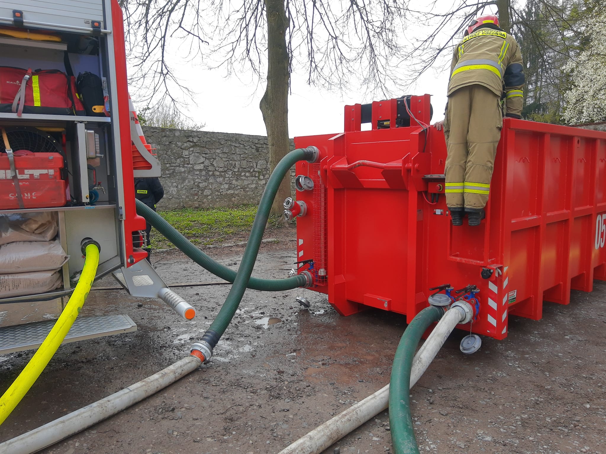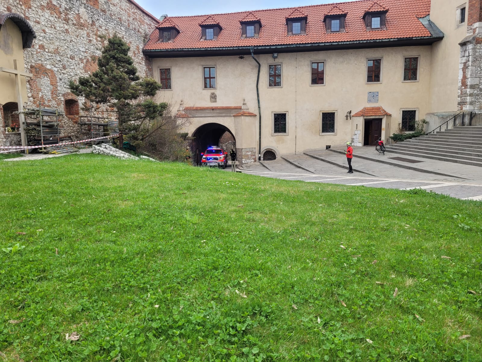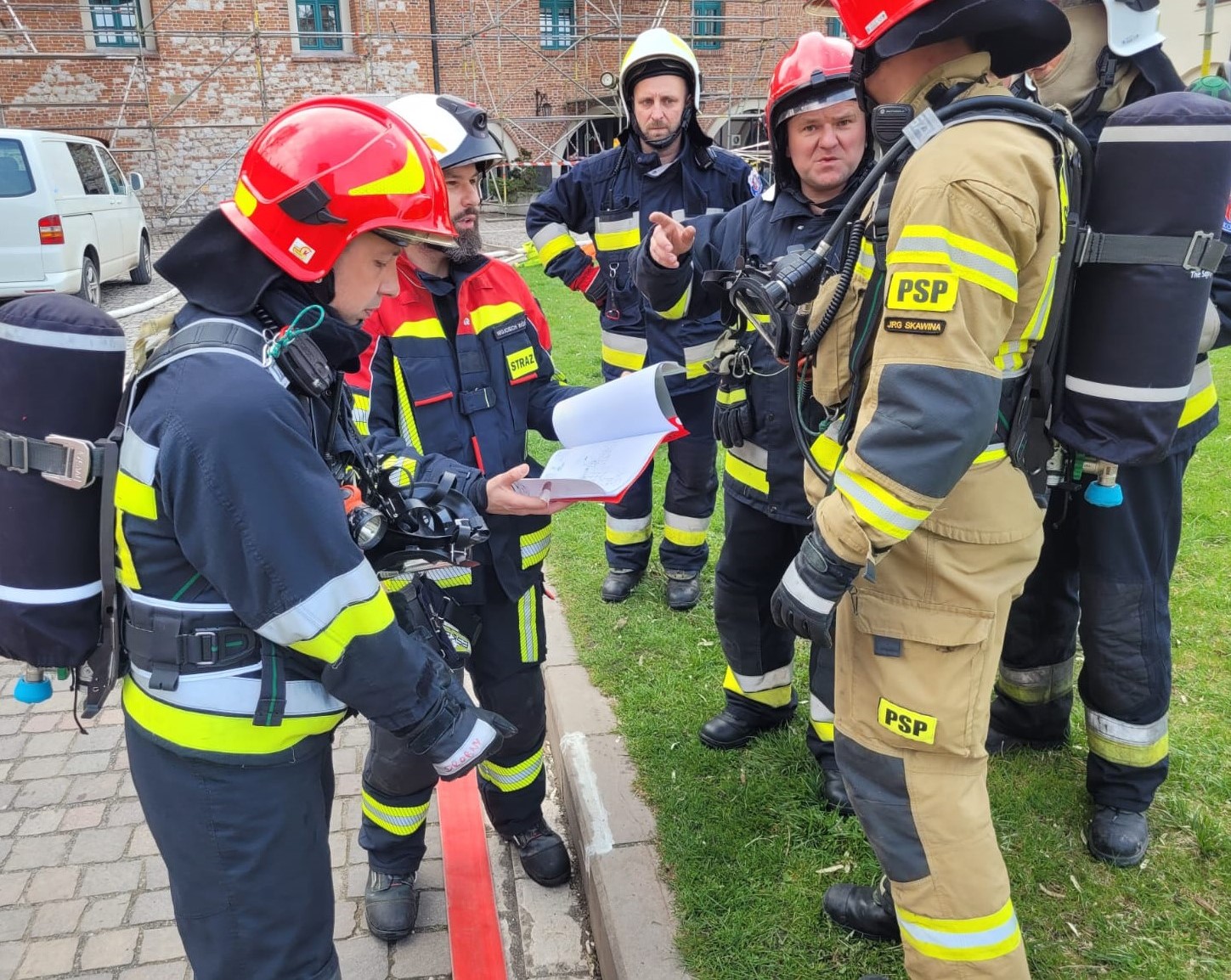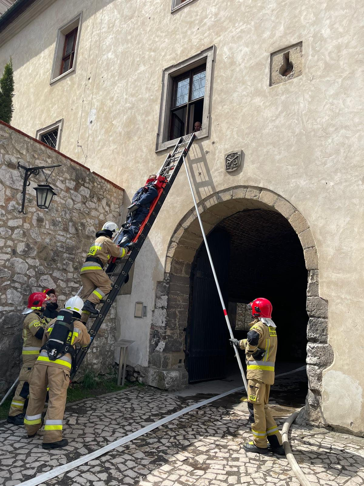 Ćwiczenia ratowniczo -gaśnicze i ratownicze na terenie opactwa Benedyktynów w Tyńcu.