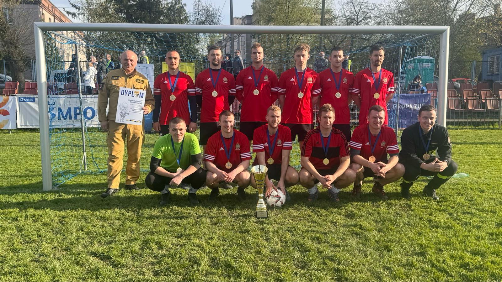 Krakowscy strażacy zdobywają pierwsze miejsce na turnieju piłkarskim o puchar PMK.