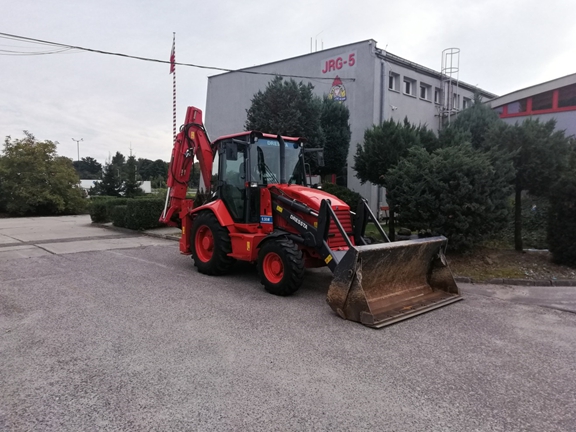 Ładowarko-koparka DRESSTA 9,50M - koparko-ładowarka marki Dressta o napędzie 4x4 przeznaczona do działań przeciwpowodziowych, wsparcia działań gaśniczych oraz pomocy podczas zdarzeń na drogach. Dodatkowo koparka posiada następujące wyposażenie opcjonalne: młot hydrauliczny, norzyce wyburzeniowe, urządzenie do napełniania worków z piaskiem, chwytak do balotów słomy, wiertnicę, łyżkę wieloczynnościową, widły paletowe oraz pług do śniegu. Koparko – ładowarka została wyprodukowana w 2015 roku.
