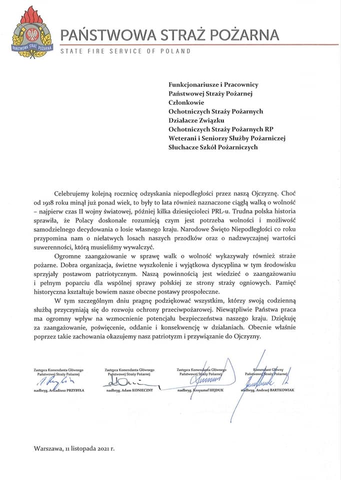 Z okazji obchodów Narodowego Święta Niepodległości, oraz Dnia Służby Cywilnej Prezes Rady Ministrów p.Mateusz Morawiecki skierował list okolicznościowy do pracowników cywilnych ochrony przeciwpożarowej oraz funkcjonariuszy PSP i OSP. Swoje życzenia przekazali również Szef Obrony Cywilnej kraju oraz Komendant Główny Państwowej Straży Pożarnej.