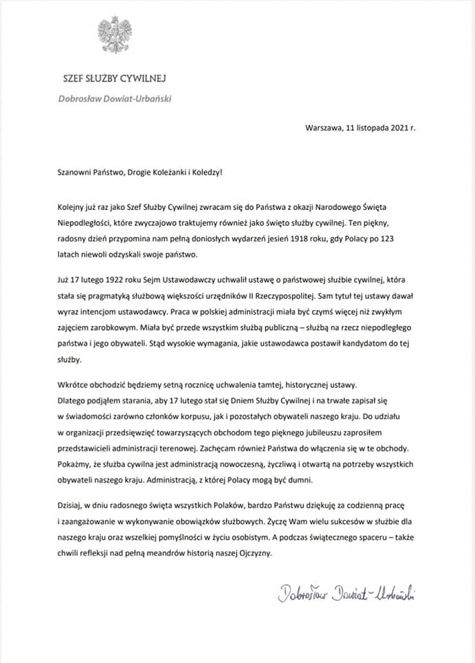 Listy okolicznościowe i życzenia z okazji Narodowego Święta Niepodległości , oraz Dnia Służby Cywilnej.