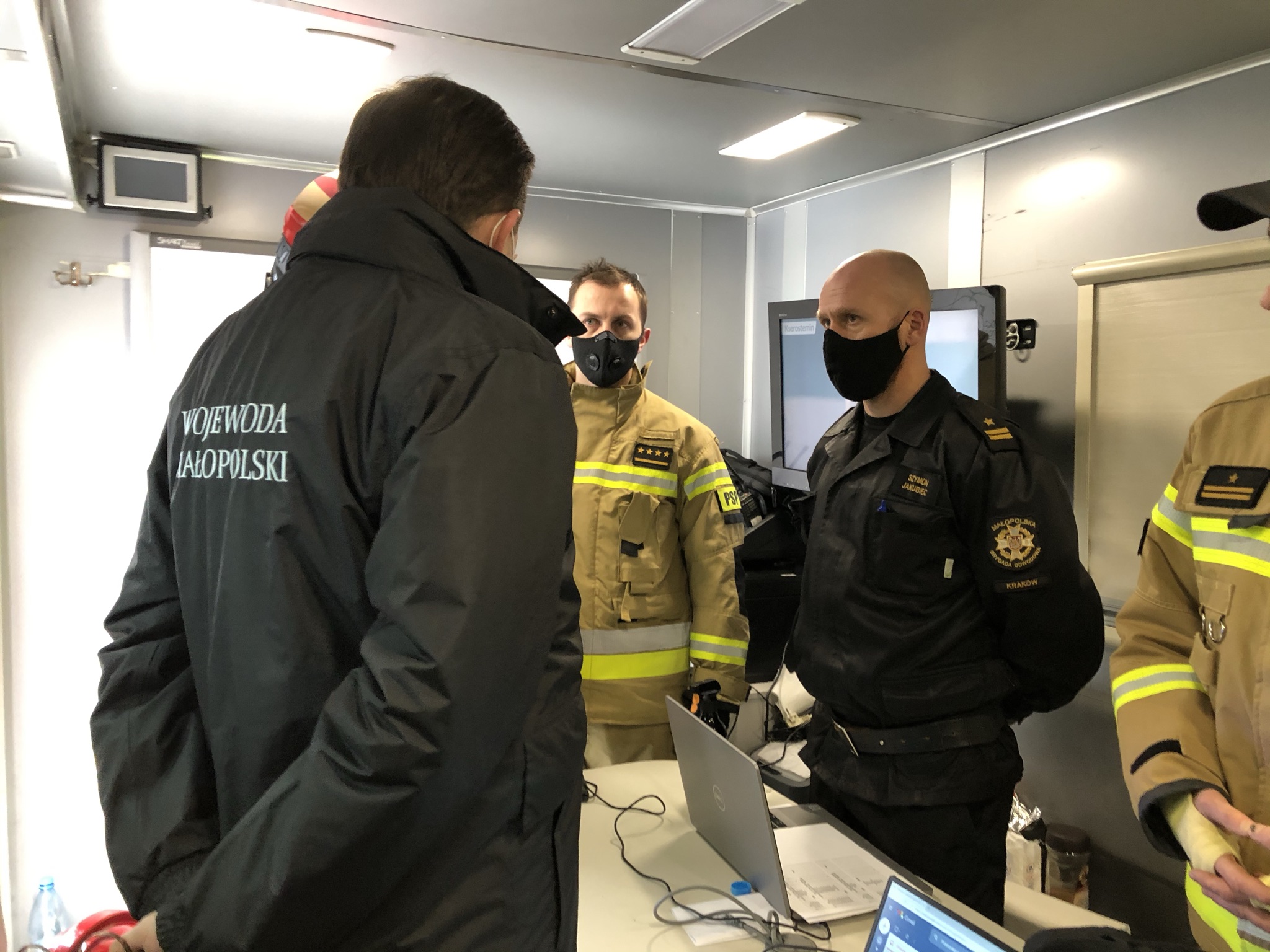 z młotem burzącym. Po porannej odprawie sztabu operacyjnego, i konsultacji z Inspektorem Nadzoru Budowlanego działaniami dowodzi Małopolski Komendant Wojewódzki st.bryg. Piotr Filipek, do pracy w sztabie zostali włączeni oficerowie Wydziału Operacyjnego Komendy Wojewódzkiej PSP w Krakowie. O Godzinie 12.00 odbył się briefing prasowy z udziałem rzecznika prasowego Komendy Wojewódzkiej PSP oraz przedstawiciela Urzędu Miasta Krakowa. Na miejscu wizytował również WOjewoda Małopolski Łukasz Kmita, który uczestniczył w wizji lokalnej