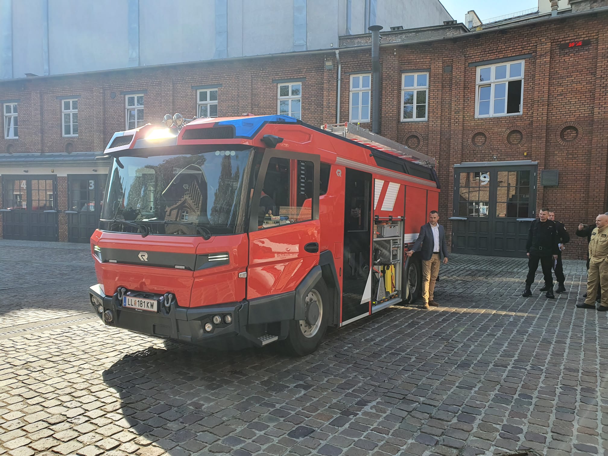 1 października br. w Komendzie Miejskiej PSP w Krakowie odbyła się prezentacja pojazdu ratowniczo - gaśniczego z napędem elektrycznym producenta Rosenbauer. Na początku przedstawiono prezentację multimedialną w sali konferencyjnej, aby kolejno po niej przejść do pokazu praktycznych możliwości prezentowanego pojazdu.