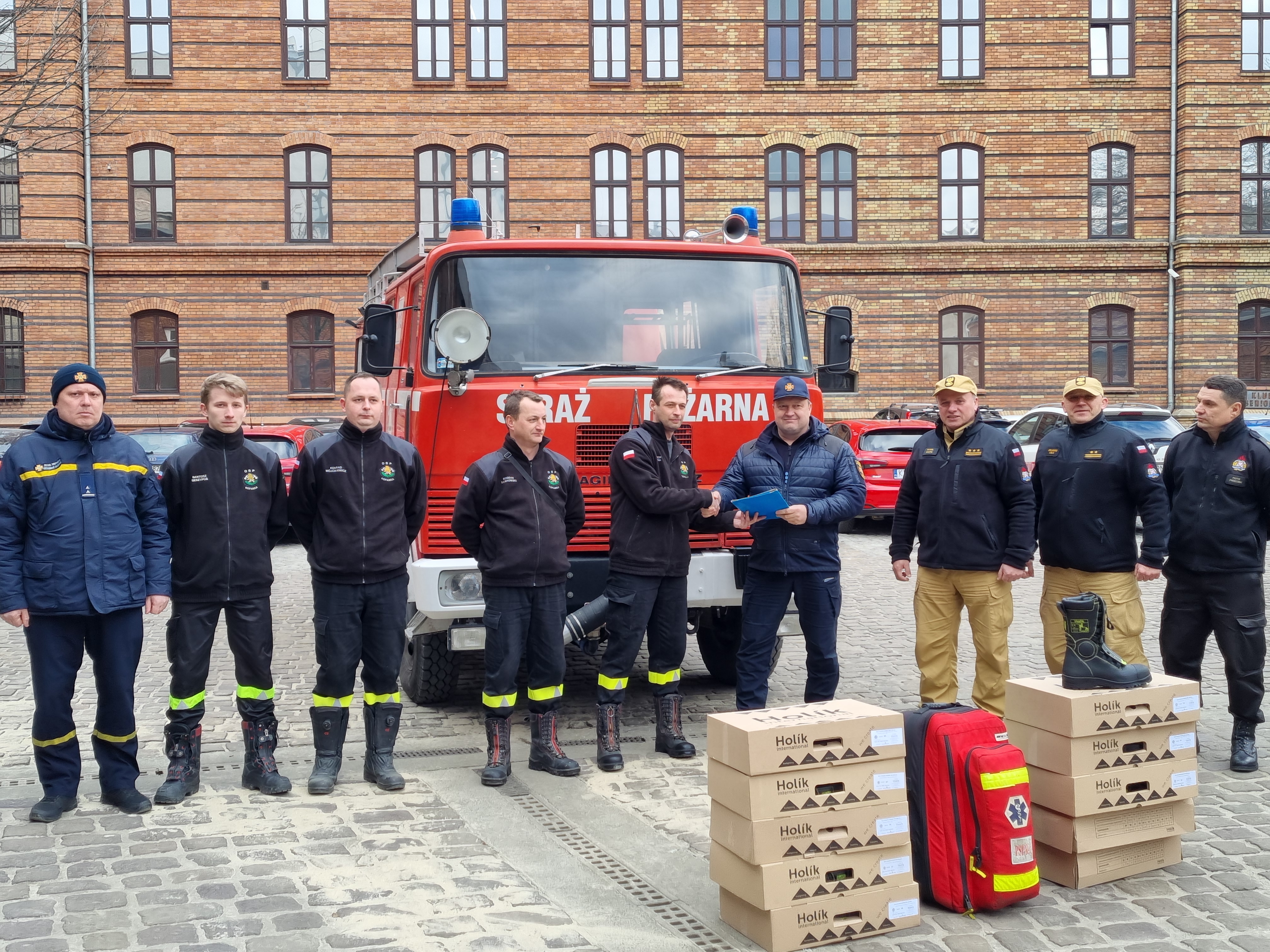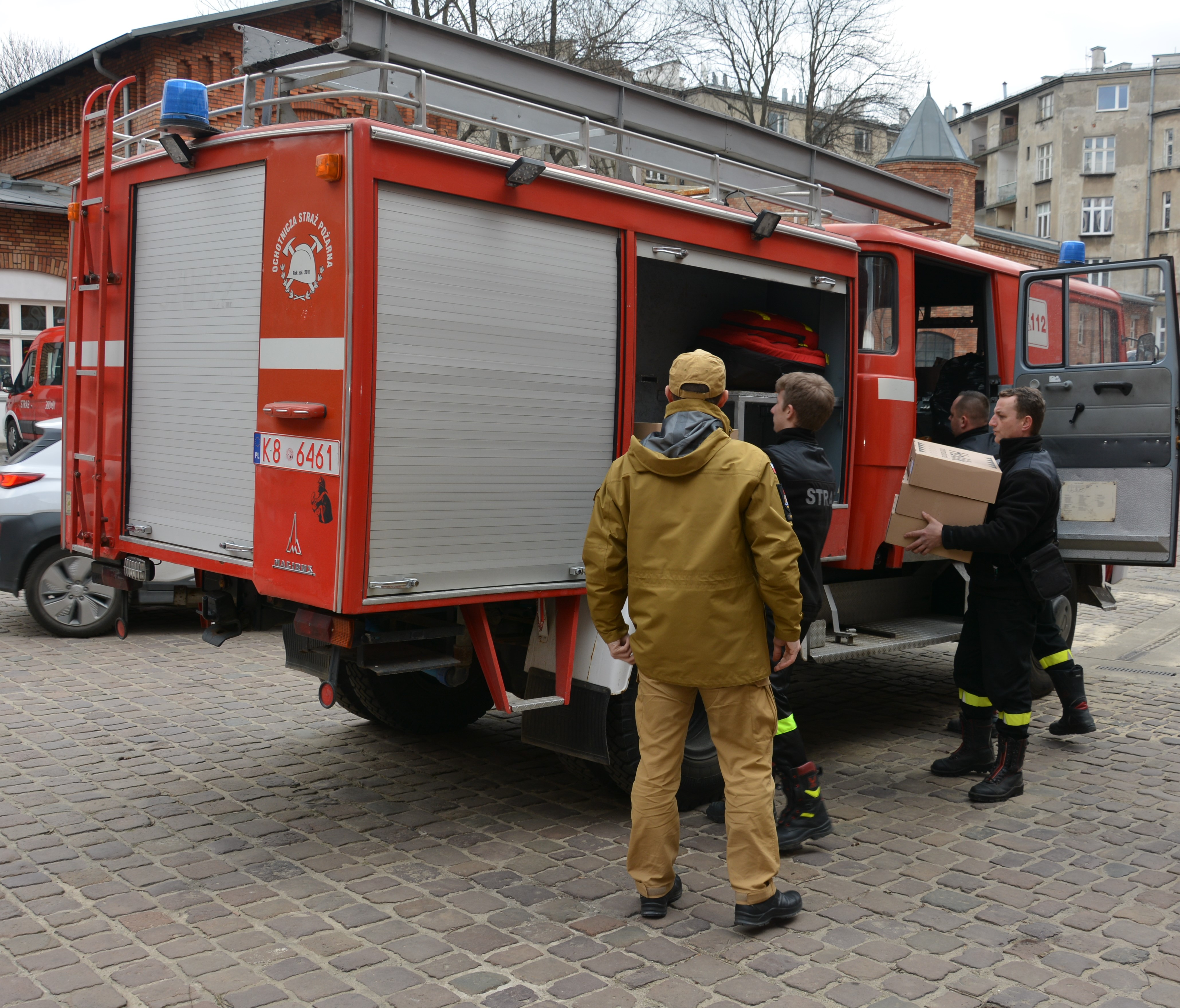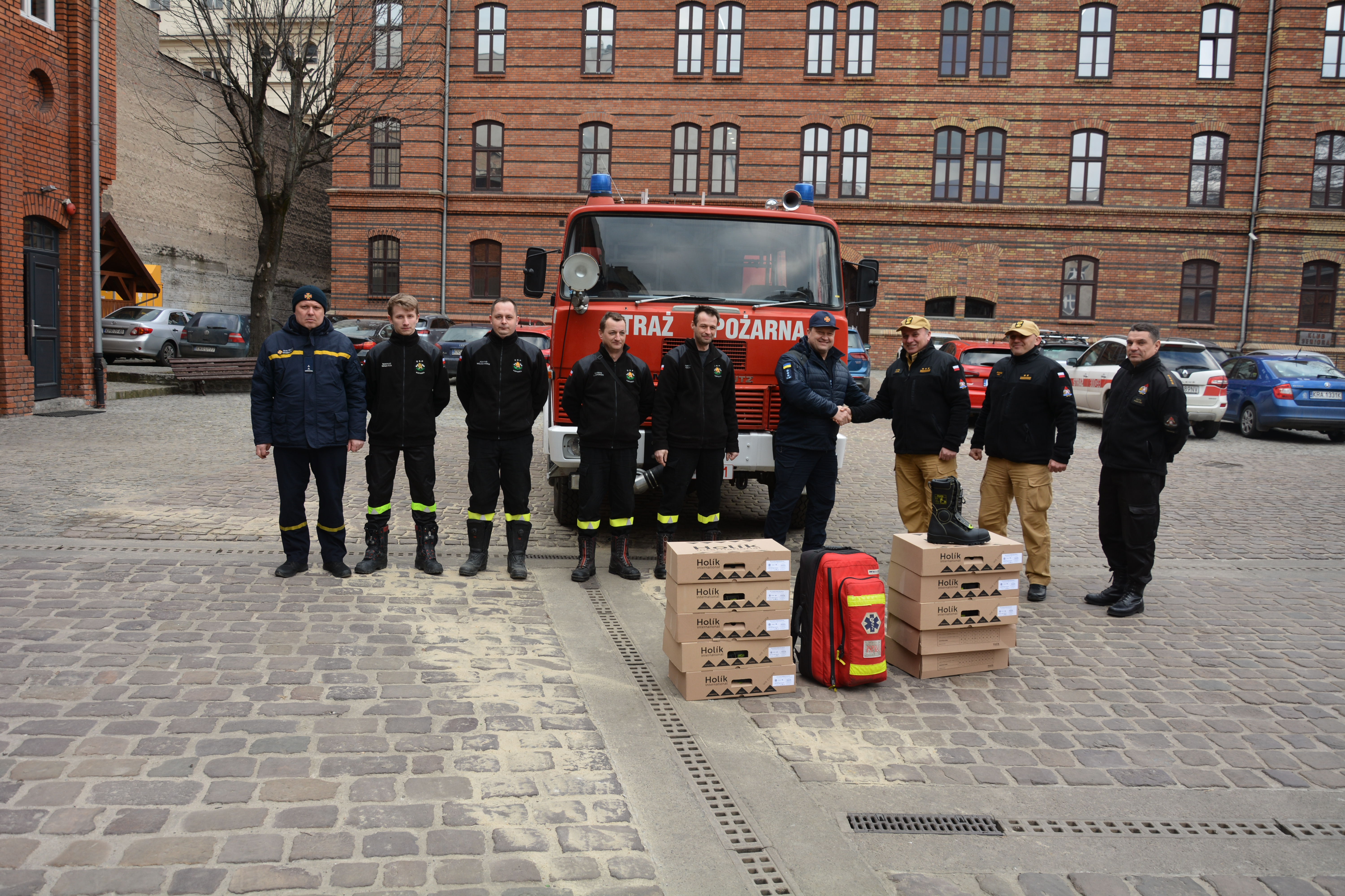 Komendant Miejski PSP w Krakowie st.bryg. Paweł Knapik dodatkowo przekazał kilkanaście kompletów nowego obuwia specjalnego strażaka i mobilny plecak medyczny.