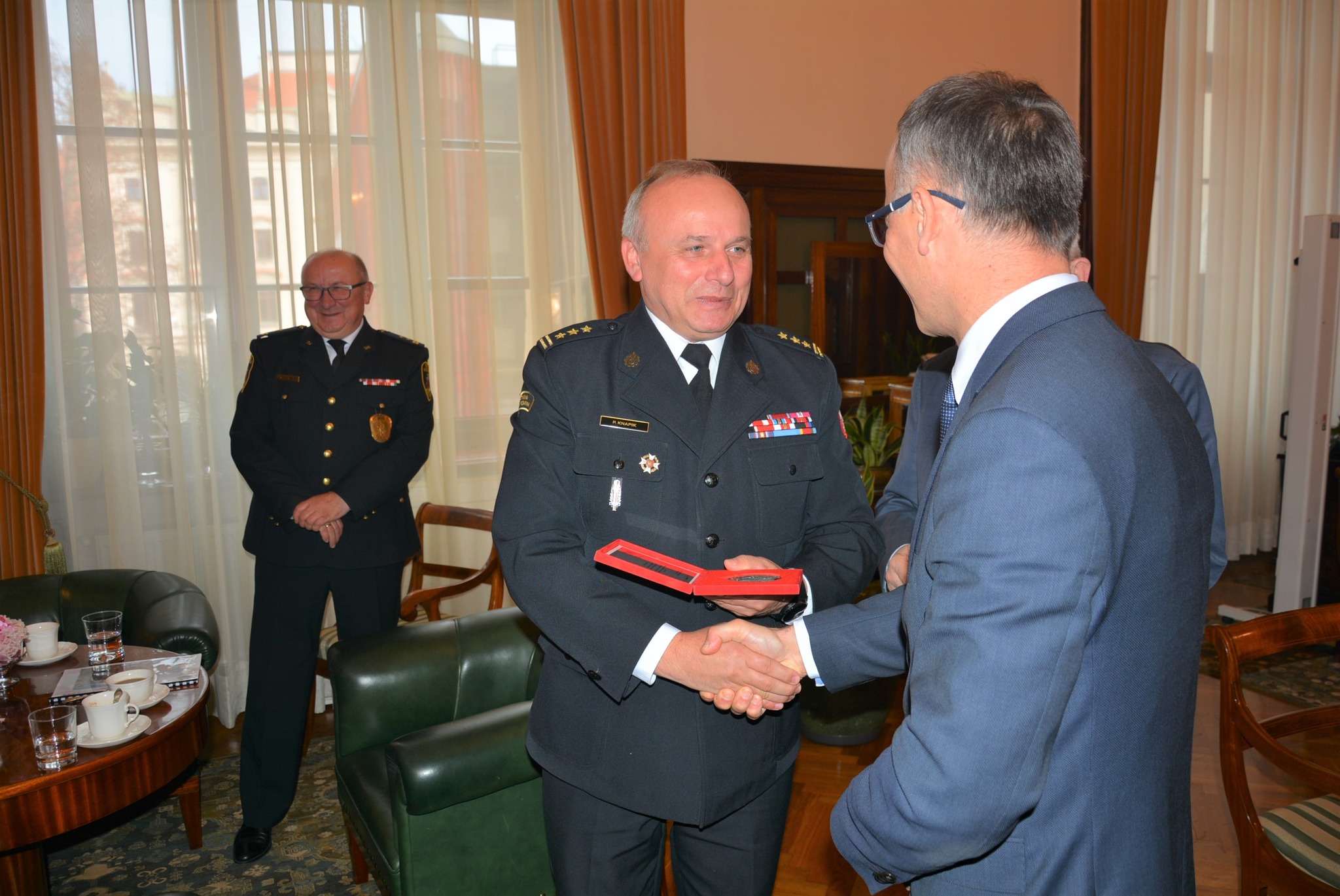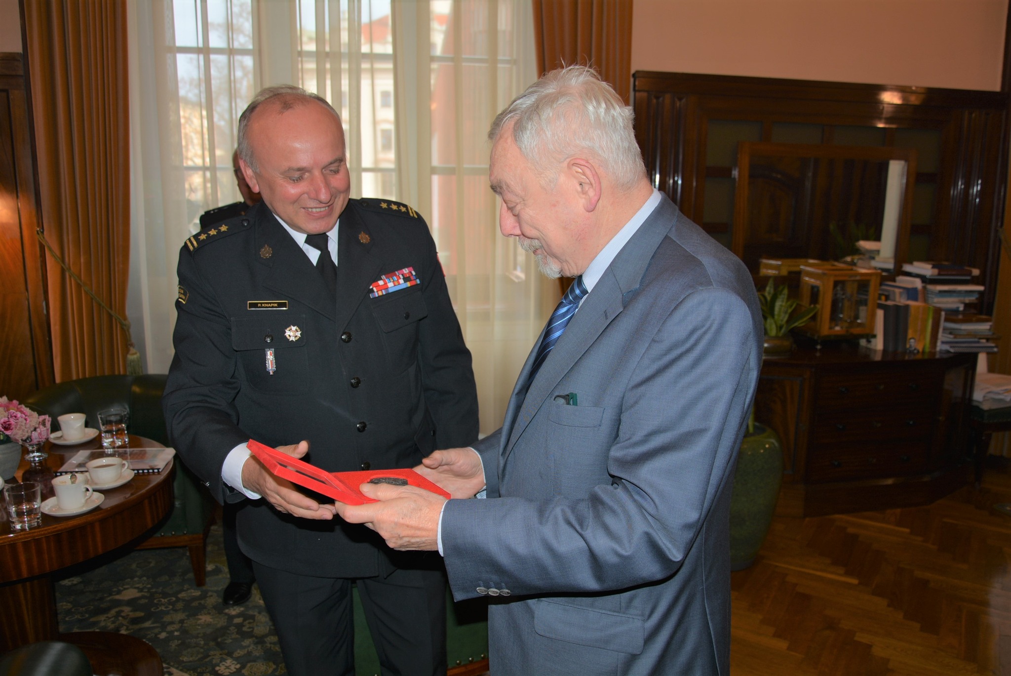 Spotkanie, którego celem było omówienie transformacji Państwowej Straży Pożarnej w okresie jej 30-letniego istnienia, przebiegło w uroczystej atmosferze. Na koniec Pan st. bryg. Paweł Knapik złożył podziękowania na ręce Pana prof. Jacka Majchrowskiego - Prezydenta Miasta Krakowa za dotychczasowe wsparcie i okazywaną pomoc, w szczególności w zakresie dofinansowania przedsięwzięć sprzętowych i inwestycji budowlanych. Symbolicznym podziękowaniem było wręczenie okolicznościowego medalu wybitego z okazji Jubileusz 30-lecia uchwalenia ustawy o Państwowej Straży Pożarnej. Pamiątkowe medale jako wyraz wdzięczności za okazywaną życzliwość i wsparcie otrzymali również Pan Antoni Fryczek – Sekretarz Miasta Krakowa oraz Pan Bogdan Klimek – Dyrektor Wydziału Bezpieczeństwa i Zarządzania Kryzysowego Urzędu Miasta Krakowa.