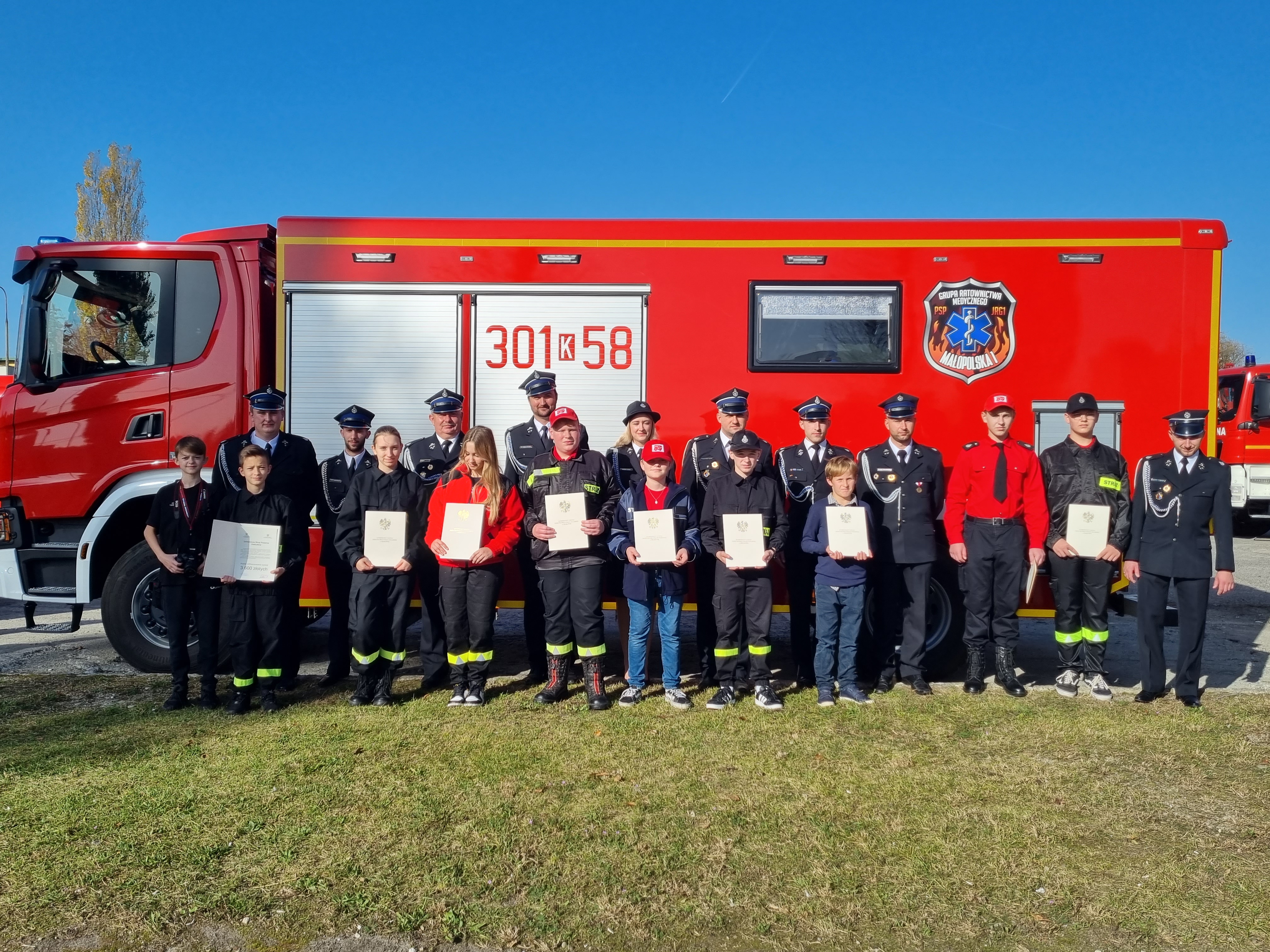 Promesy finansowe przekazanych przez MSWiA i KG PSP na zakup wyposażenia i sprzętu dla Młodzieżowych Drużyn Pożarniczych działających przy jednostkach Ochotniczych Straży Pożarnych wręczyli m.in. Wicemarszałek Sejmu RP Ryszard Terlecki, Wojewoda Małopolski p. Łukasz Kmita, Wicemarszałek Województwa małopolskiego p. Łukasz Smółka, Małopolski Komendant Wojewódzki PSP nadbryg. Piotr Filipek, Komendant Miejski PSP w Krakowie st.bryg. Paweł Knapik, Komendant Powiatowy PSP w Miechowie mł.bryg. Michał Majda.