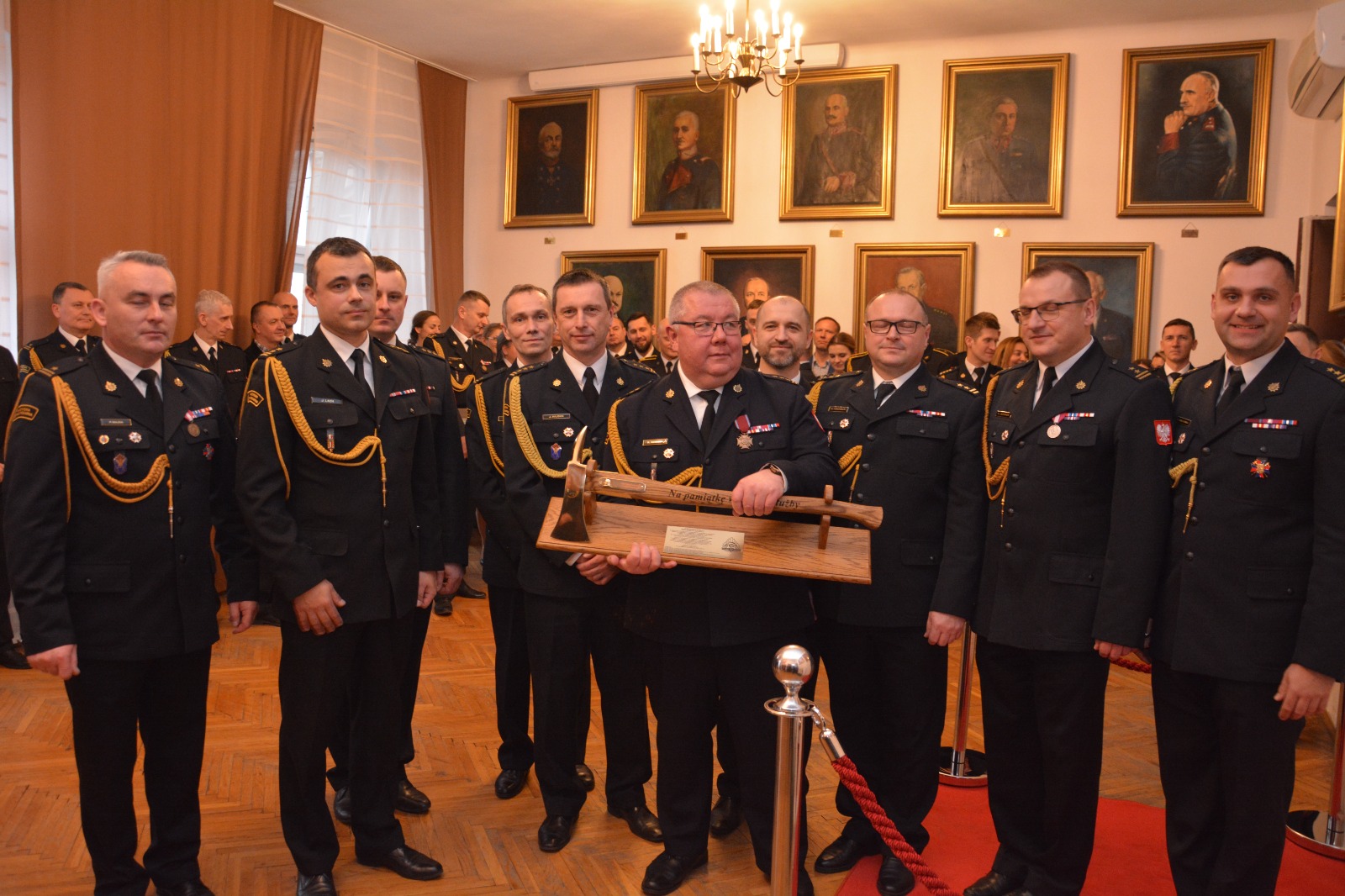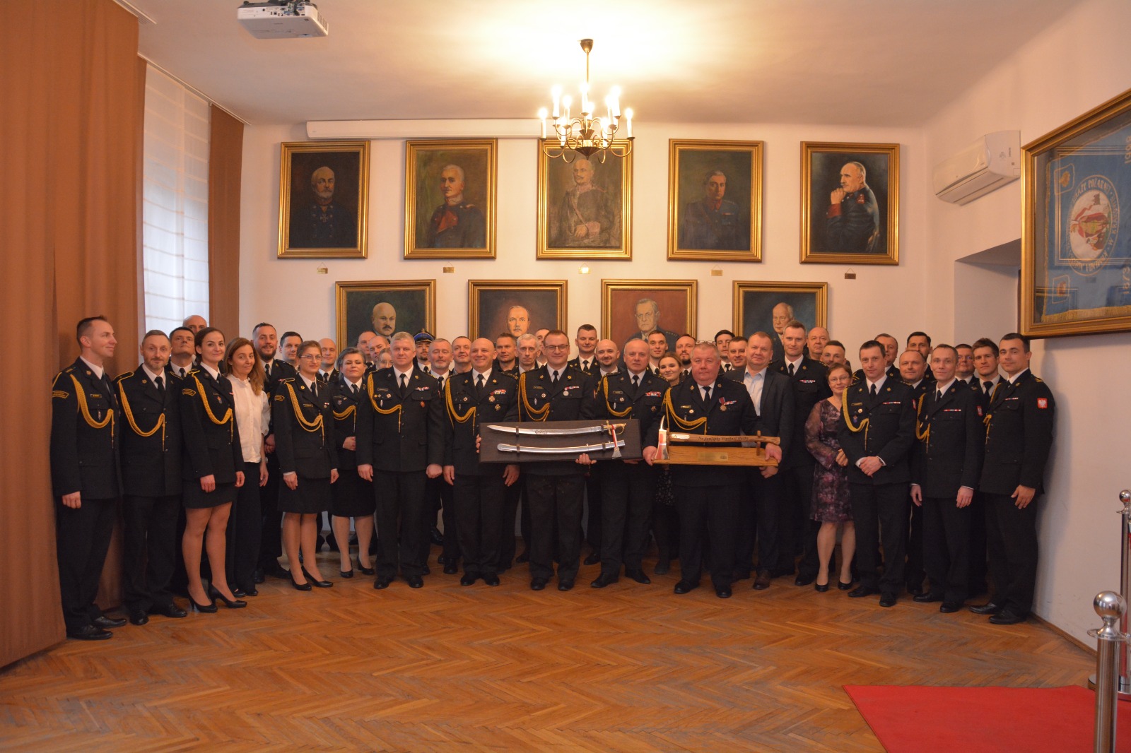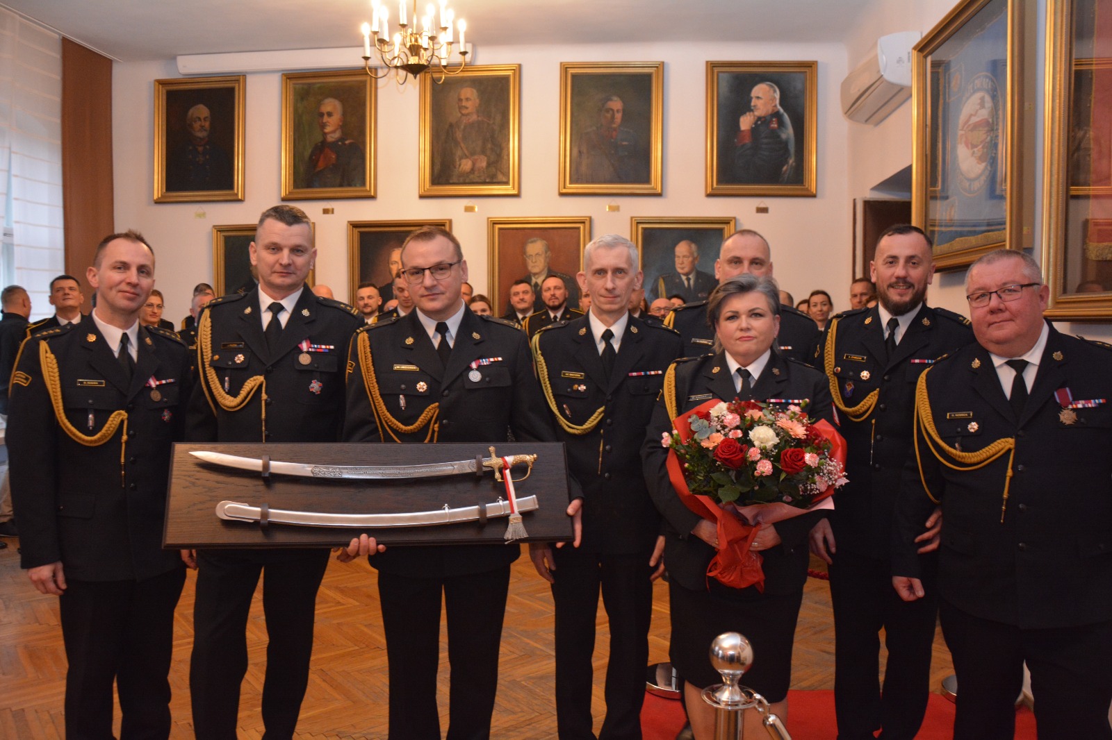 Uroczysta zbiórka z okazji przejścia na zaopatrzenie emerytalne oficerów KM PSP w Krakowie.