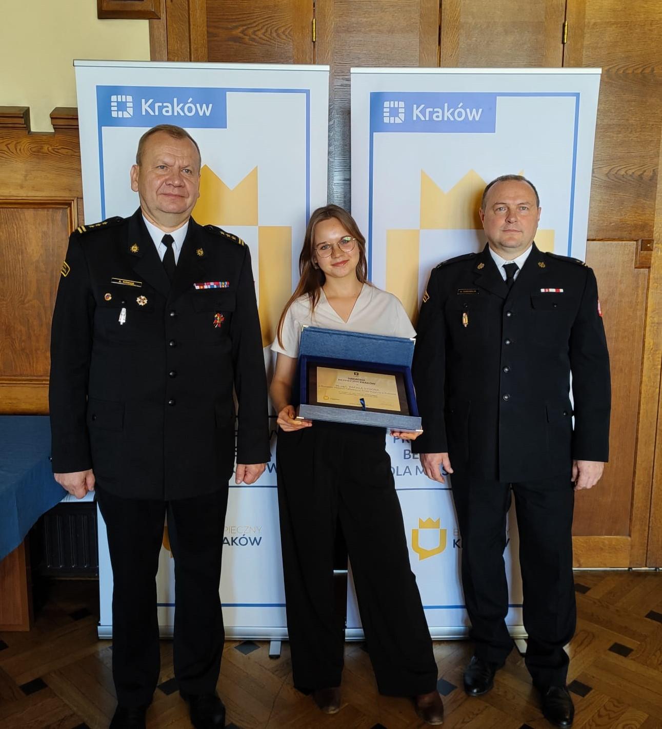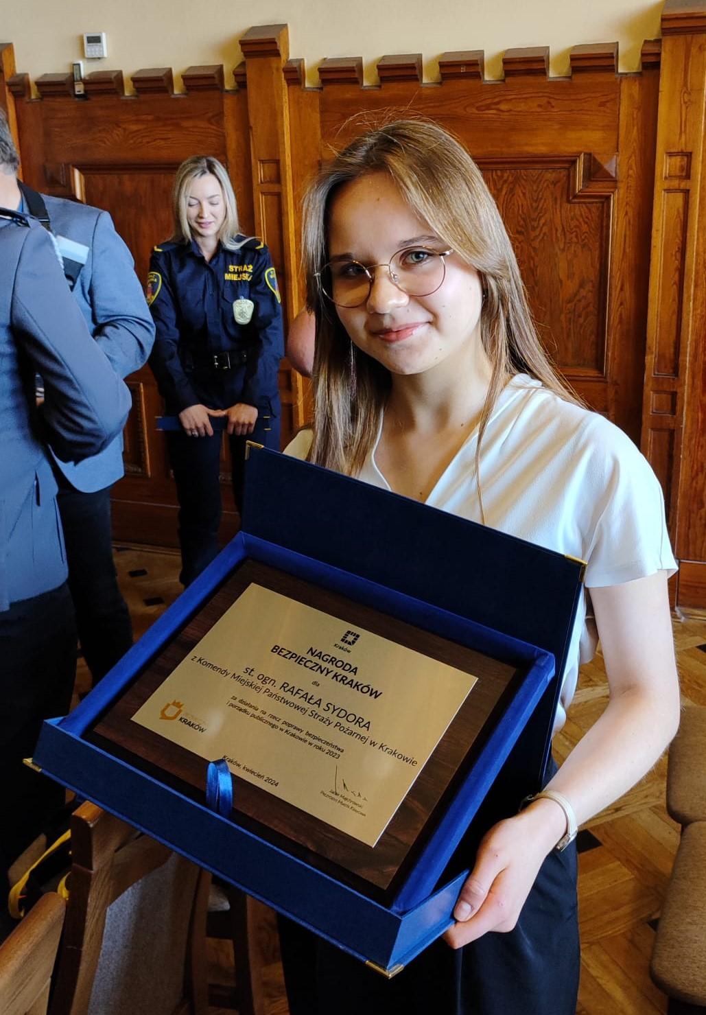 Prezydent Miasta Krakowa wręczył nagrody "Bezpieczny Kraków " za rok 2023 za wzorową działalność i szczególne osiągnięcia na rzecz poprawy bezpieczeństwa mieszkańców Krakowa. Pośród policjantów, strażników miejskich, znalazł się równiż starszy ogniomistrz Rafał Sydor , który na codzień pełni służbę w JRG nr 4 w Krakowie. W imieniu wspomnianego strażaka z powodu innych obowiązków służbowych nagrodę odebrała córka wyróżnionego. W czasie uroczystości wręczenia udział wzięli również zastępca komendanta miejskiego PSP w Krakowie st.bryg. Andrzej Nowak, oraz dowódca JRG nr 4 bryg. Henryk Tarcholik.