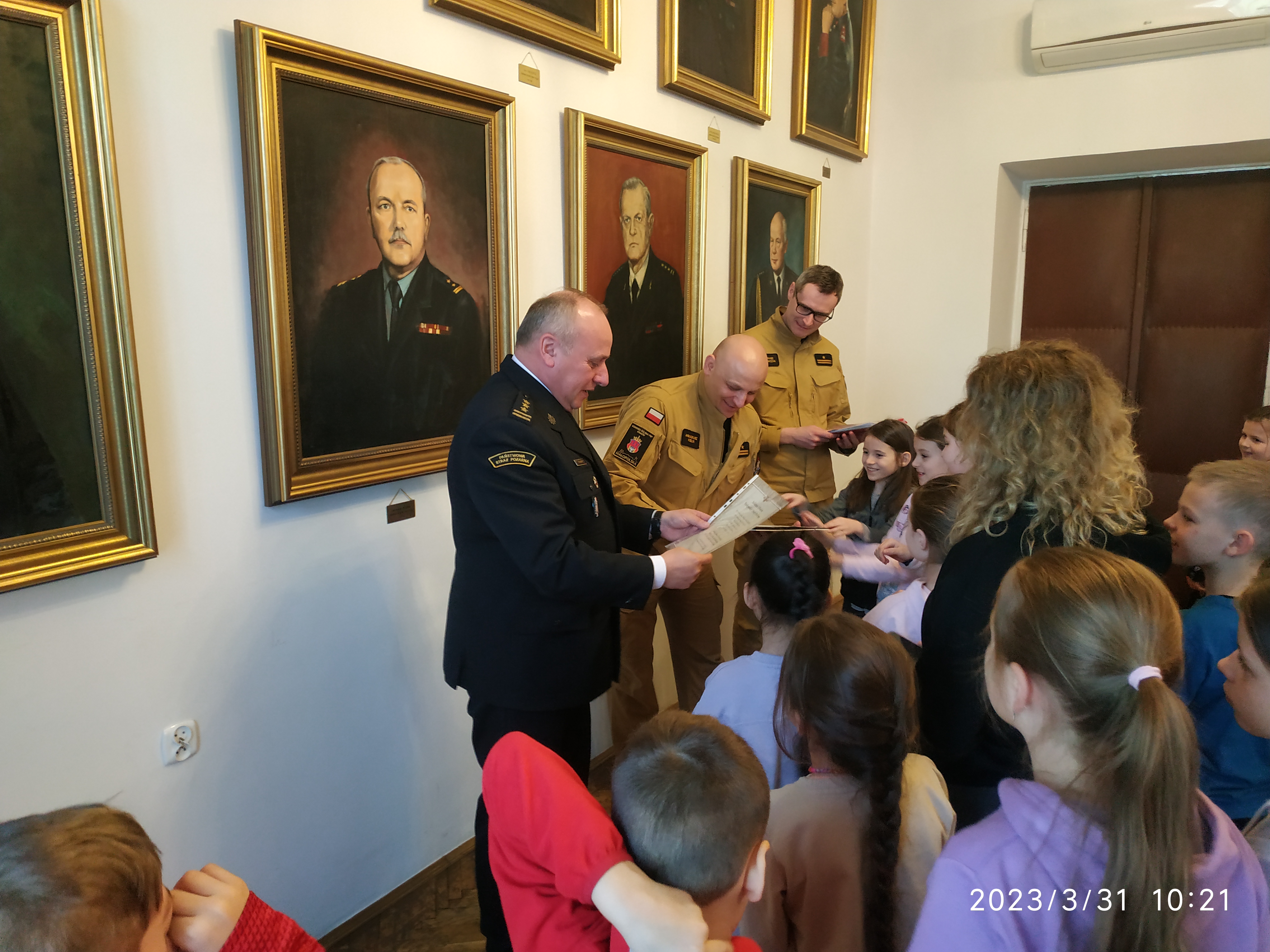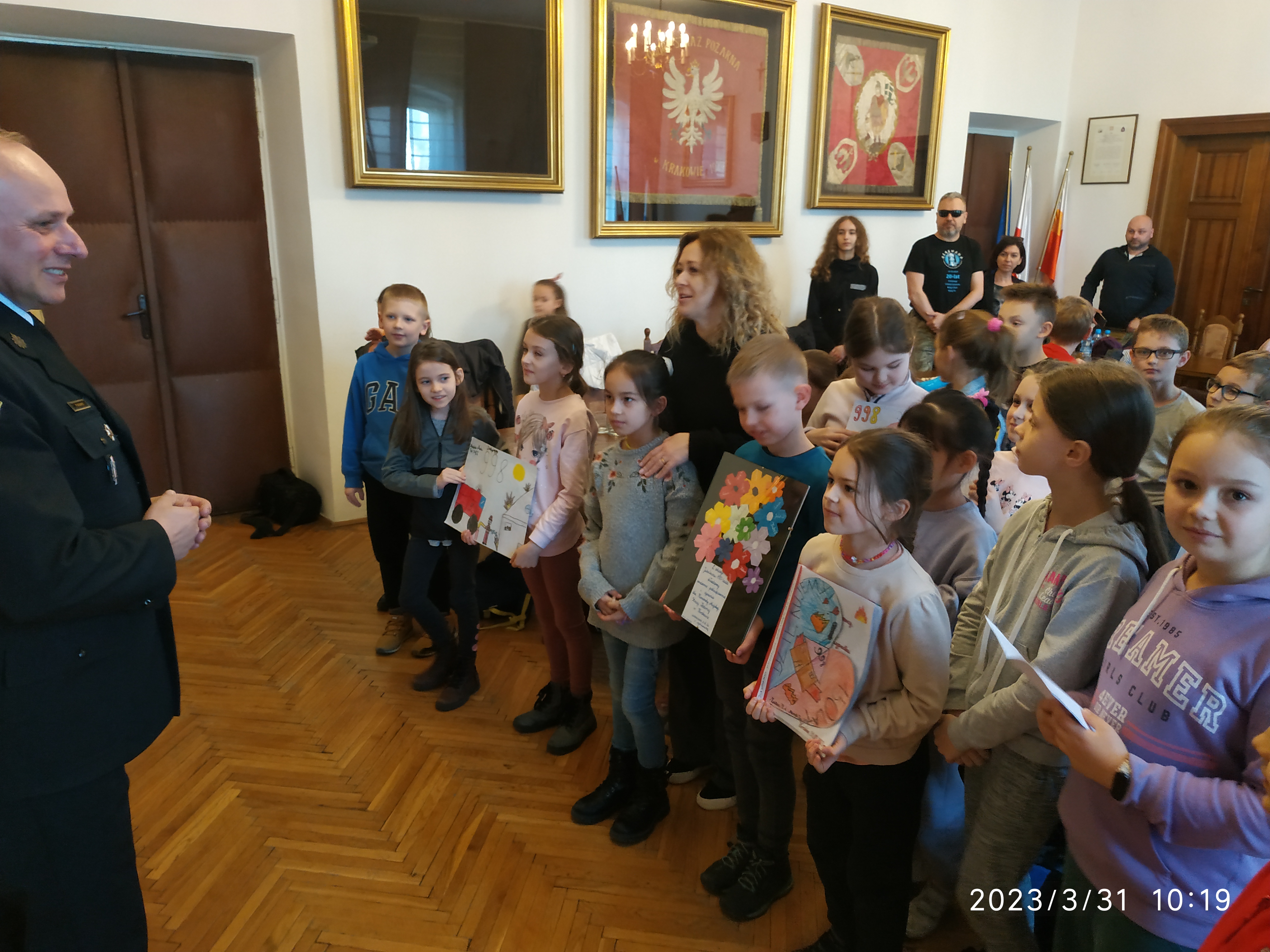Uczniowie klasy drugiej Szkoły Podstawowej nr 82 w Krakowie złożyli wizytę u Komendanta Miejskiego Państwowej Straży Pożarnej w Krakowie. Podczas spotkania upływającego w radosnej atmosferze starszy brygadier Paweł Knapik wraz z Zastępcą bryg. Arkadiuszem Kielinem przypomnieli krótki rys historyczny Krakowskiej Straży Pożarnej i podziękowali za tak miłą niespodziankę. Uczniowie przygotowali prace plastyczne oraz złożyli życzenia z okazji Jubileuszu 150-lecia Krakowskiej Straży Pożarnej w Krakowie, który obchodzony jest w roku 2023.