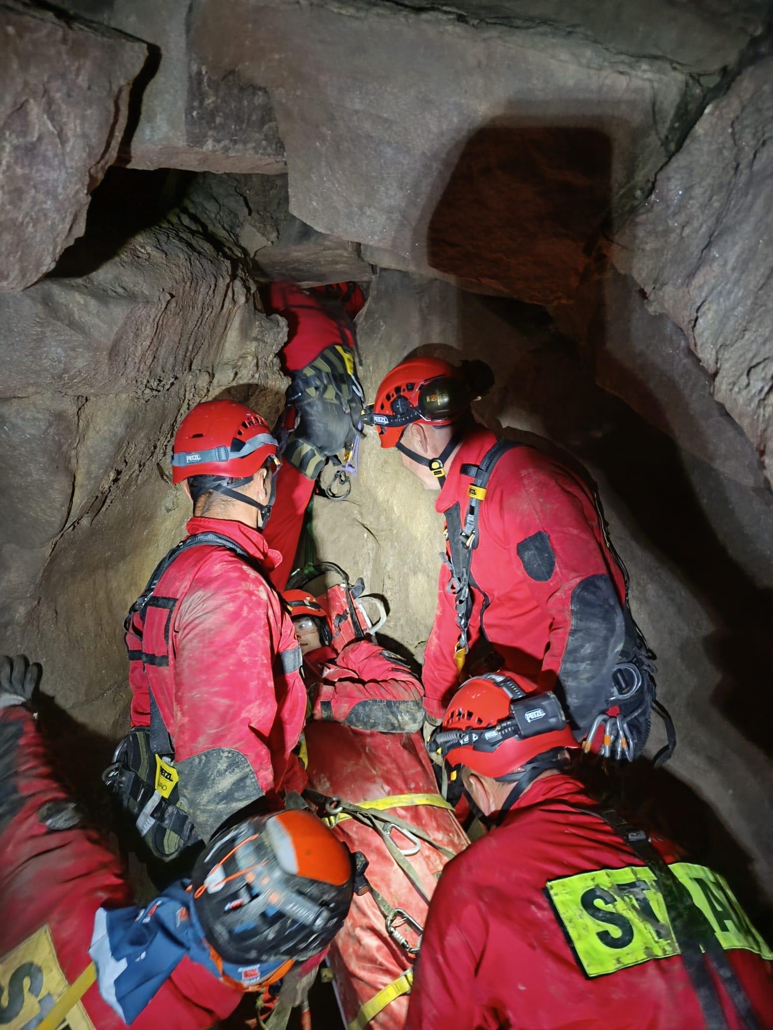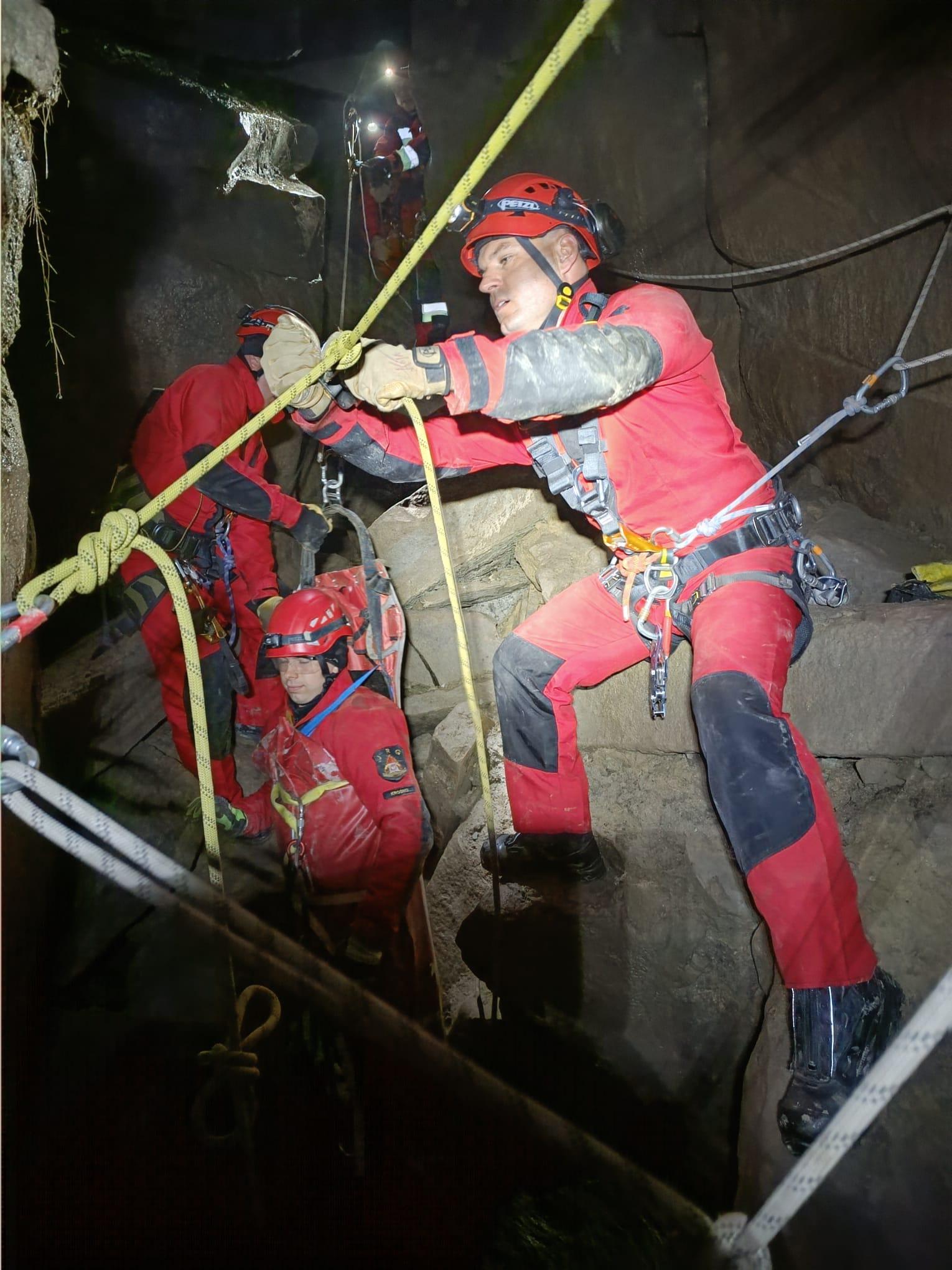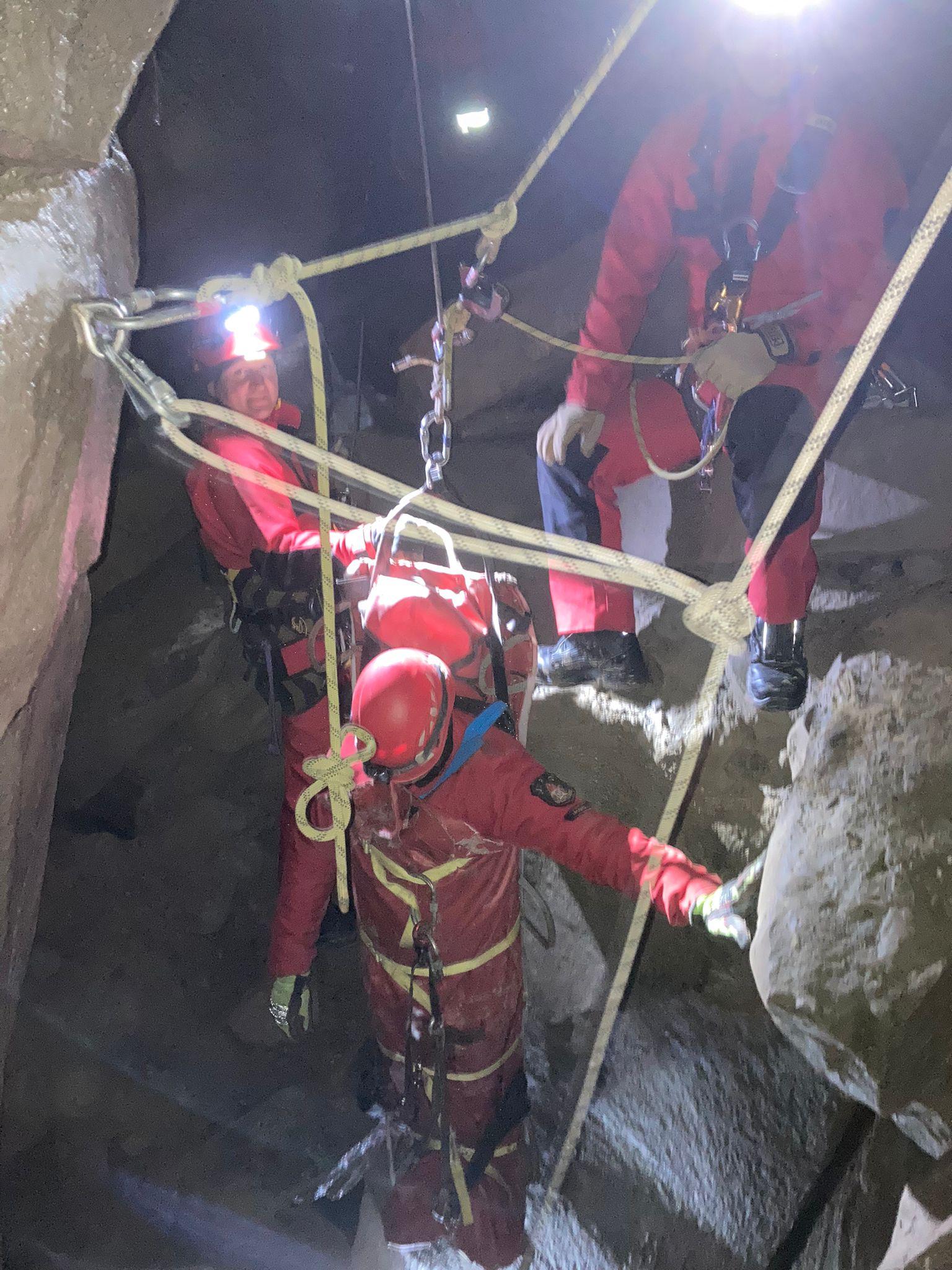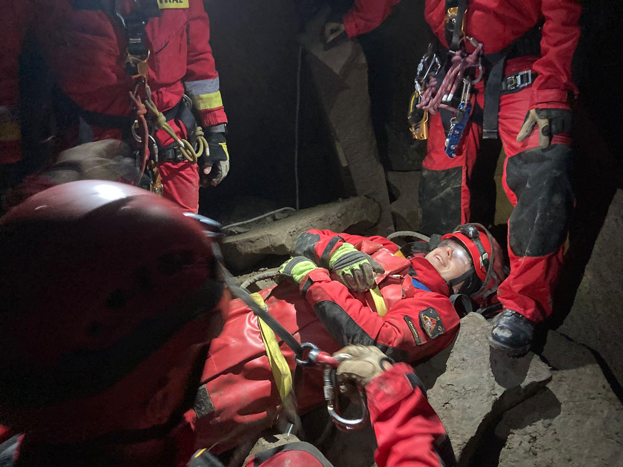 i przyczepką ratowniczą, którzy pomagali w dowozie sprzętu i ratowników pod otwór jaskini. Założeniem ćwiczeń była ewakuacja technikami linowymi z grotołaza ze złamaną nogą. Znajdował się on w odległej części jaskini poniżej dwóch studni i za kilkoma krętymi i ciasnymi korytarzami. Ratownicy ewakuowali poszkodowanego w specjalnych noszach jaskiniowych, po drodze musieli stworzyć rownież 3 układy wyciągowe aby noszę z poszkodowanym móc transportować