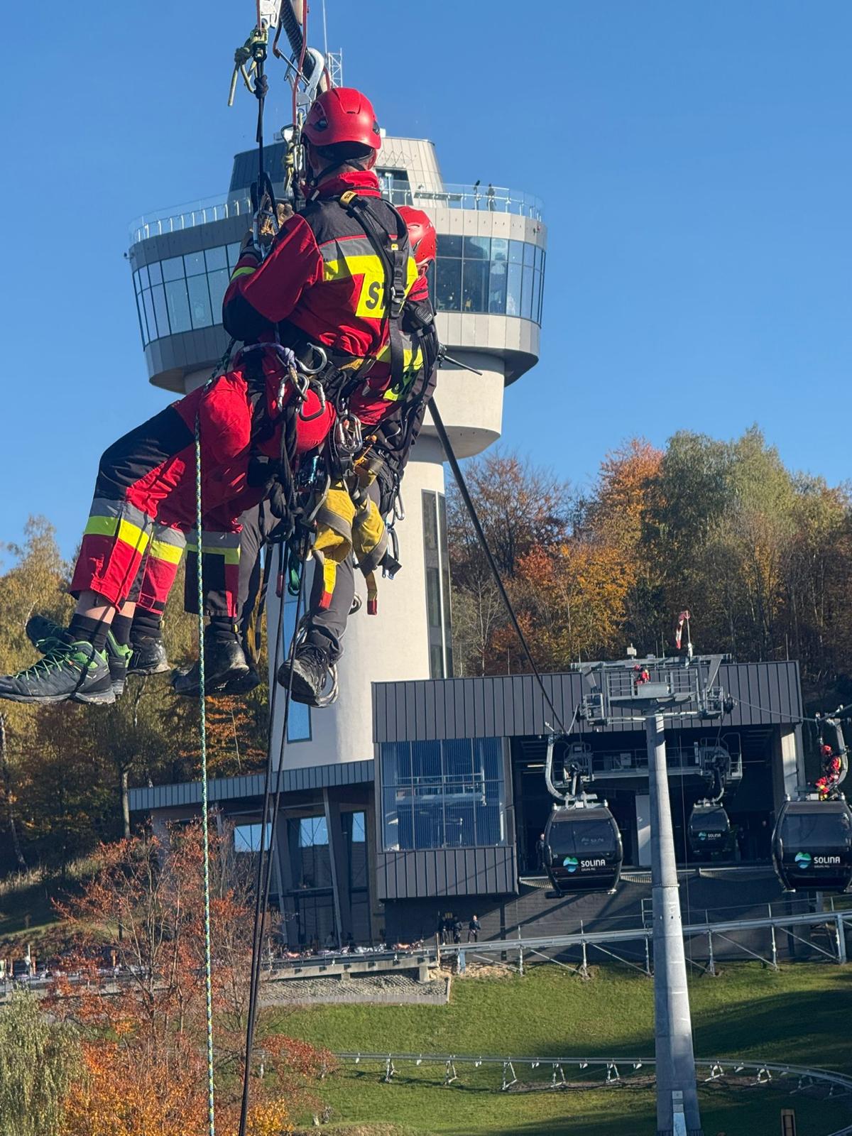 W dniu 20 października 2025 r. na terenie kolei gondolowej PKL w Solinie odbyły się wspólne ćwiczenia Specjalistycznych Grup Ratownictwa Wysokościowego z Komend Miejskich PSP w Rzeszowie i Krośnie. Celem działań było doskonalenie technik ewakuacji osób z gondoli zawieszonych na linie nośnej w przypadku awarii systemu napędowego lub innych zdarzeń zagrażających bezpieczeństwu pasażerów. W ćwiczeniach udział brał także Centralny Pododdział Kontrterrorystyczny Policji BOA Warszawa oraz Samodzielny Pododdział Kontrterrorystyczny Policji z Rzeszowa.