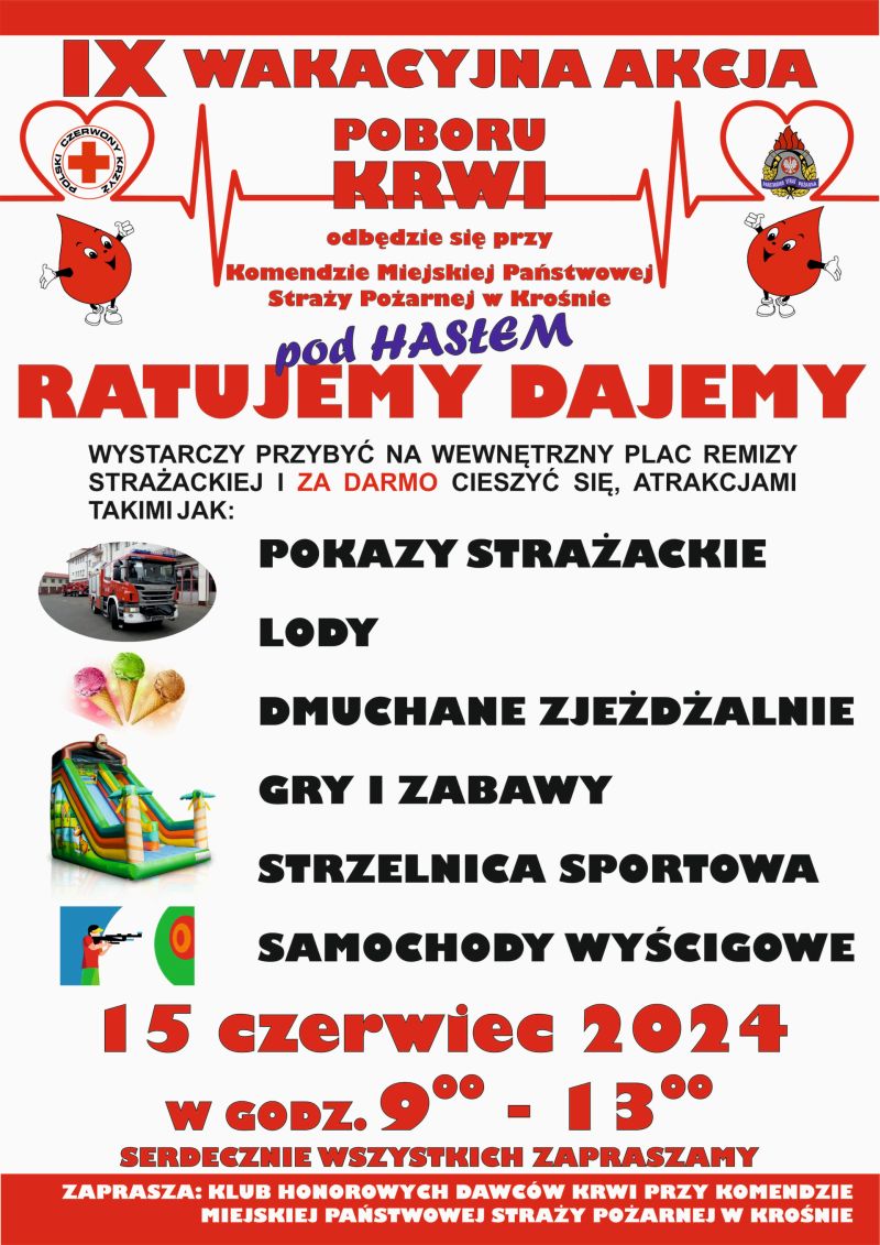 Klub Honorowych Dawców Krwi przy Komendzie Miejskiej Państwowej Straży Pożarnej w Krośnie zaprasza do wzięcia udziału w IX akcji poboru krwi dla osób potrzebujących w okresie wakacyjnym, pod hasłem „Ratujemy-Dajemy” w dniu 15.06.2024 r. w godz. 9-13.