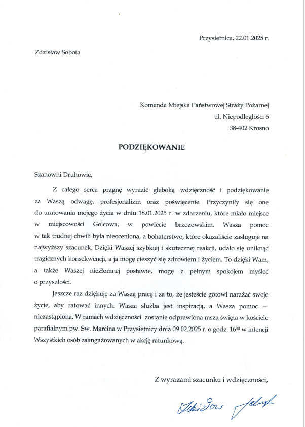 W dniu 23 stycznia 2025 roku, na ręce Komendanta Miejskiego PSP w Krośnie spłynęło podziękowanie za działania w których uczestniczyli strażacy m.in. z Komendy Miejskiej PSP w Krośnie.