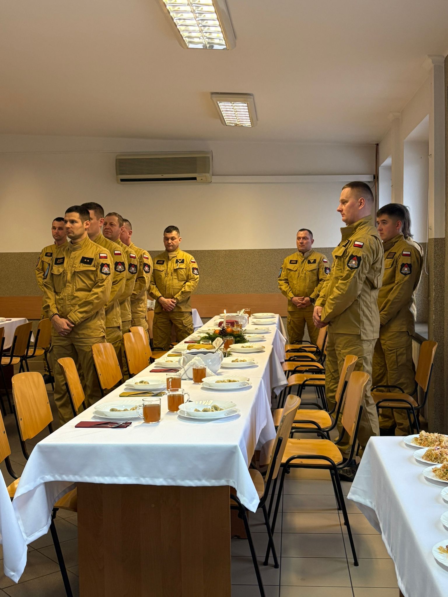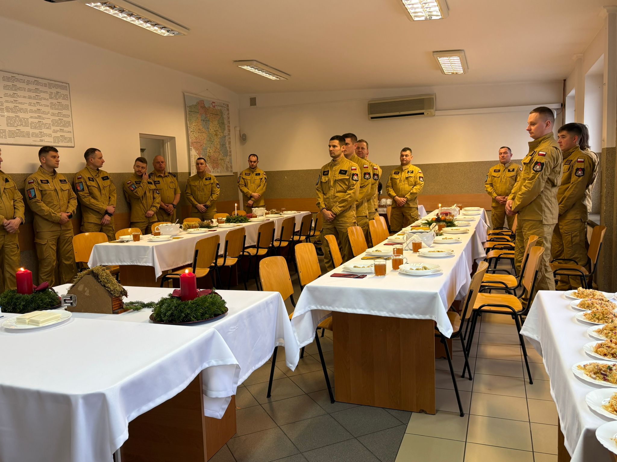 st. bryg. Zbigniew Nowak podziękował strażakom za służbę w kończącym się 2025 r. i złożył życzenia bożonarodzeniowe. Po połamaniu się opłatkiem wszyscy obecni zasiedli do wspólnego wigilijnego stołu.