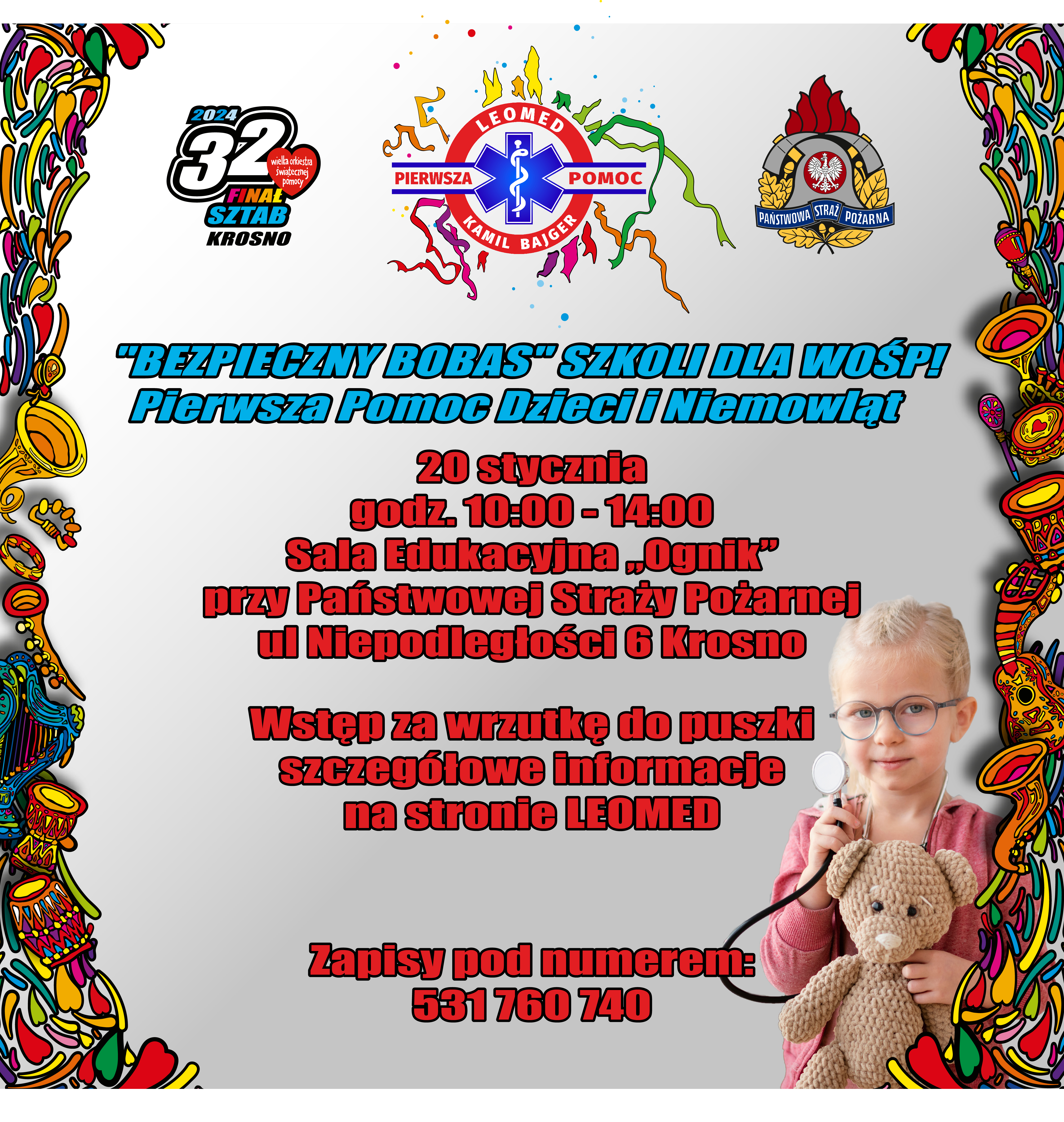 W dniu 20.01.2024r w sali edukacyjnej "Ognik" przy Komendzie Państwowej Straży Pożarnej ul. Niepodległości 6 odbędzie się szkolenie z zakresu Pierwszej Pomocy Dzieci i Niemowląt. Wstęp na szkolenie za wrzutkę do puszki WOŚP (szczegółowe informacje na stronie https://www.facebook.com/profile.php?id=100087813494182).