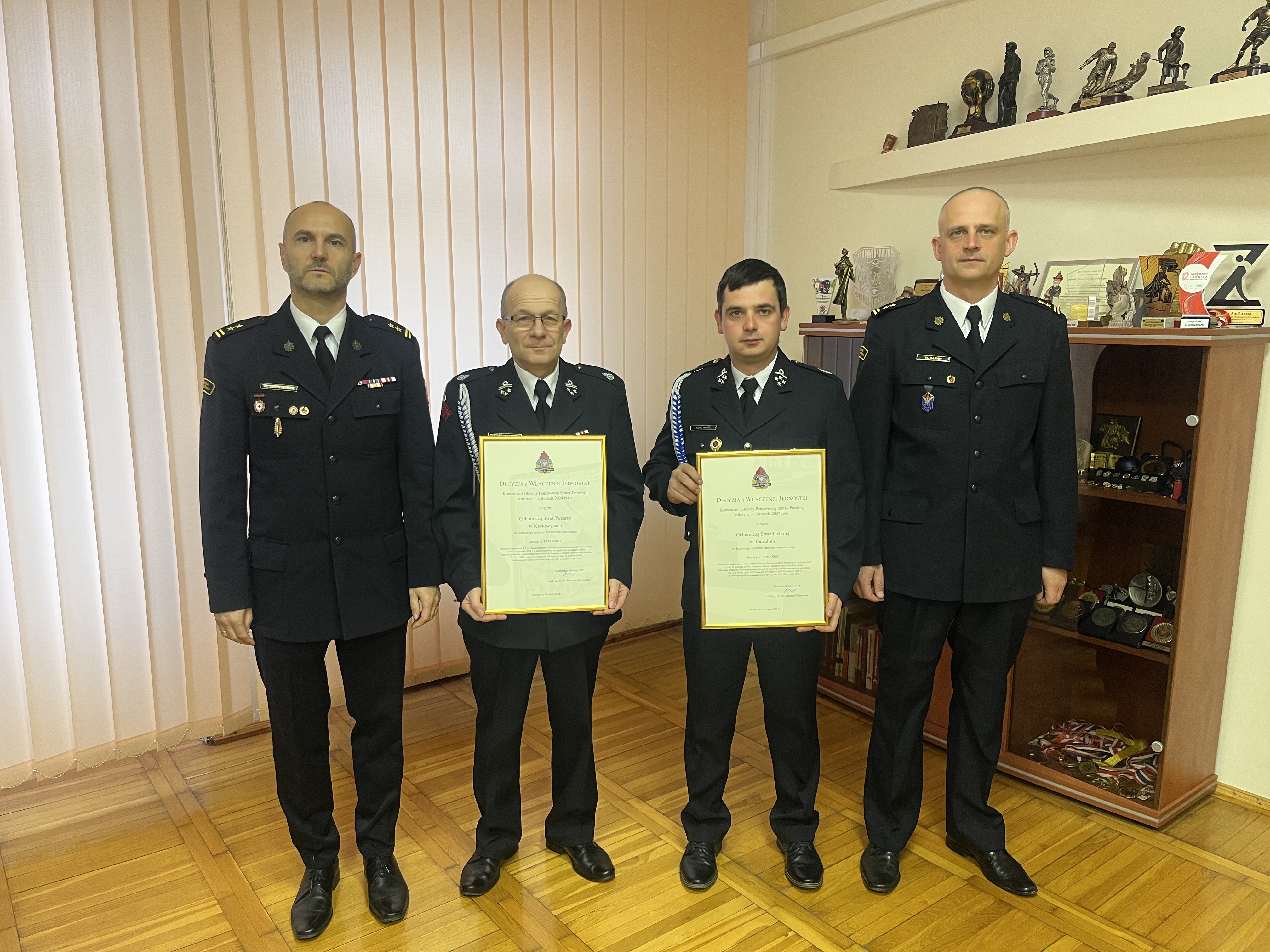 W dniu 6 grudnia 2024 r. Zastępca Komendanta Miejskiego Państwowej Straży Pożarnej w Legnicy bryg. Marcin Swenderski w obecności Naczelnika Wydziału Operacyjno-Szkoleniowego bryg. Wojciecha Barana uroczyście wręczył decyzje o włączeniu dwóch jednostek OSP z terenu powiatu legnickiego do krajowego systemu ratowniczo-gaśniczego. Z dniem 11 listopada 2024 r. Komendant Główny Państwowej Straży Pożarnej decyzją nr 1/225 KSRG włączył Ochotniczą Straż Pożarną w Krotoszycach do krajowego systemu ratowniczo-gaśniczego. Decyzja została złożona ręce Prezesa OSP w Krotoszycach dh Ryszarda Wierzbickiego. Z dniem 11 listopada 2024 r. Komendant Główny Państwowej Straży Pożarnej decyzją nr 1/226 KSRG włączył Ochotniczą Straż Pożarną w Taczalinie do krajowego systemu ratowniczo-gaśniczego. Decyzja została złożona na ręce Prezesa OSP w Taczalinie dh Rafała Tymkowa. Warto podkreślić, że jest to ponowne włączenie tych jednostek do systemu. Pierwsze włączenie jednostki OSP w Krotoszycach nastąpiło 1 stycznia 2015 r. Jednostka OSP w Taczalinie została włączona po raz pierwszy do systemu 1 stycznia 2020 r.