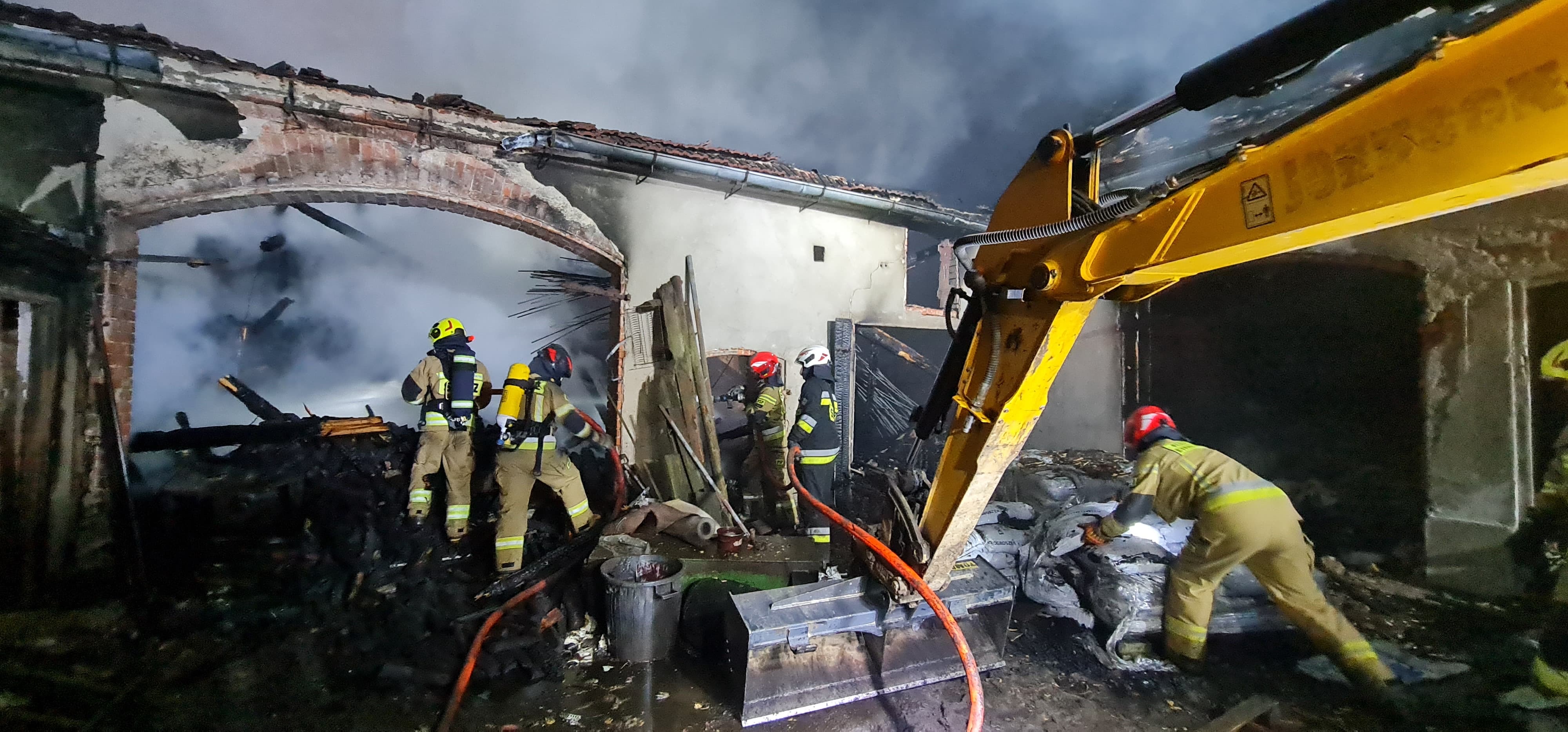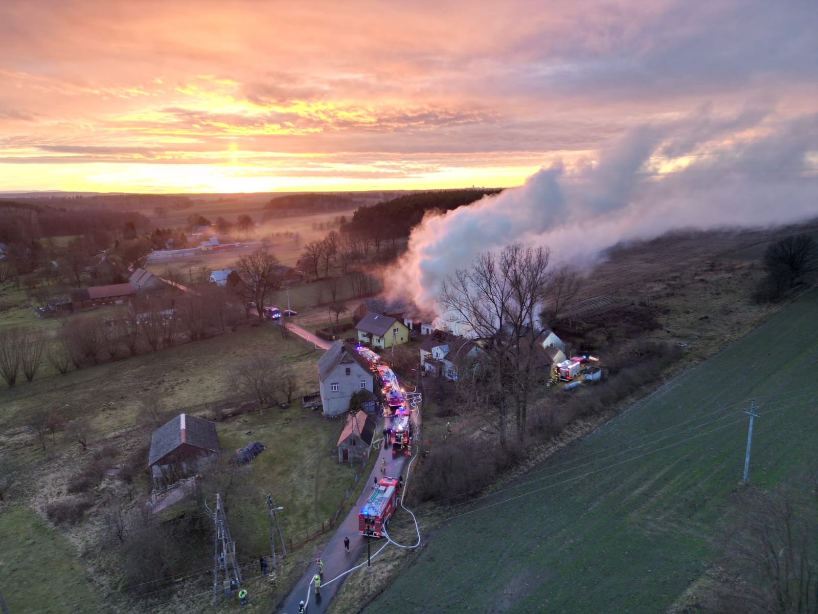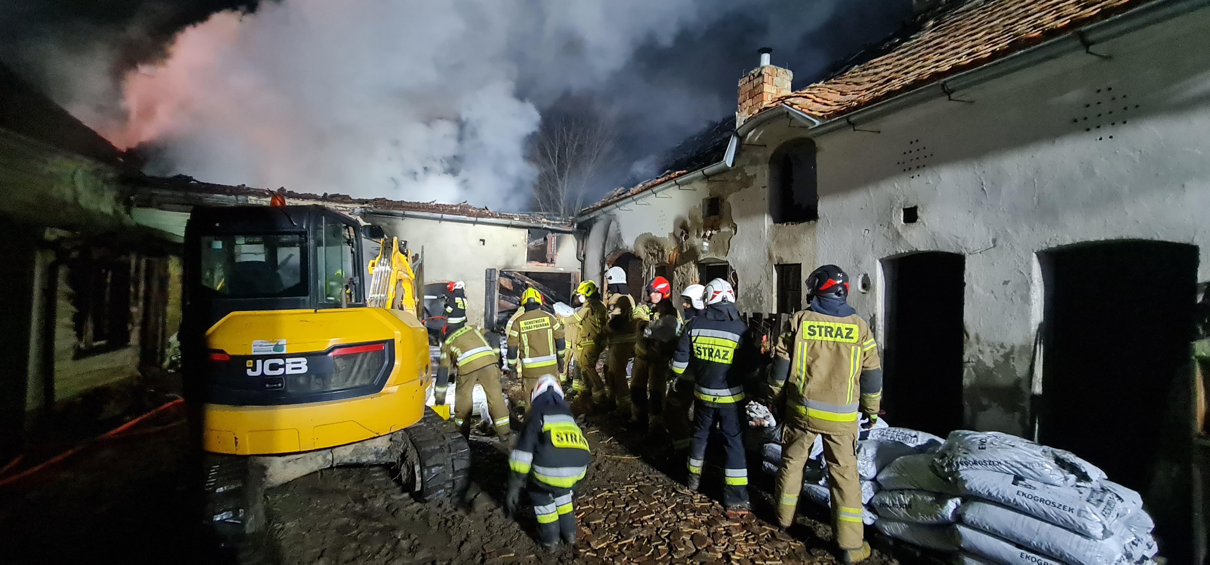 6 stycznia 2025 r. o godzinie 14:39 Stanowisko Kierowania Komendy Miejskiej Państwowej Straży Pożarnej w Legnicy otrzymało zgłoszenie o pożarze domu jednorodzinnego w miejscowości Biskupin. Do zdarzenia niezwłocznie udały się zastępy z Jednostki Ratowniczo-Gaśniczej nr 3 w Chojnowie oraz OSP Rokitki, OSP Witków, OSP Jaroszówka, OSP Krzywa. Po dojeździe pod wskazany adres i przeprowadzeniu rozpoznania, stwierdzono rozwinięty pożar poddasza w budynku mieszkalnym oraz w dwóch budynków gospodarczych. Na miejscu zdarzenia panowało także silne zadymienie. Przed przybyciem jednostek ochrony przeciwpożarowej, w czasie wolnym od służby, st. ogn. Krzysztof Pachura wraz z zamieszkującą obok sąsiadką, ewakuowali z budynku kobietę i mężczyznę. Oboje byli przytomni. Mężczyzna w wyniku pożaru doznał oparzeń głowy oraz ręki. Strażacy udzielili poszkodowanym pomocy do czasu przybycia Zespołu Ratownictwa Medycznego. Równocześnie prowadzono działania gaśnicze podając 5 prądów wody. Ze względu na duże rozmiary zdarzenia konieczne było zadysponowanie dodatkowych sił i środków m.in. Dowódcy Grupy Operacyjnej Komendanta Miejskiego PSP w Legnicy, drabiny mechanicznej z Jednostki Ratowniczo-Gaśniczej nr 1, samochód specjalny do ładowania butli aparatów ochrony układu oddechowego z Jednostki Ratowniczo-Gaśniczej w Złotoryi oraz drona. Na miejscu prowadzonych działań obecni byli także przedstawiciele Urzędu Gminy Chojnów z wydziału zarządzania kryzysowego wspierający działania ratownicze. Duże nagromadzenie materiału palnego spowodowało konieczność użycia koparko-ładowarki, która umożliwiła jego sprawne usuwanie i dogaszanie. Pogorzelisko zostało sprawdzone kamerą termowizyjną w celu znalezienia ukrytych zarzewi ognia. W akcji gaśniczej trwającej 6 godzin i 26 minut brało udział łącznie 39 strażaków.