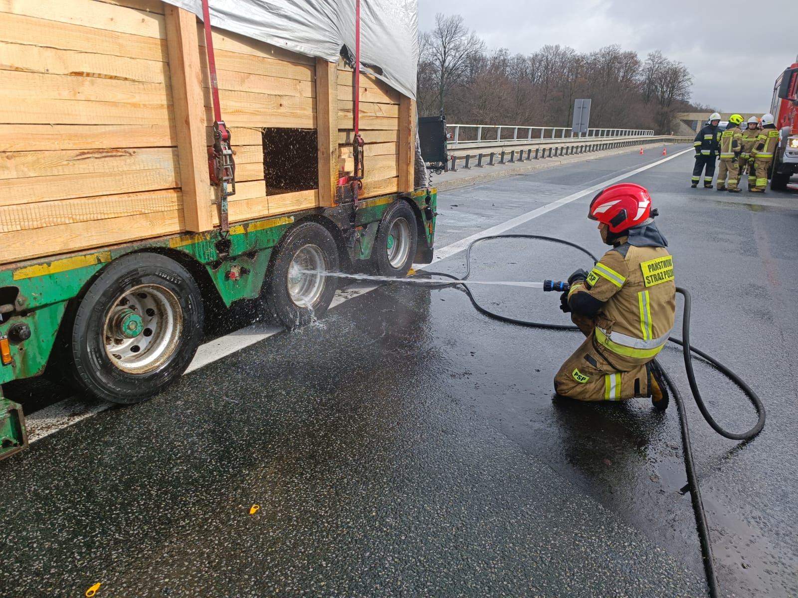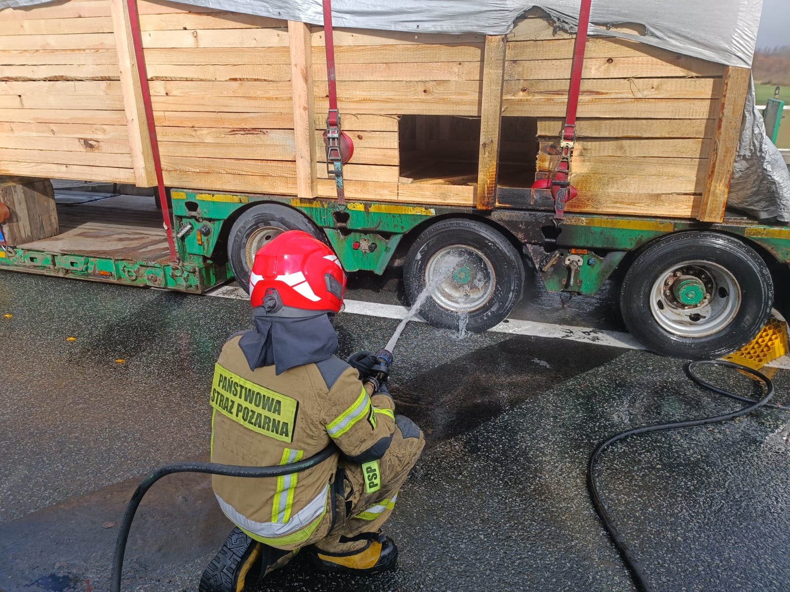 W dniu 25 marca 2023 r. o godzinie 10:53 Stanowisko Kierowania Komendanta Miejskiego Państwowej Straży Pożarnej w Legnicy otrzymało z Centrum Powiadamiania Ratunkowego informację o pożarze naczepy przewożącej palety, który ma miejsce na 88 km autostrady A4 w kierunku Zgorzelca. Do zdarzenia zadysponowano 2 zastępy z Jednostki Ratowniczo-Gaśniczej nr 1 w Legnicy, OSP Raczkowa oraz OSP Janowice Duże. Po dotarciu zastępów na miejsce potwierdzono zadymienie wydobywające się spod naczepy pojazdu, na której przewożona była drewniana konstrukcja. Samochód znajdował się częściowo na pasie awaryjnym. Naczepa była odpięta od ciągnika siodłowego. Kierowca podjął próbę ugaszenia pożaru podręcznym sprzętem gaśniczym, jednak bezskutecznie. Strażacy podając jeden prąd wody ugasili zarzewie ognia. W zdarzeniu nie było osób poszkodowanych.