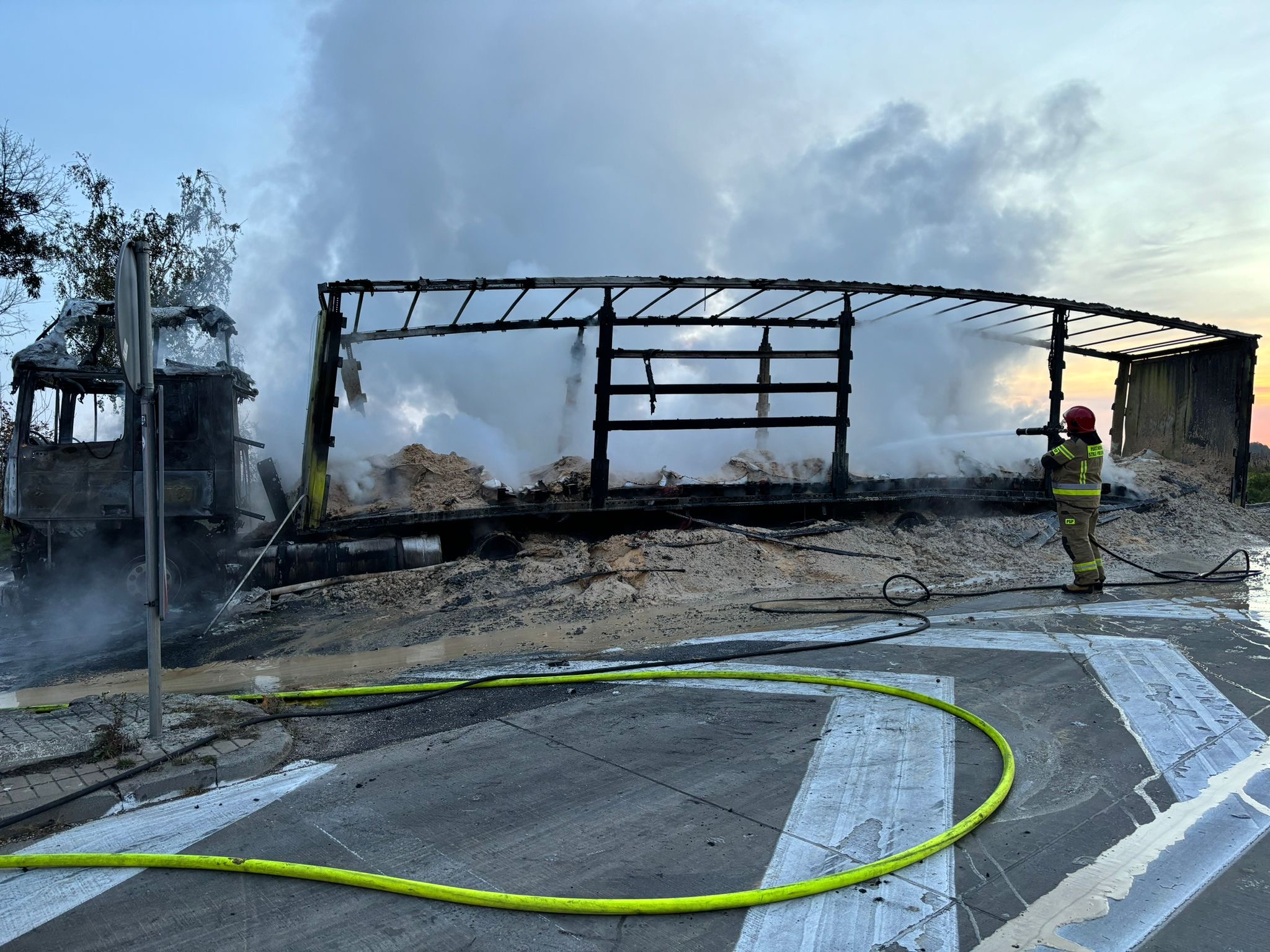 Pożar samochodu cieżarowego z naczepą na parkingu autostrady A4