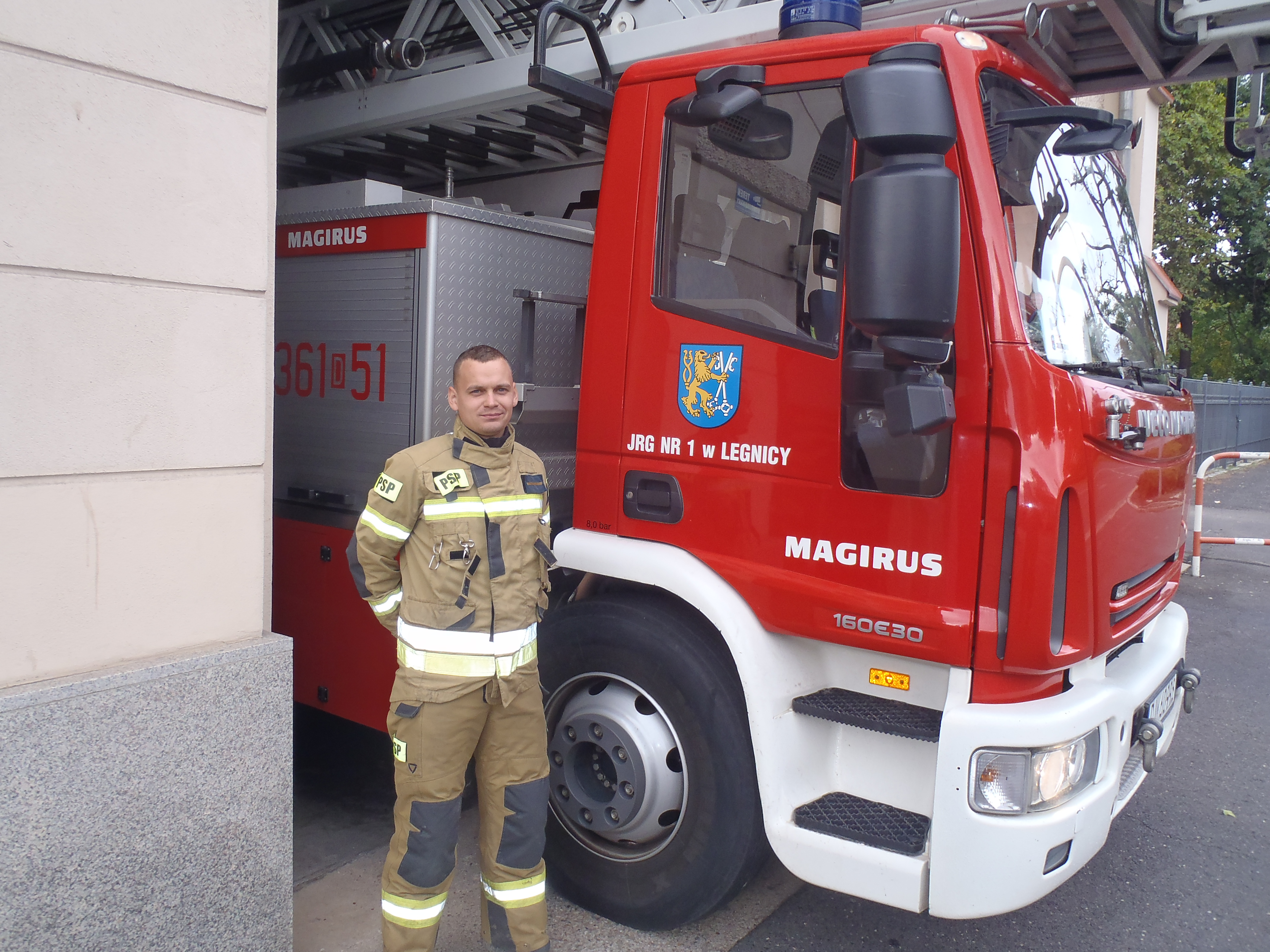 W dniu 5 października 2020 r. o godz. 15.00 Dyżurny Stanowiska Kierowania Komendanta Miejskiego Państwowej Straży Pożarnej w Legnicy, otrzymał zgłoszenie o pożarze w budynku mieszkalnym wielorodzinnym przy ul. Żołnierzy II Armii Wojska Polskiego 1/9 w Legnicy. Dyżurny niezwłocznie do zdarzenia zadysponował zastępy z Jednostki Ratowniczo – Gaśniczej Państwowej Straży Pożarnej nr 2 oraz nr 1 w Legnicy. Po dojeździe na miejsce stwierdzono, że osobą zgłaszającą zdarzenie był obecny na miejscu st. str. Patryk Zachary, który będąc w czasie wolnym od służby przejeżdżał i zauważył wydobywający się dym z okna budynku wielorodzinnego na 4 kondygnacji. Wyżej wymieniony strażak przed przyjazdem zastępów udał się do lokalu mieszkalnego nr 9, następnie ostrzegł przebywających tam 6 lokatorów i zalecił im ewakuację z budynku. Kierujący działaniami ratowniczymi w wyniku przeprowadzonego rozpoznania ustalił, że w pomieszczeniu kuchni palił się 20-kilogramowy plastikowy pojemnik na pranie. Pożar ugaszono. Lokal mieszkalny oraz klatkę schodową oddymiono i przewietrzono. Przy użyciu mierników wielogazowych oraz kamery termowizyjnej wykonano pomiary na obecność substancji niebezpiecznych oraz podwyższonej temperatury w budynku. W wyniku zdarzenia nikt nie został poszkodowany i można stwierdzić, że to również dzięki błyskawicznej i wspaniałej postawie st. str. Patryka Zacharego. Minuty, sekundy opóźnienia mogły spowodować tragiczny w skutkach pożar powodujący zagrożenie życia dla wszystkich mieszkańców budynku oraz duże straty materialne. Działania trwały łącznie 56 min. W akcji gaśniczej brało udział: 5 zastępów Państwowej Straży Pożarnej z Legnicy.