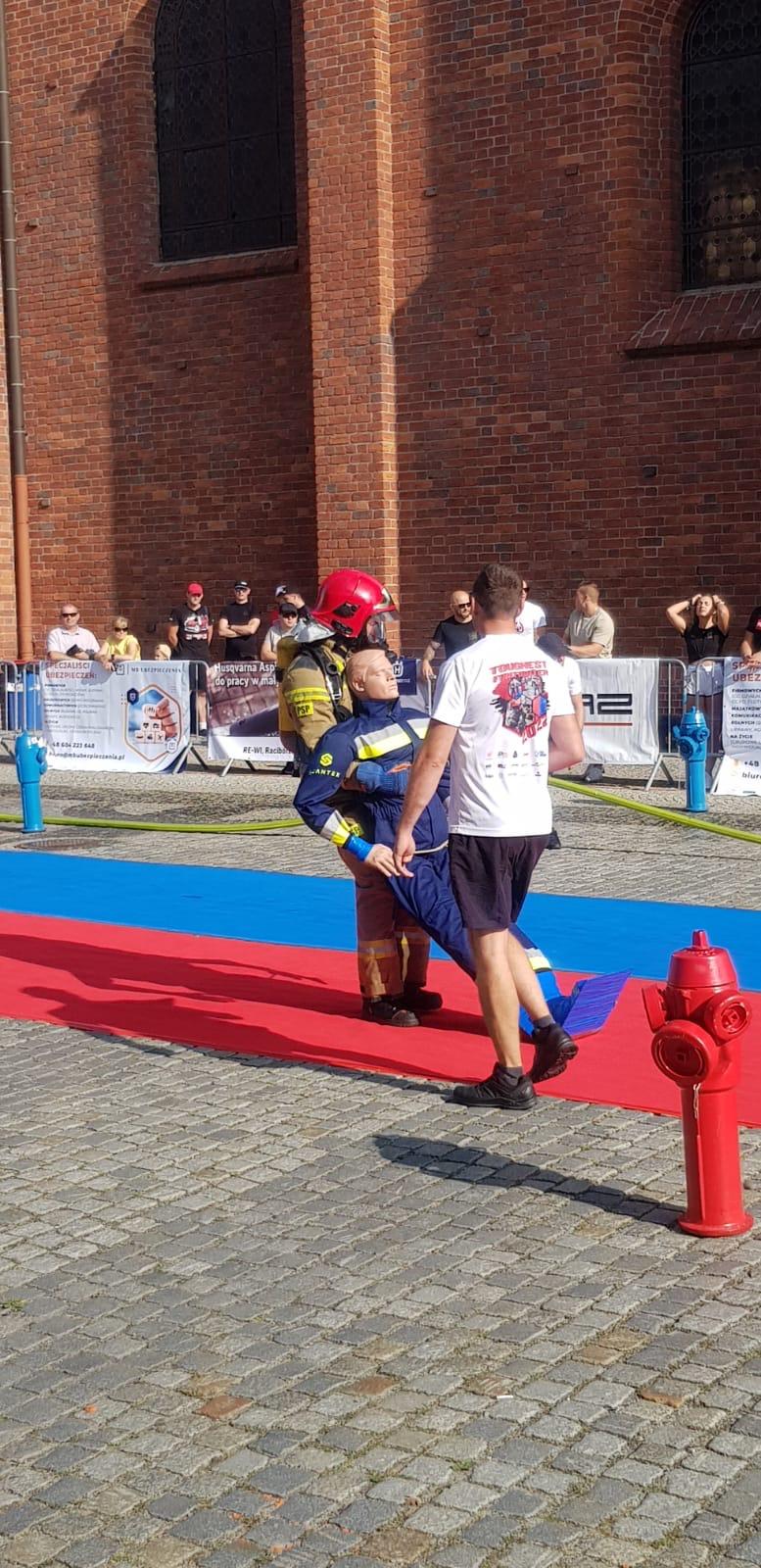 W dniu 24.08.2024 r. w Raciborzu odbyły się zawody strażackie z cyklu Mistrzostw Polski TOUGHEST FIREFIGTER czyli Zawody o Najtwardszego Strażaka, które wpisane są w kalendarz imprez sportowych Komendanta Głównego. W zawodach tych brali udział również strażacy z naszej komendy. Startującymi byli asp. szatab. Adam Kierepka z Jednostki Ratowniczo-Gaśniczej nr 1 w Legnicy oraz mł. ogn. Maciej Dacko z Jednostki Ratowniczo-Gaśniczej nr 2 w Legnicy Obaj zawodnicy w trakcie swojego startu mieli do pokonania tor składający się z kilku konkurencji: biegu na wysokość 3 piętra z obciążeniem 19 kg, następnie wciągnięcia ciężaru o tej samej wadze, przeprowadzenie symulacji wyważania drzwi za pomocą młota, bieg slalomem na dystans 30 m podjęcie linie gaśniczej i wykonanie symulowanego gaszenia pożaru. Ostatnią konkurencją była ewakuacja osoby poszkodowanej na dystansie 30 m. Należy wspomnieć, że waga manekina wynosiła 80 kg, a wszystkie konkurencje nasi strażacy wykonywali w pełnej ochronie indywidualnej wraz z założoną maską i aparatem OUO.