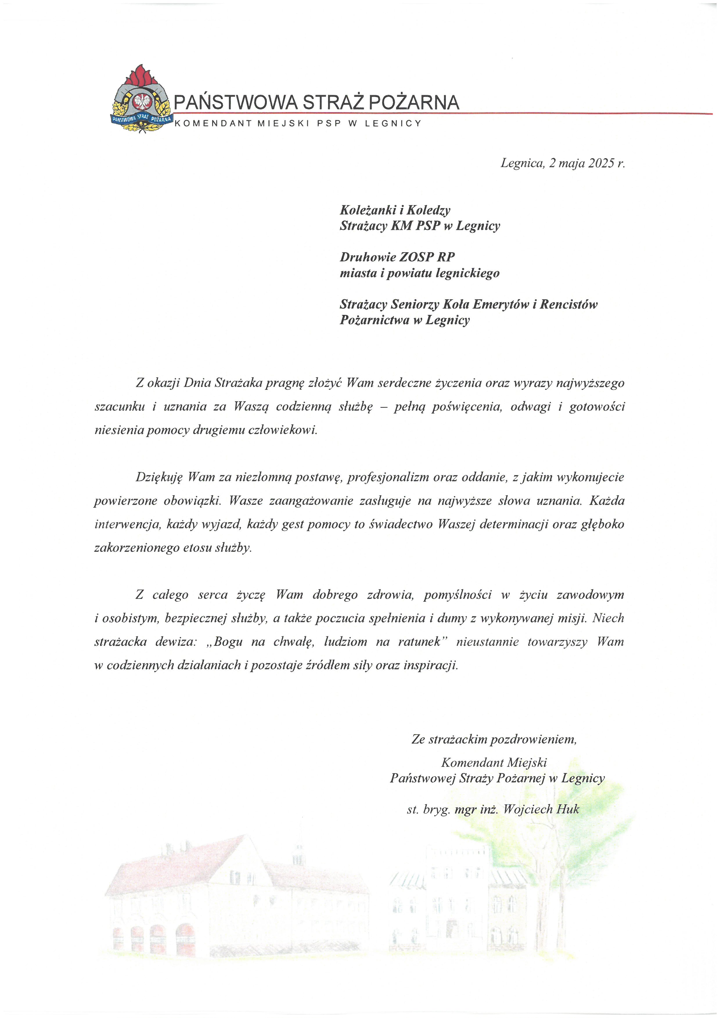 Życzenia Komendanta Miejskiego Państwowej Straży Pożarnej w Legnicy z okazji Dnia Strażaka