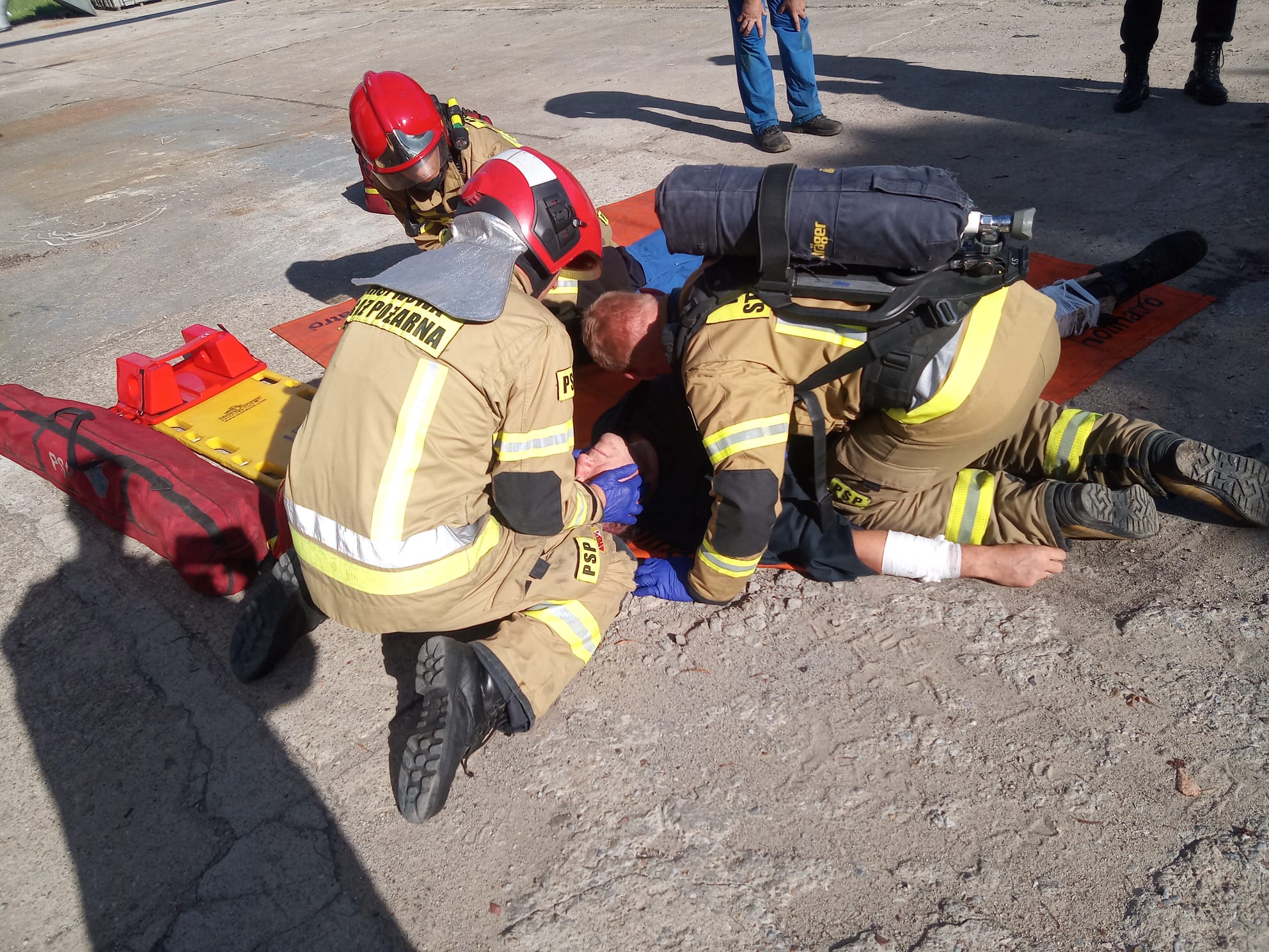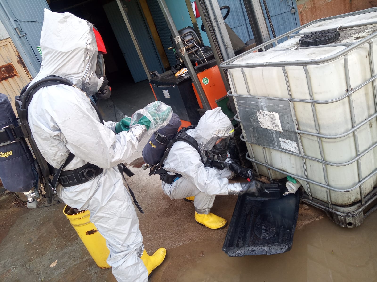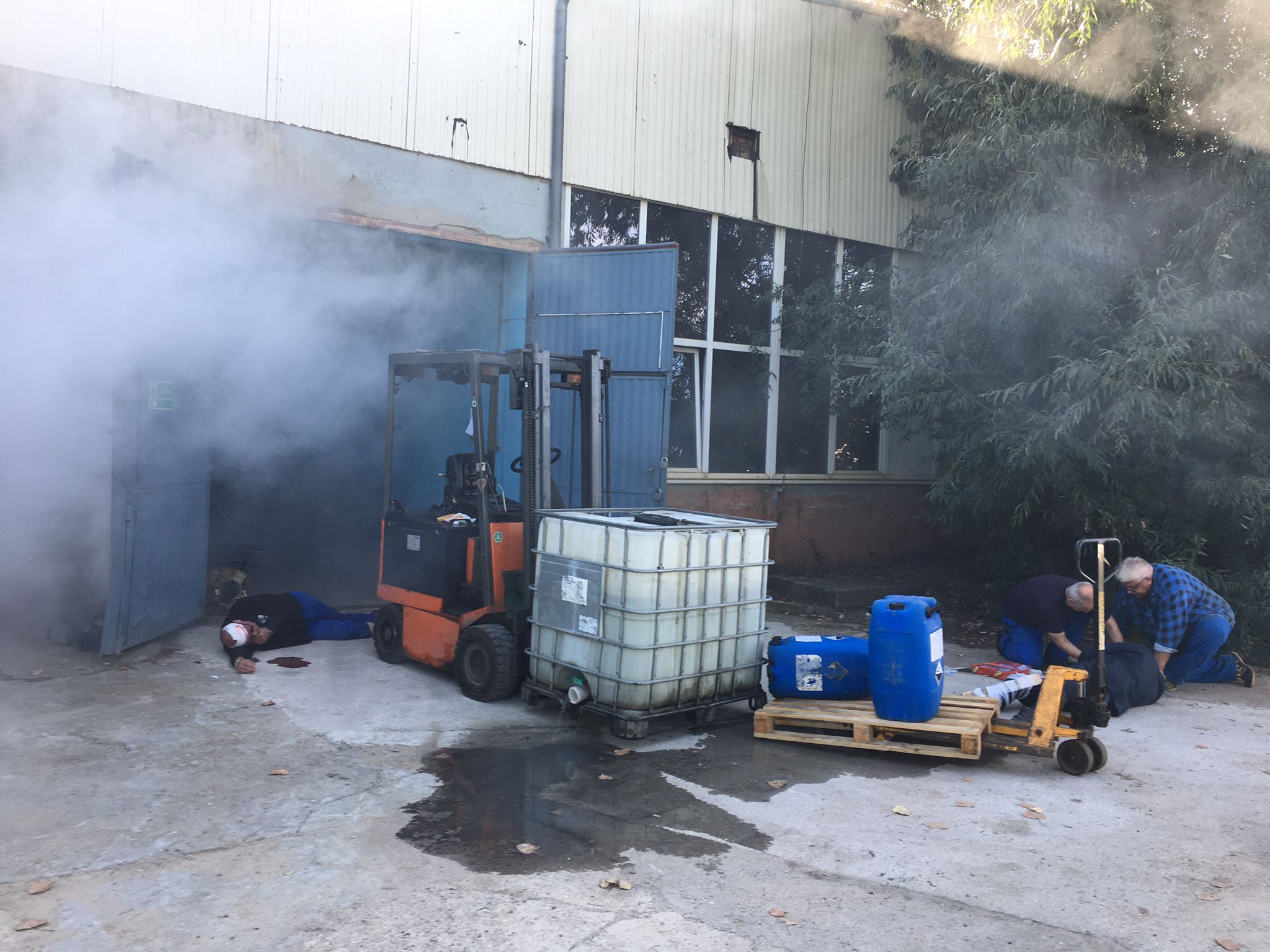 Założenie ćwiczebne polegało na zlikwidowaniu zagrożenia chemicznego powstałego na skutek zderzenia dwóch wózków widłowych oraz udzieleniu KPP osobom poszkodowanym.