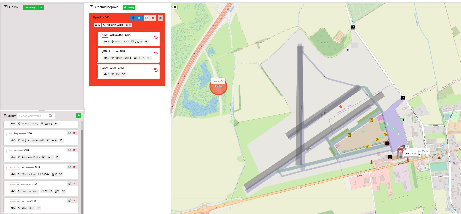 - bieżący podgląd na mapie wszystkich służb wykorzystywanych w działaniach z możliwością ich bieżącego nakierowania na najbardziej dogodny dojazd do zdarzenia.