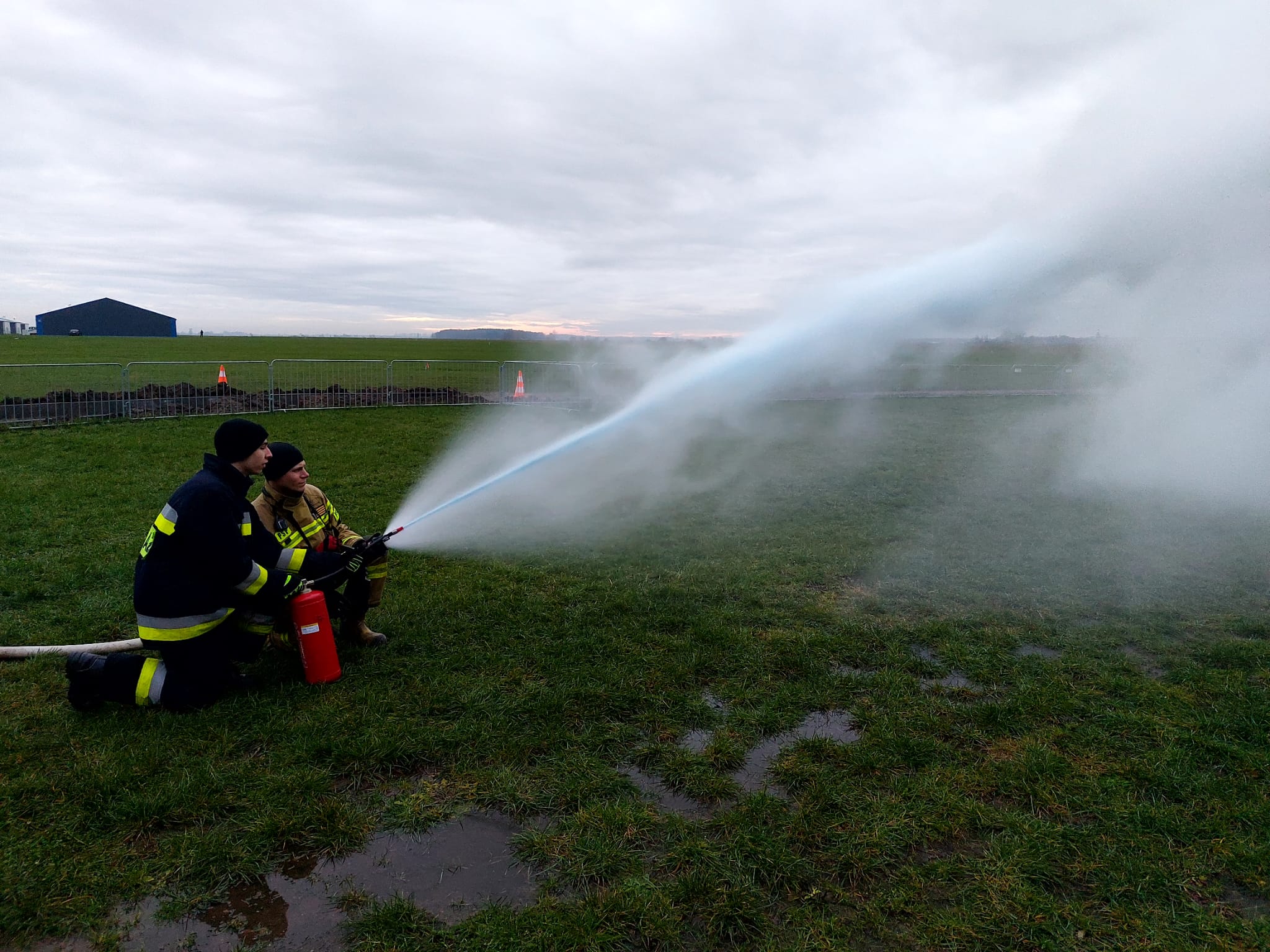 - Część pierwszą „warsztatowa”, która miała na celu przybliżenie specyfiki zagrożeń występujących w statkach powietrznych. Pan Szymon Pracharczyk strażak LSRG Poznań Ławica zapoznał strażaków z nowatorskim sposobem gaszenia silników przy pomocy gaśnicy proszkowej używanej jednocześnie z prądem wody.