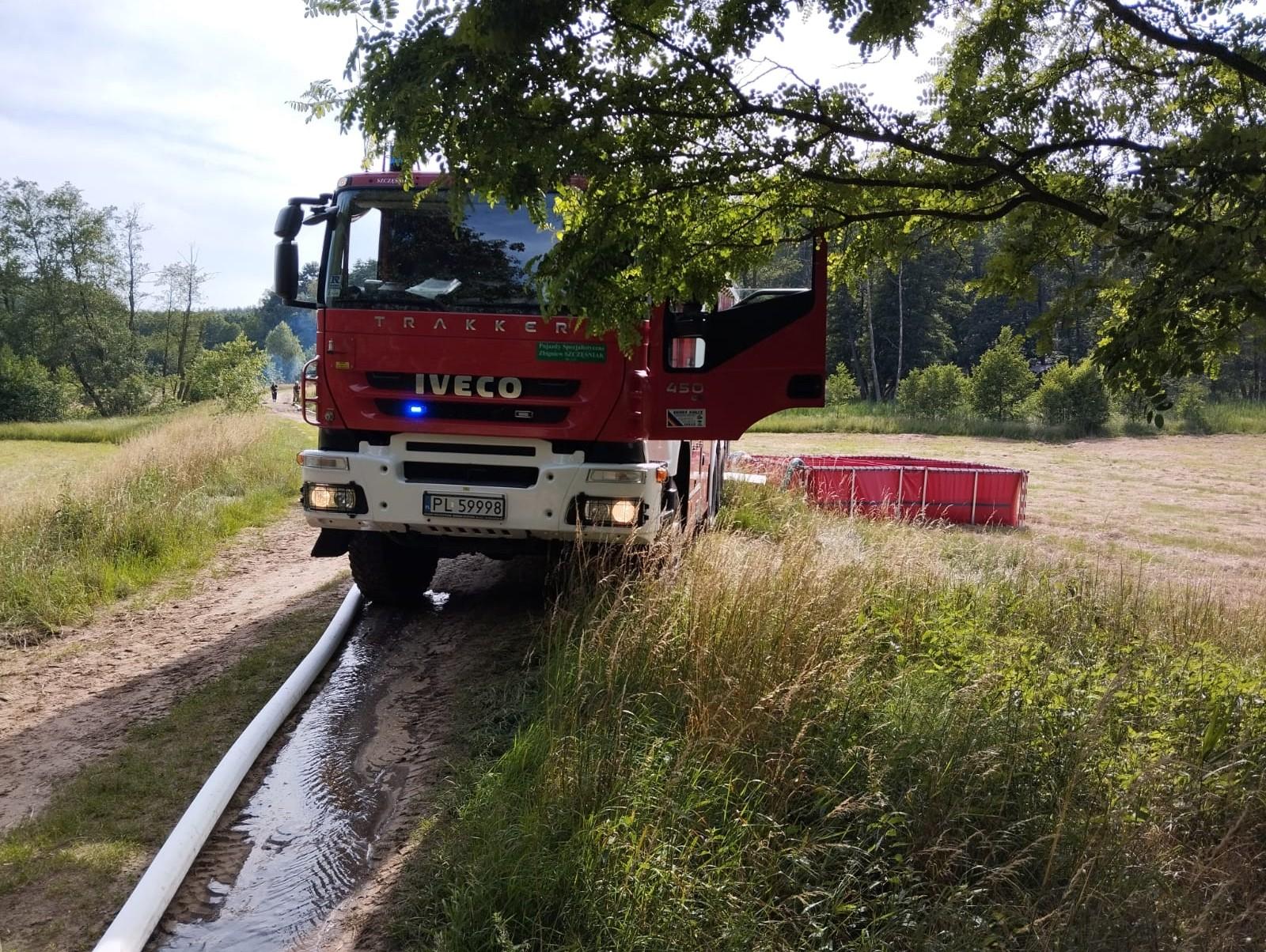 Punkt czerpania wody zorganizowano na cieku wodnym Samica. Strażacy w oparciu o węże tłoczne W110 zbudowali magistralę wodną i metodą przetłaczania dostarczali nią wodę do pożaru po upływie ok. 30 min. Do momentu zbudowania zasilania, wodę do pożaru dostarczano metodą dowożenia. Zamiar taktyczny osiągnięto uzyskując zadowalającą wydajność wodną ok. 1400 l/min na końcu magistrali wężowej.