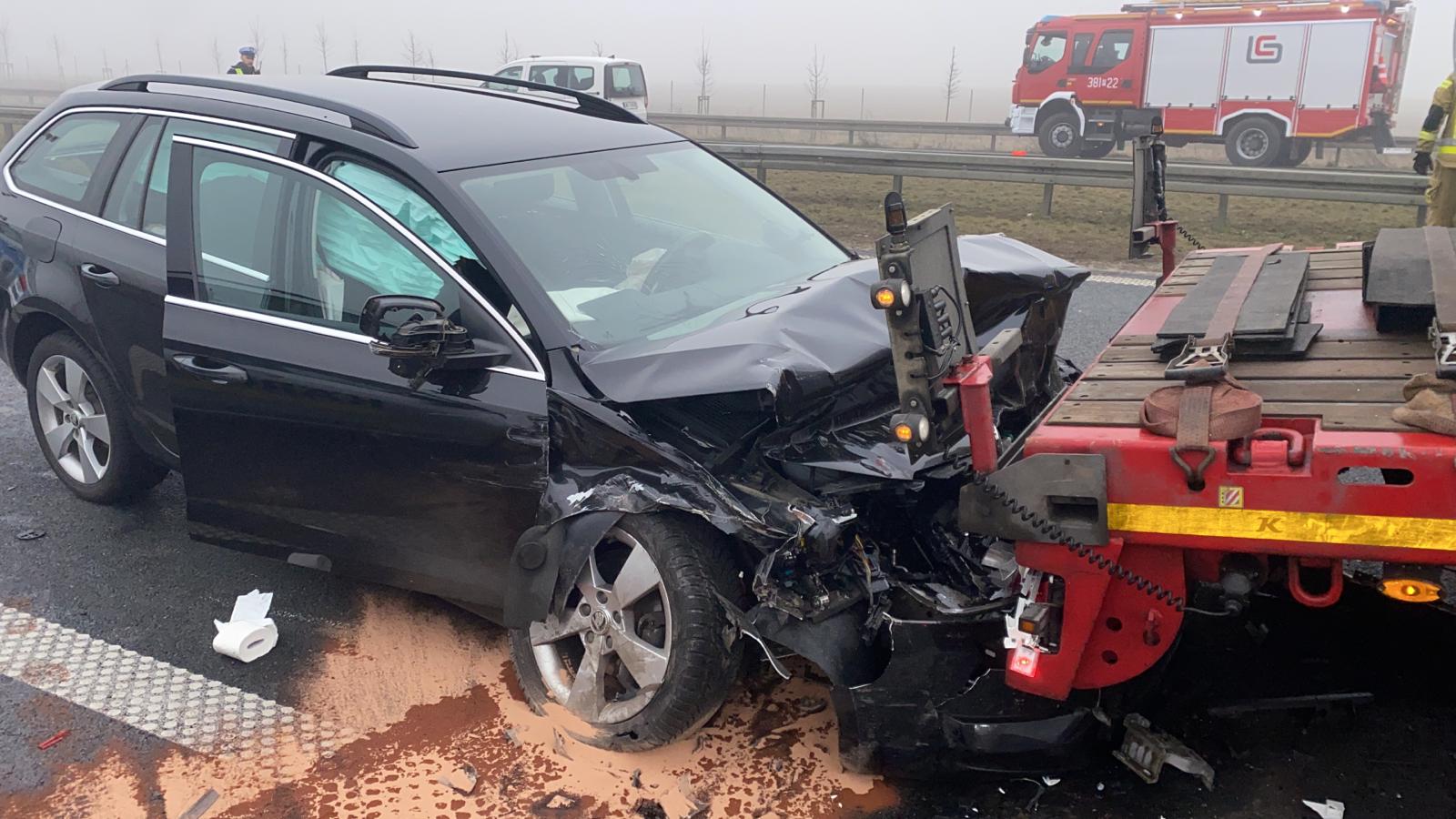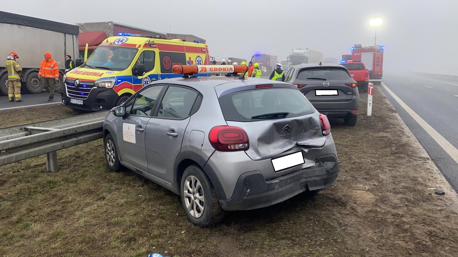 W trakcie usuwania skutków tego zdarzenia Stanowisko Kierowania Komendanta Miejskiego Państwowej Straży Pożarnej w Lesznie zostało powiadomione o wypadku na drodze ekspresowej S5 na wysokości Radomicka. Tam doszło do tzw. ciągu przyczynowo-skutkowego, do którego niewątpliwe przyczyniła się bardzo gęsta mgła. W połączeniu z nieuwagą kierowców dochodziło do serii zderzeń i kolizji na obu pasach drogi ekspresowej S5. Łącznie około 20 pojazdów uległo uszkodzeniom, dlatego w likwidacji skutków tych zdarzeń zaangażowano policjantów, medyków, zarządcę drogi, pomoc drogową i strażaków z powiatu leszczyńskiego i kościańskiego. W kilku przypadkach niezbędne było użycie narzędzi hydraulicznych, aby uwolnić zakleszczone w pojazdach osoby poszkodowane. Łącznie pomocy medycznej udzielono kilkunastu osobom, a konieczne było przetransportowanie 7 osób dorosłych w wieku 30-68 lat oraz dziecka w wieku 5 lat do okolicznych szpitali.