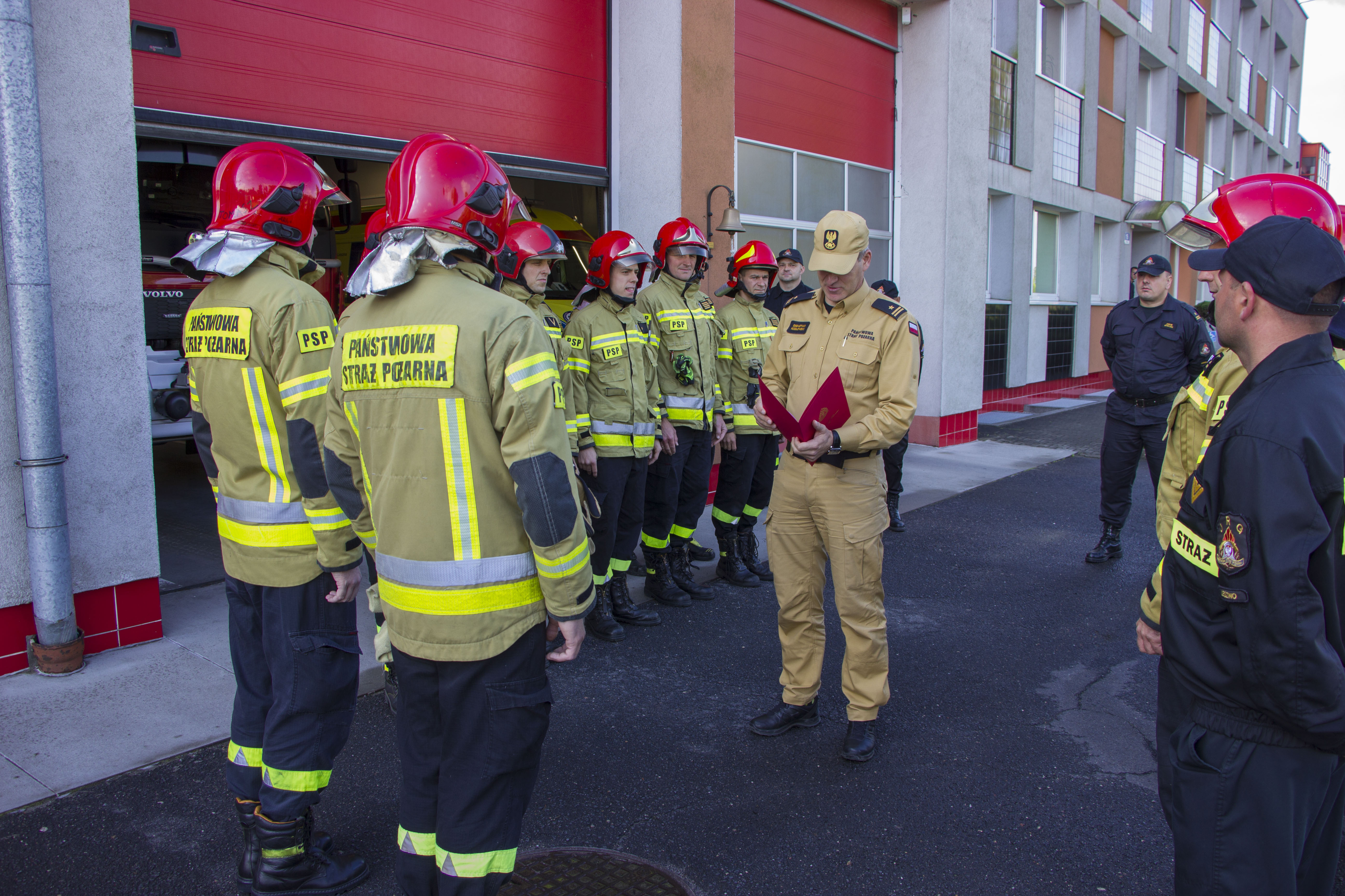 Komendant Miejski Państwowej Straży Pożarnej w Lesznie mł. bryg. Sebastian Kozłowski podczas zmiany służby wręczył dwóm funkcjonariuszom tut. komendy nagrodę Komendanta Głównego PSP dla członków Wielkopolskiej Kompanii Honorowej za szczególne zaangażowanie w przygotowania do Centralnych Obchodów Dnia Strażaka. Nagrodę otrzymali: