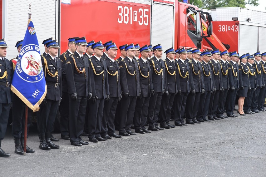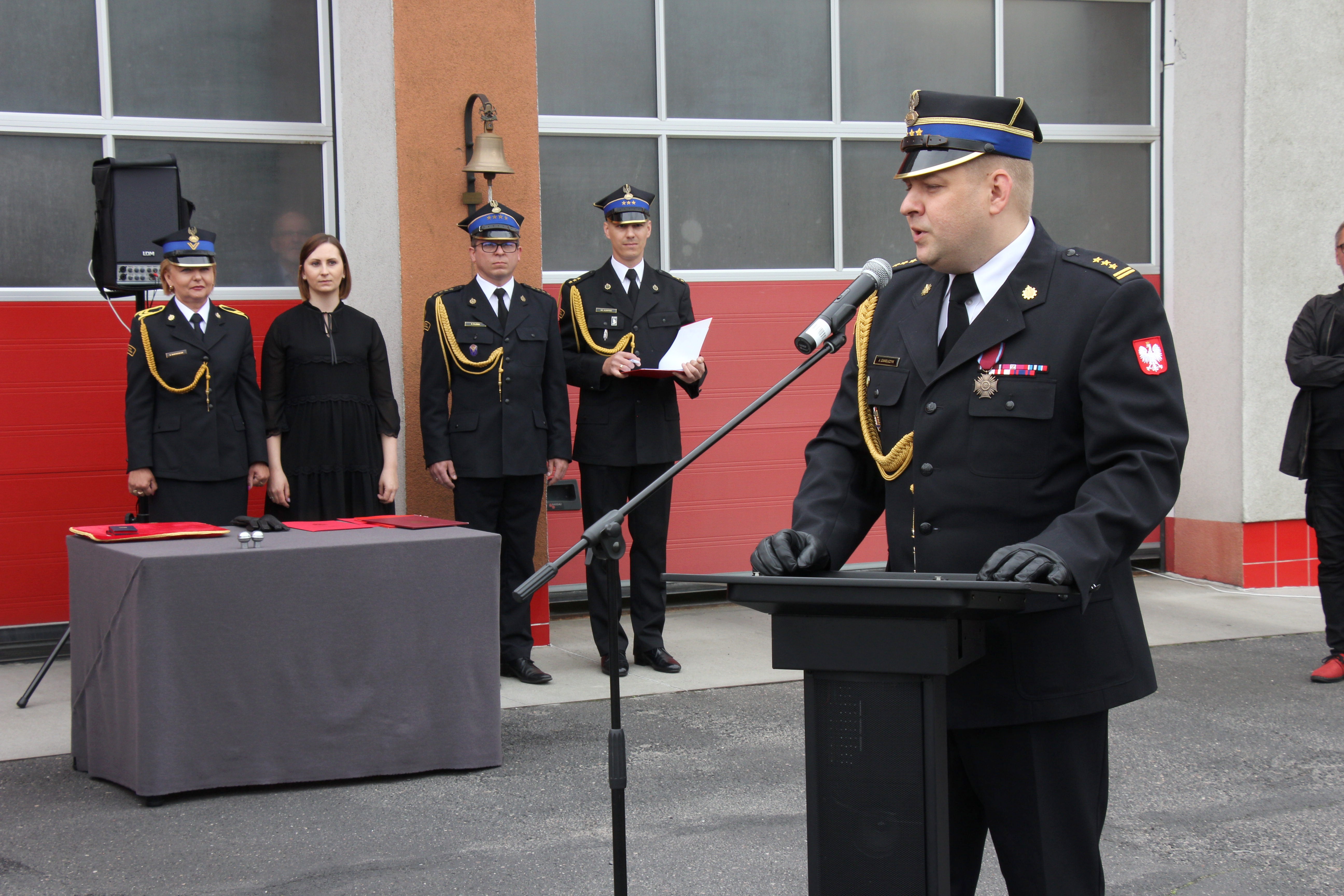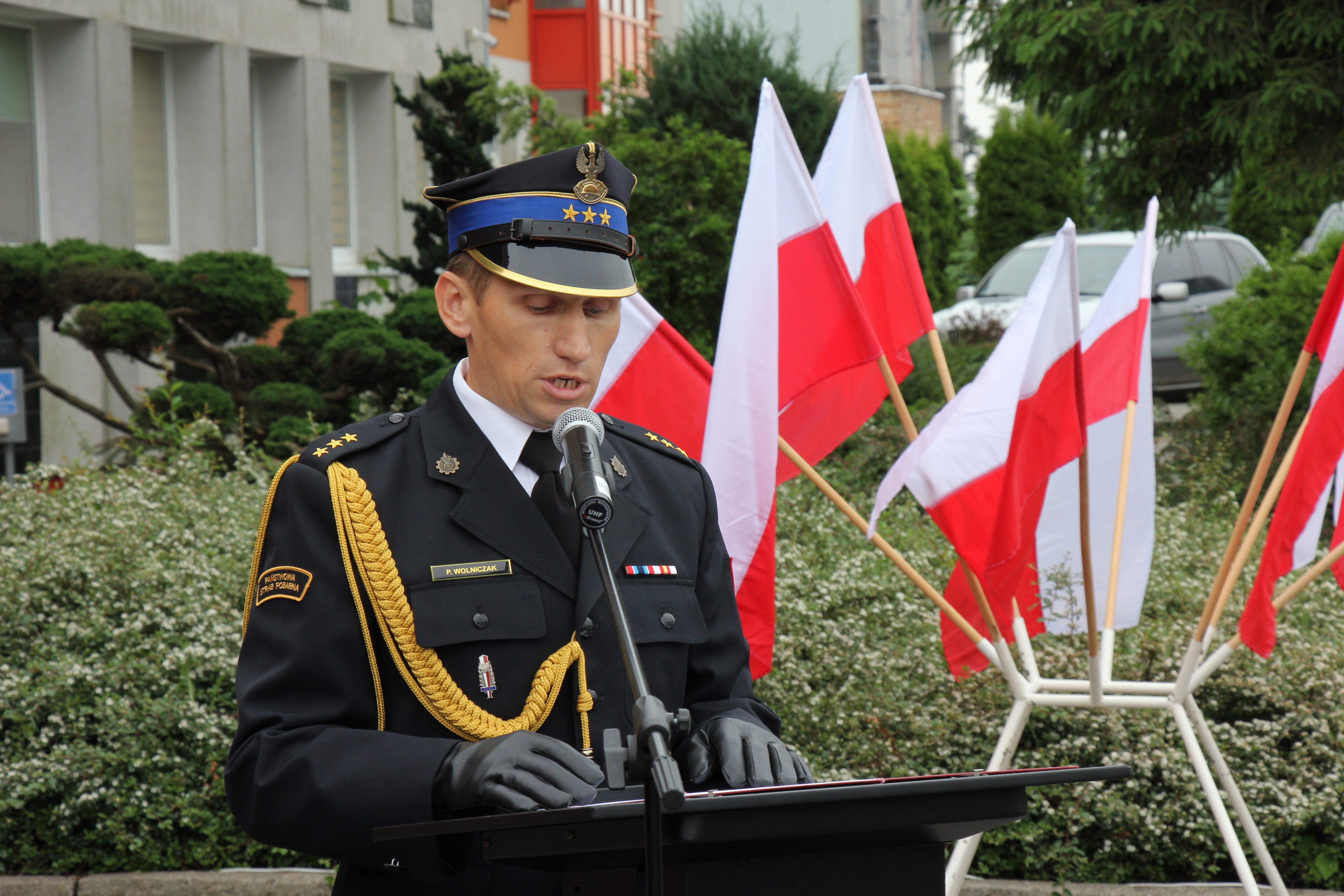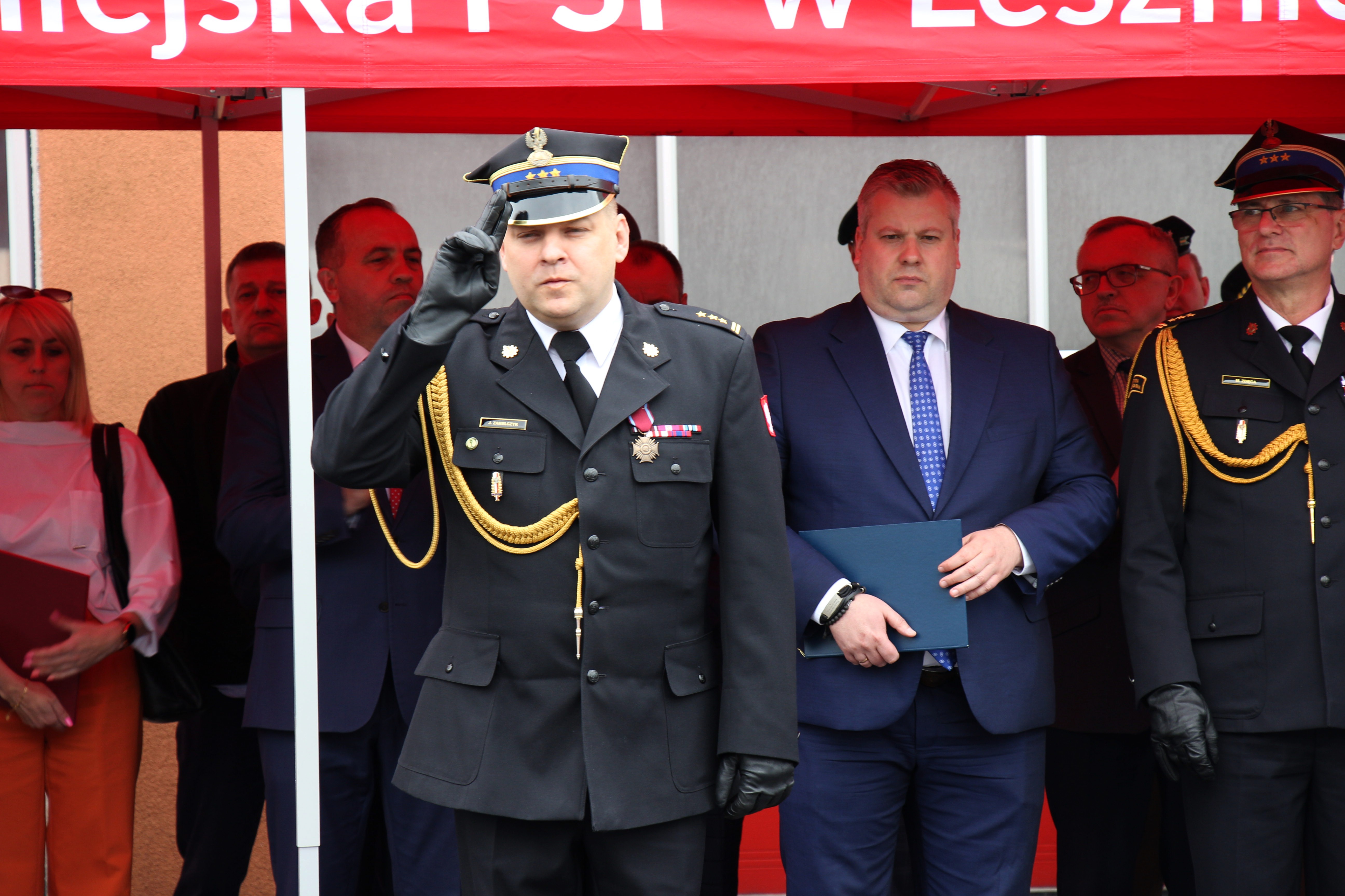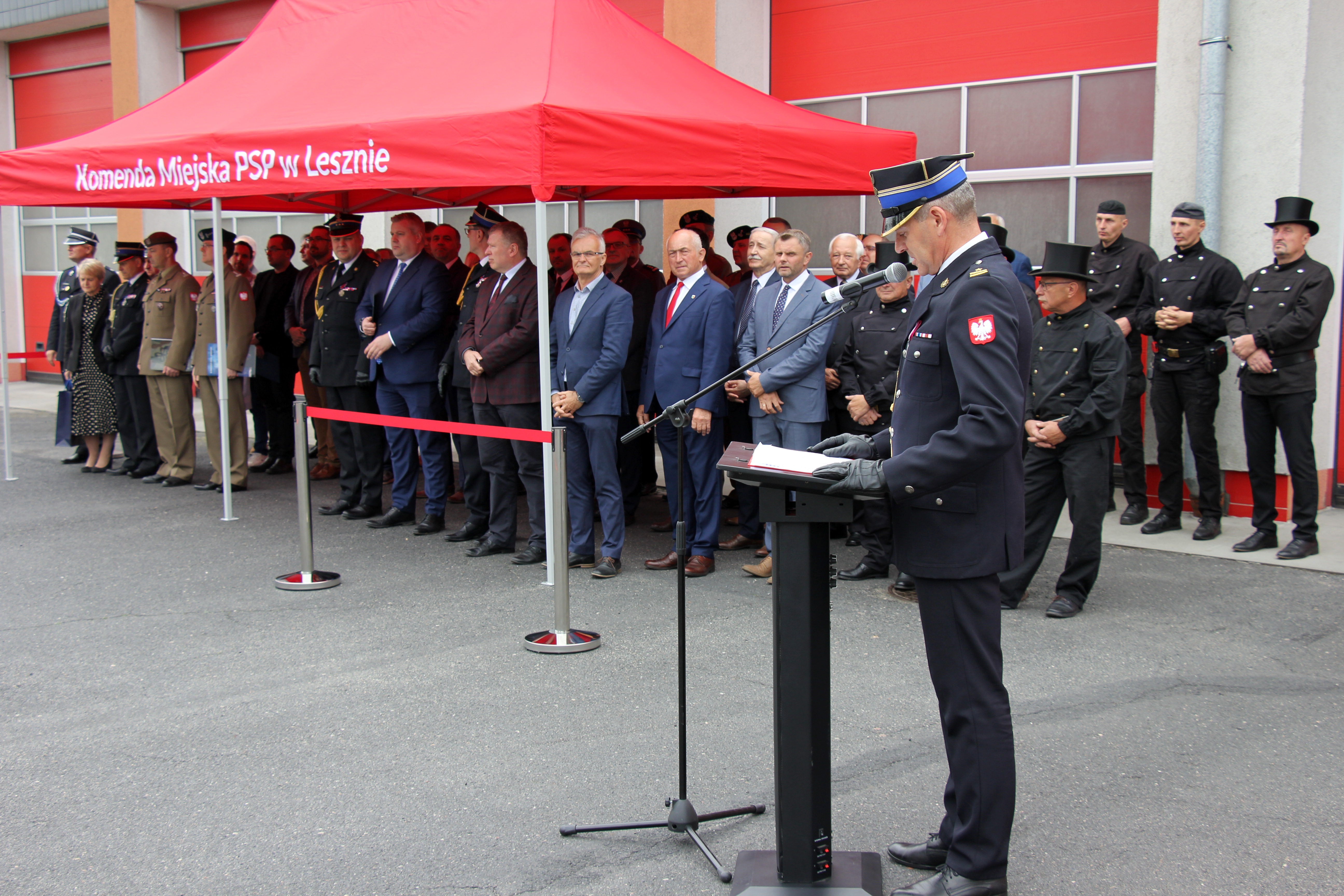 Przybyłych na uroczystość gości powitał mł. bryg. Sebastian Kozłowski Komendant Miejski Państwowej Straży Pożarnej w Lesznie, dziękując również wszystkim za uczestnictwo w tym szczególnym dla leszczyńskich strażaków dniu.