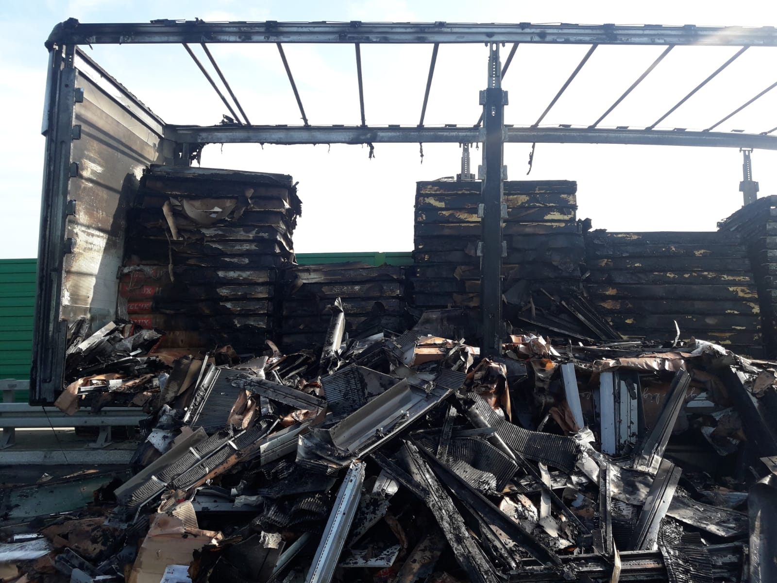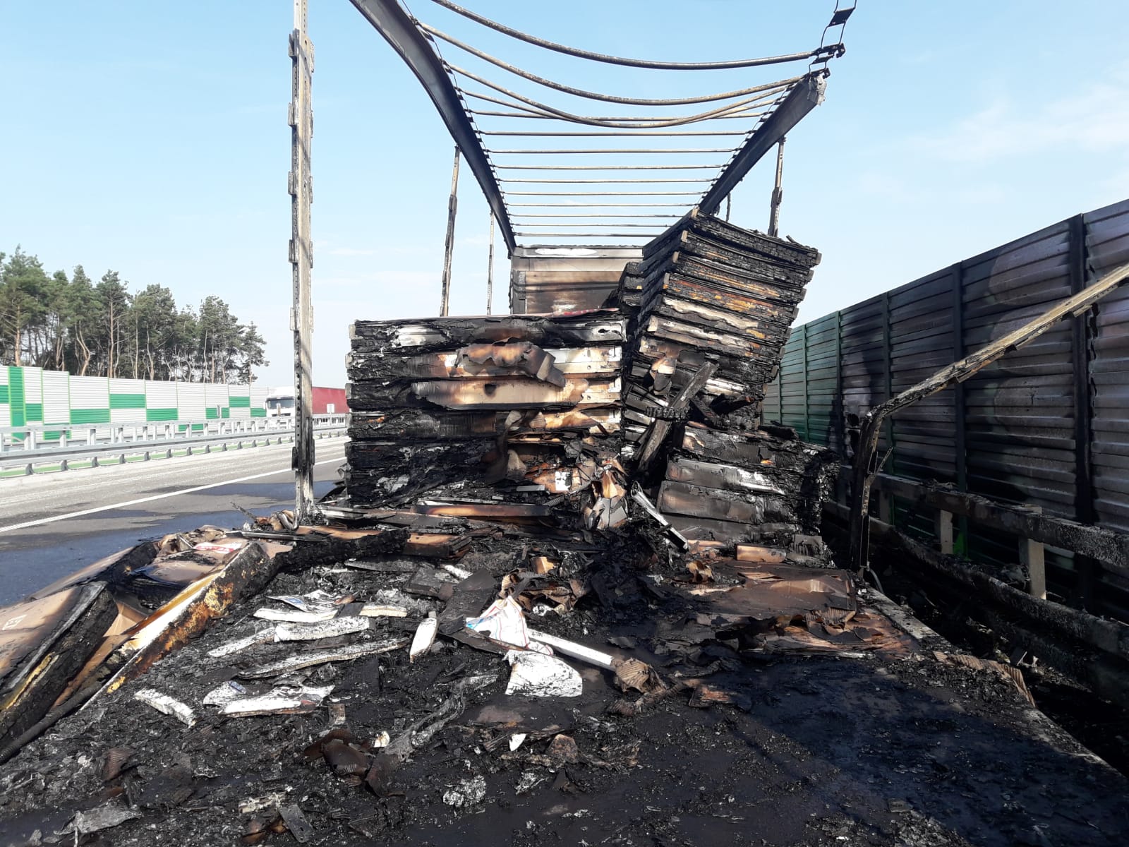 Po dojeździe na miejsce strażacy ustalili, że pożarem objęta była naczepa samochodu ciężarowego, która została odłączona od ciągnika siodłowego przez kierowcę na pasie awaryjnym drogi S5. Strażacy podali dwa prądy wody w natarciu na palącą się naczepę samochodu czym pożar stłumiono. Następnie podano dwa prądy piany ciężkiej w celu ugaszenia palącego się na naczepie przewożonego ładunku. Podczas gaszenia pożaru sukcesywnie usuwano nadpalony ładunek oraz dogaszano na poboczu drogi. Po wyładowaniu uszkodzonego towaru i odholowaniu spalonej naczepy przez właściciela, resztki po pożarowe zostały usunięte z drogi przez służbę porządkową S5. W działaniach gaśniczych, które trwały 6 godzin, uczestniczyło 6 zastępów straży pożarnej w liczbie 19 strażaków. Wstępne szacunkowe straty materialne wyniosły 650 tys. złotych.