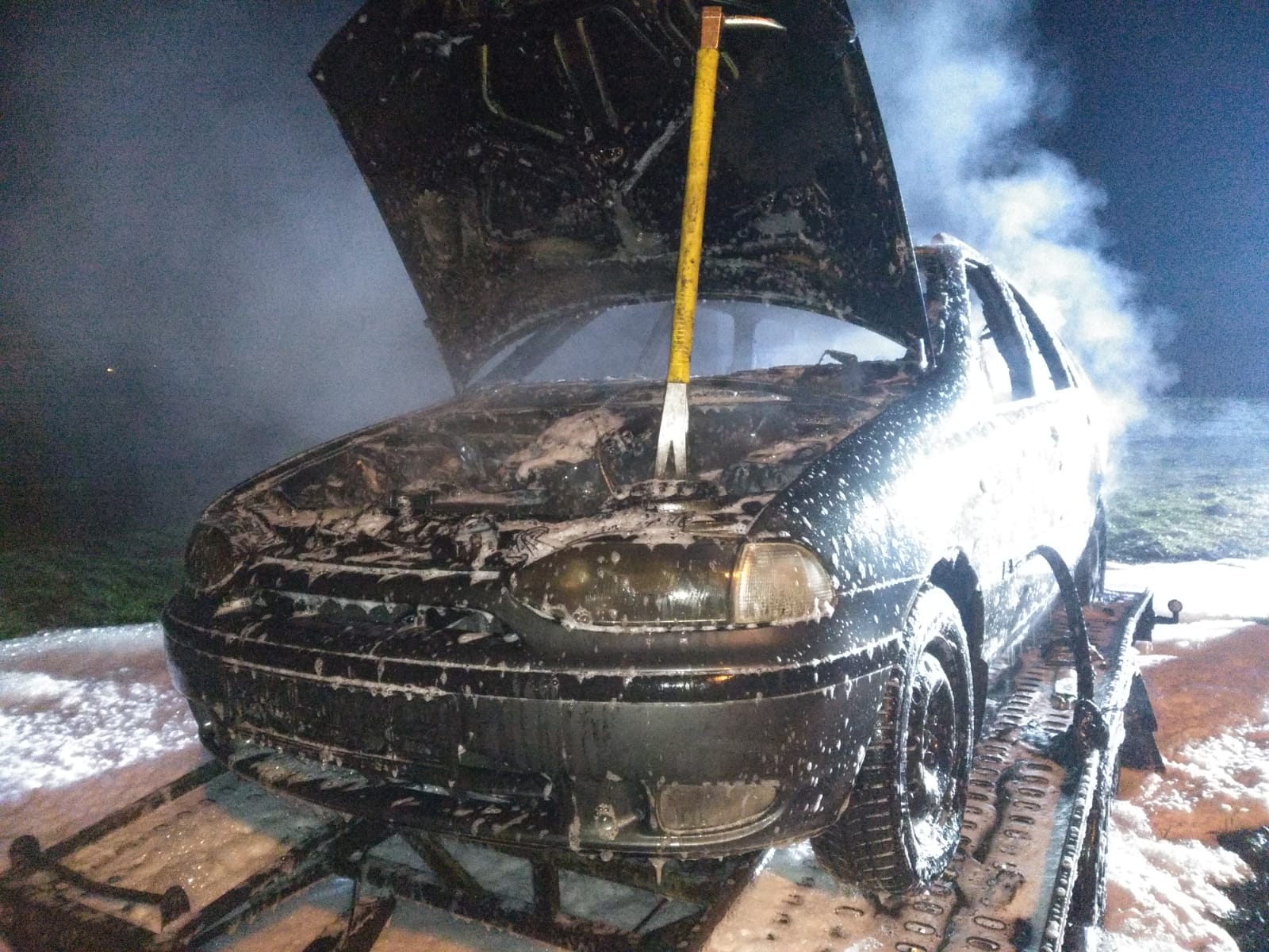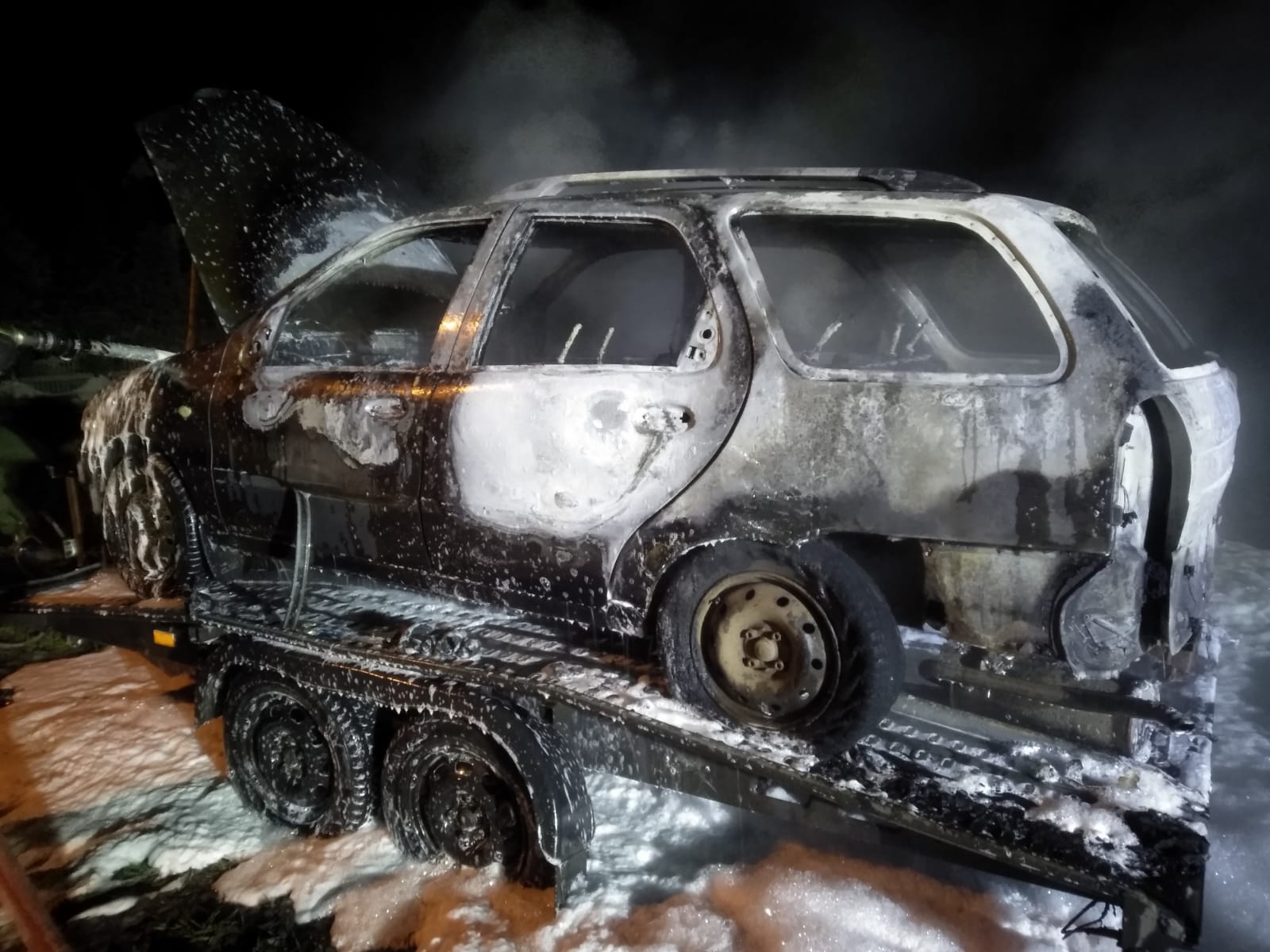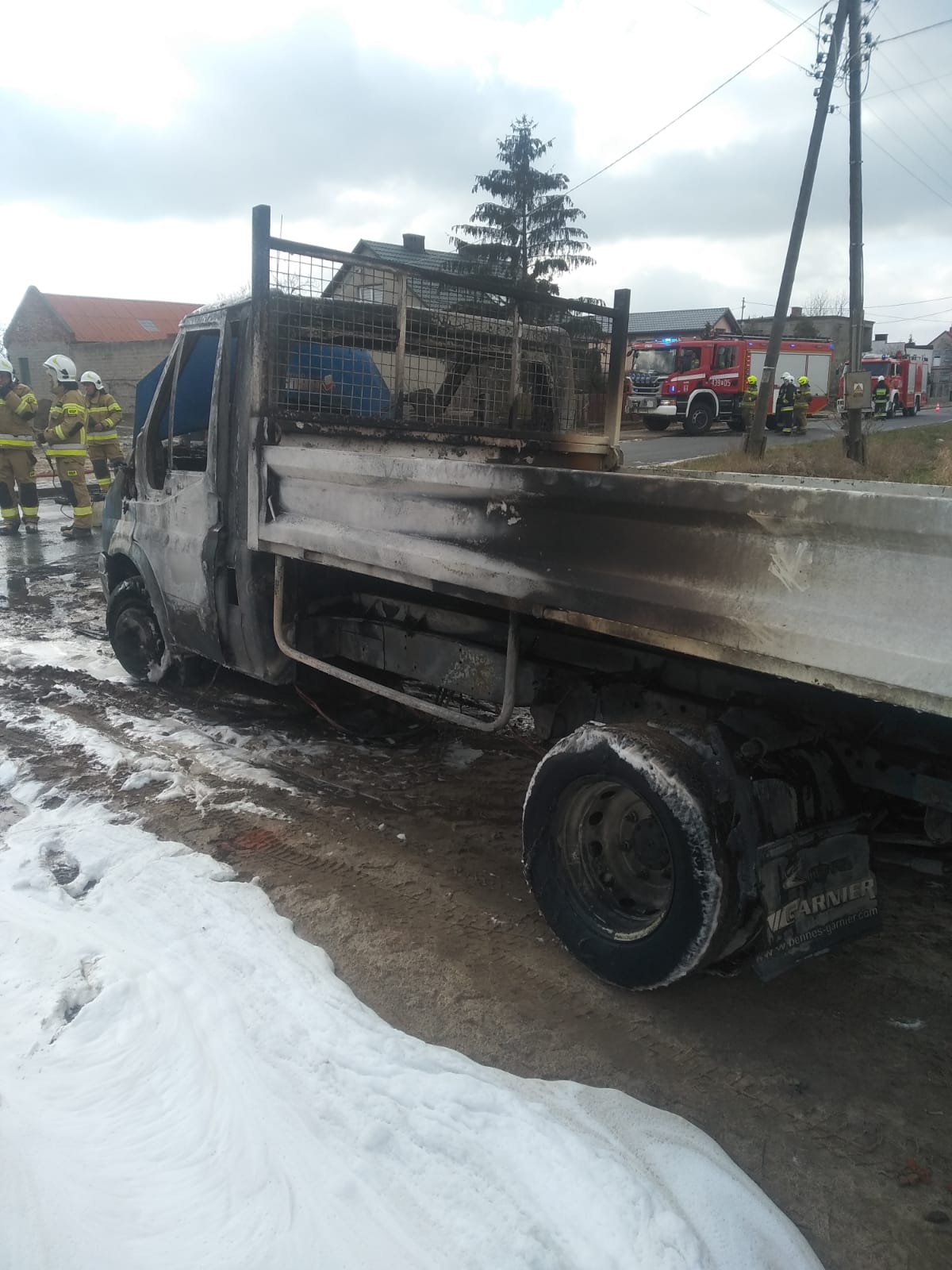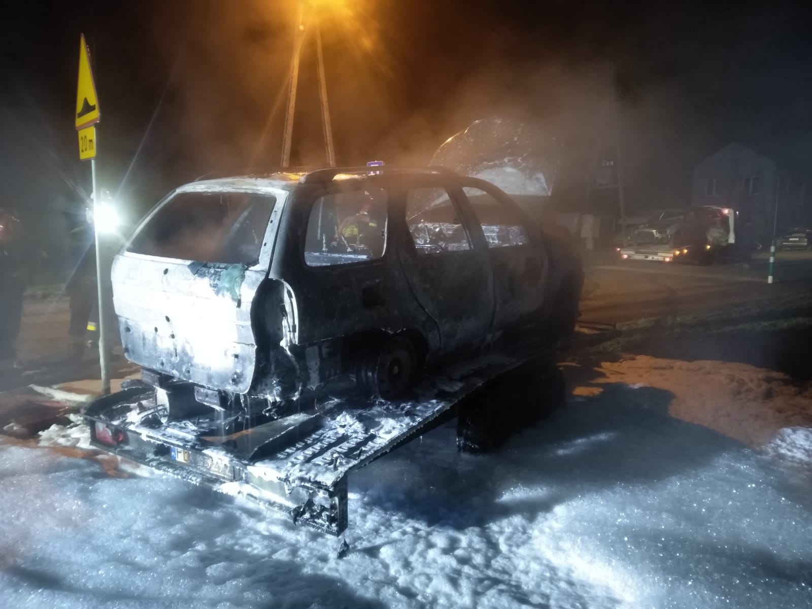Na miejsce zostały zadysponowane zastępy z JRG Leszno i JRG Wschowa oraz z pobliskich Ochotniczych Straży Pożarnych. Pierwszy przybyły na miejsce zastęp zastał samochód marki Forg Transit całkowicie objęty pożarem. Strażacy po zabezpieczeniu terenu działań i zamknięciu drogi w obu kierunkach podali 3 prądy piany oraz jeden prąd wody na palący się pojazd, czym skutecznie ugaszono pożar. Wrak pojazdu został zepchnięty na pobocze i sprawdzony kamerą termowizyjną pod kątem występowania innych zarzewi ognia. W wyniku pożaru całkowitemu spaleniu uległ samochód dostawczy oraz została uszkodzona nawierzchnia drogi powiatowej. Straty oszacowano na 35 tys. zł, natomiast przypuszczalną przyczyną zdarzenia było zwarcie instalacji elektrycznej. Do podobnego zdarzenia doszło około godziny 21:30 w Wilkowicach na ul. Bocznej. Tym razem pożarem został objęty samochód osobowy marki Fiat Siena oraz laweta, na której znajdował się pojazd. Po zabezpieczeniu miejsca zdarzenia zostały podane dwa prądy wody w kierunku płonącego samochodu. Pożar został szybko ugaszony, a cały pojazd sprawdzony kamerą termowizyjną. Straty oszacowano na wartość 5 tys. zł. W działaniach brały udział dwa zastępy z JRG Leszno oraz OSP Wilkowice.