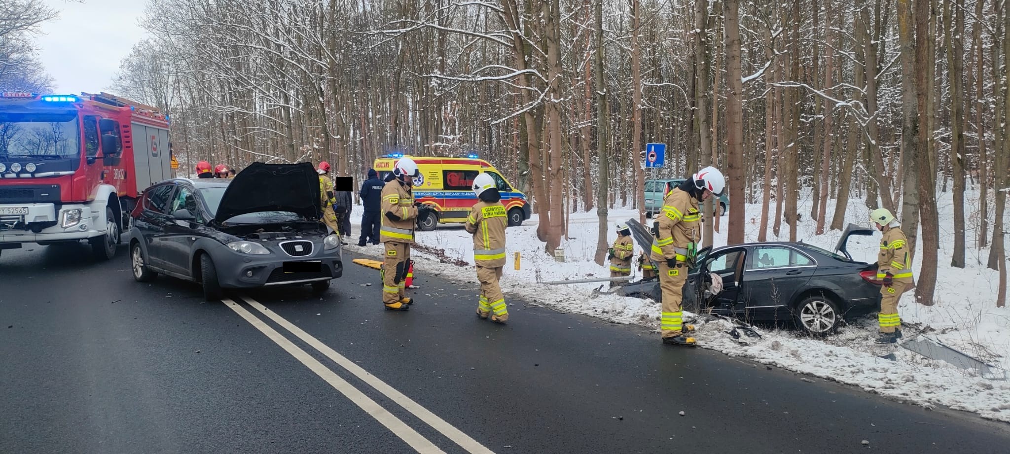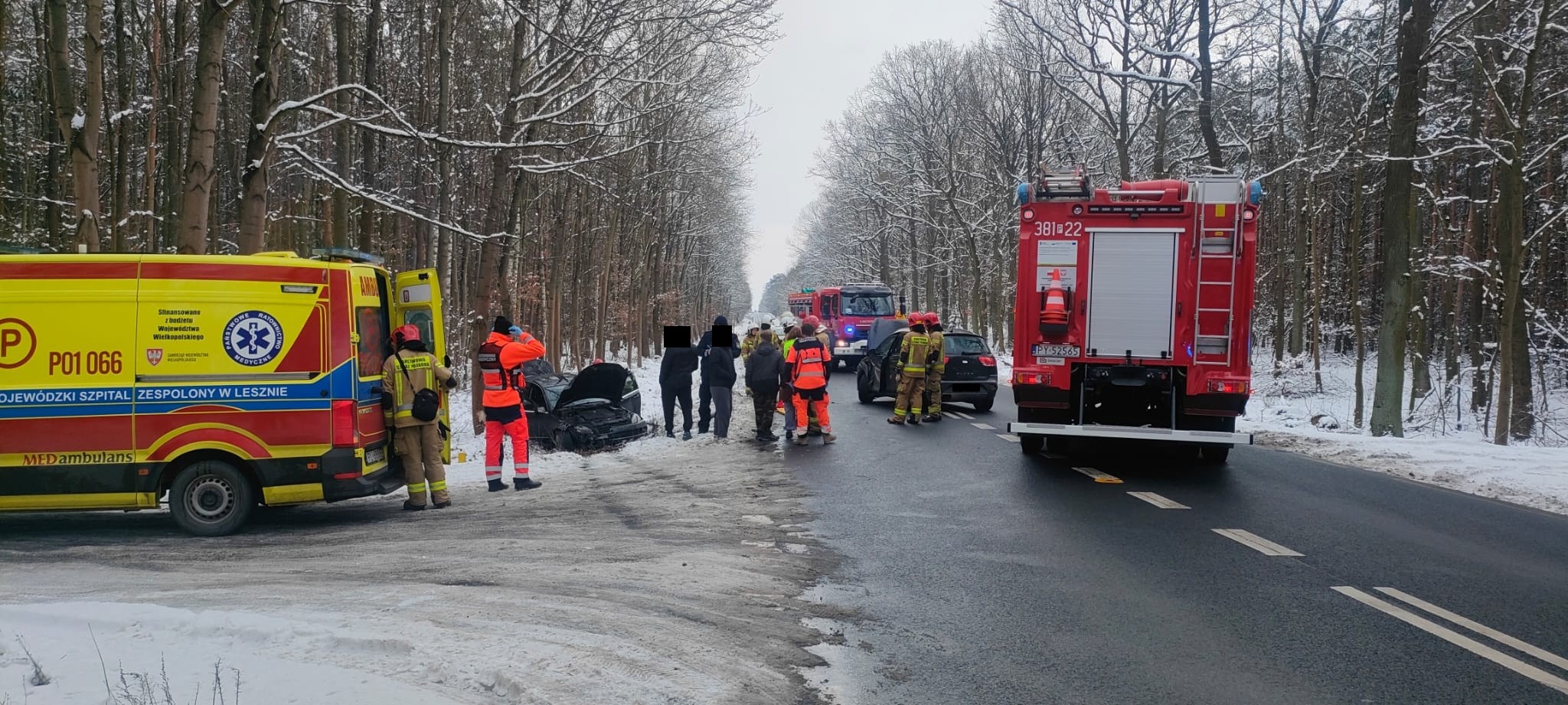 W dniu 16 lutego 2025 r. ok. godz. 12:00 do Stanowiska Kierowania Komendanta Miejskiego w Lesznie wpłynęło zgłoszenie o wypadku dwóch samochodów osobowych na DK12 pomiędzy m. Leszno i m. Kąkolewo. Z informacji otrzymanej z Centrum Powiadamiania Ratunkowego wynikało, że jedna osoba jest uwięziona w pojeździe. Do zdarzenia zadysponowano dwa zastępy z Jednostki Ratowniczo-Gaśniczej (JRG) w Lesznie oraz jeden zastęp z Ochotniczej Straży Pożarnej (OSP) w Kąkolewie. Po dotarciu pierwszych zastępów na miejsce ustalono, że w zdarzeniu brały udział dwa samochody osobowe marki Mercedes W204 i Seat Altea. W wyniku zderzenia pojazdów dwóch mężczyzn w wieku ok. 20 i 40 lat odniosło rany i po wstępnym przebadaniu przez Zespołu Ratownictwa Medycznego zostało zabranych do szpitala. Po wykonaniu czynności dochodzeniowych przez Policję usunięto pojazdy w bezpieczne miejsce poza jezdnię. Straty powstałe w wyniku tego zdarzenia to ok. 35 tys. zł.