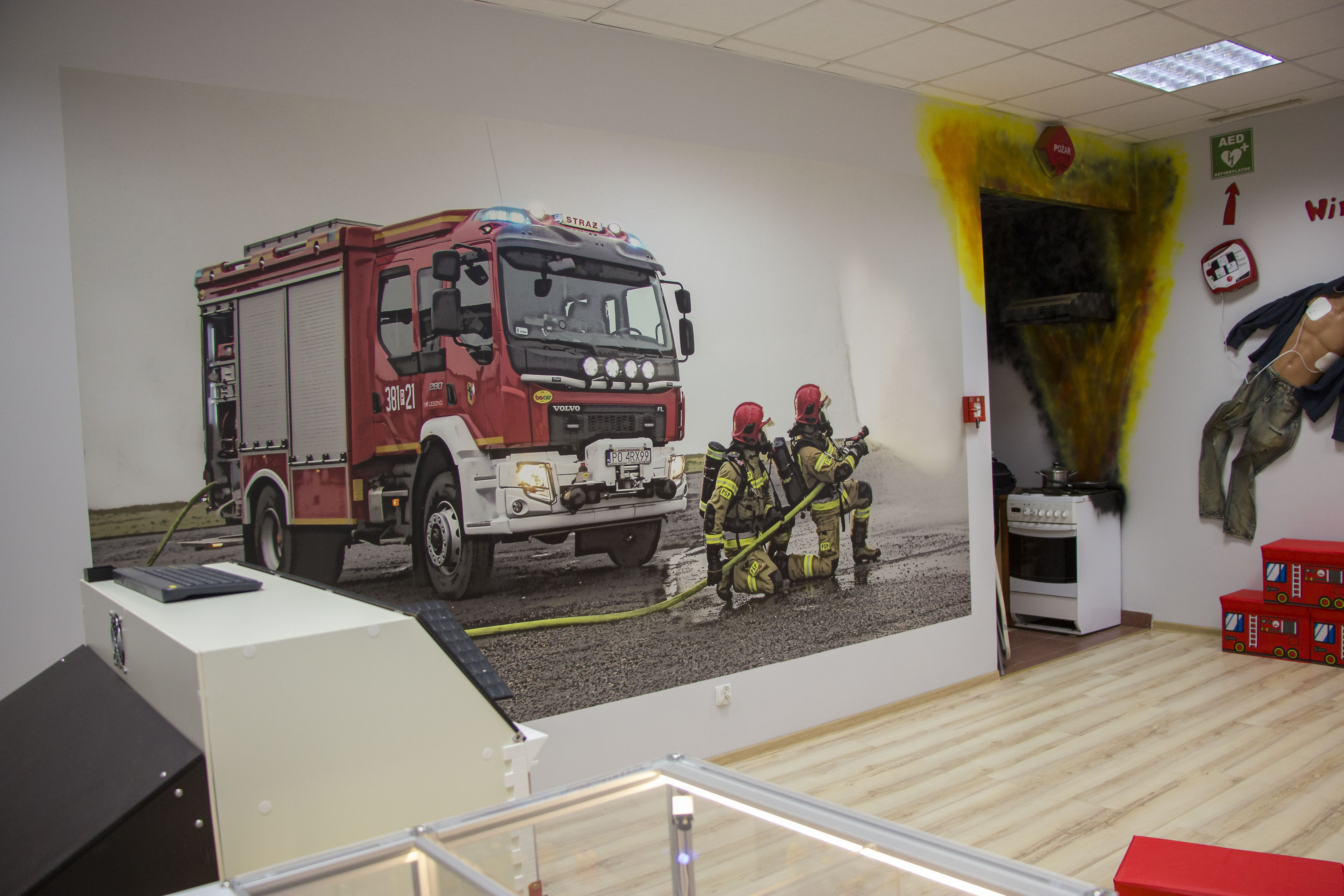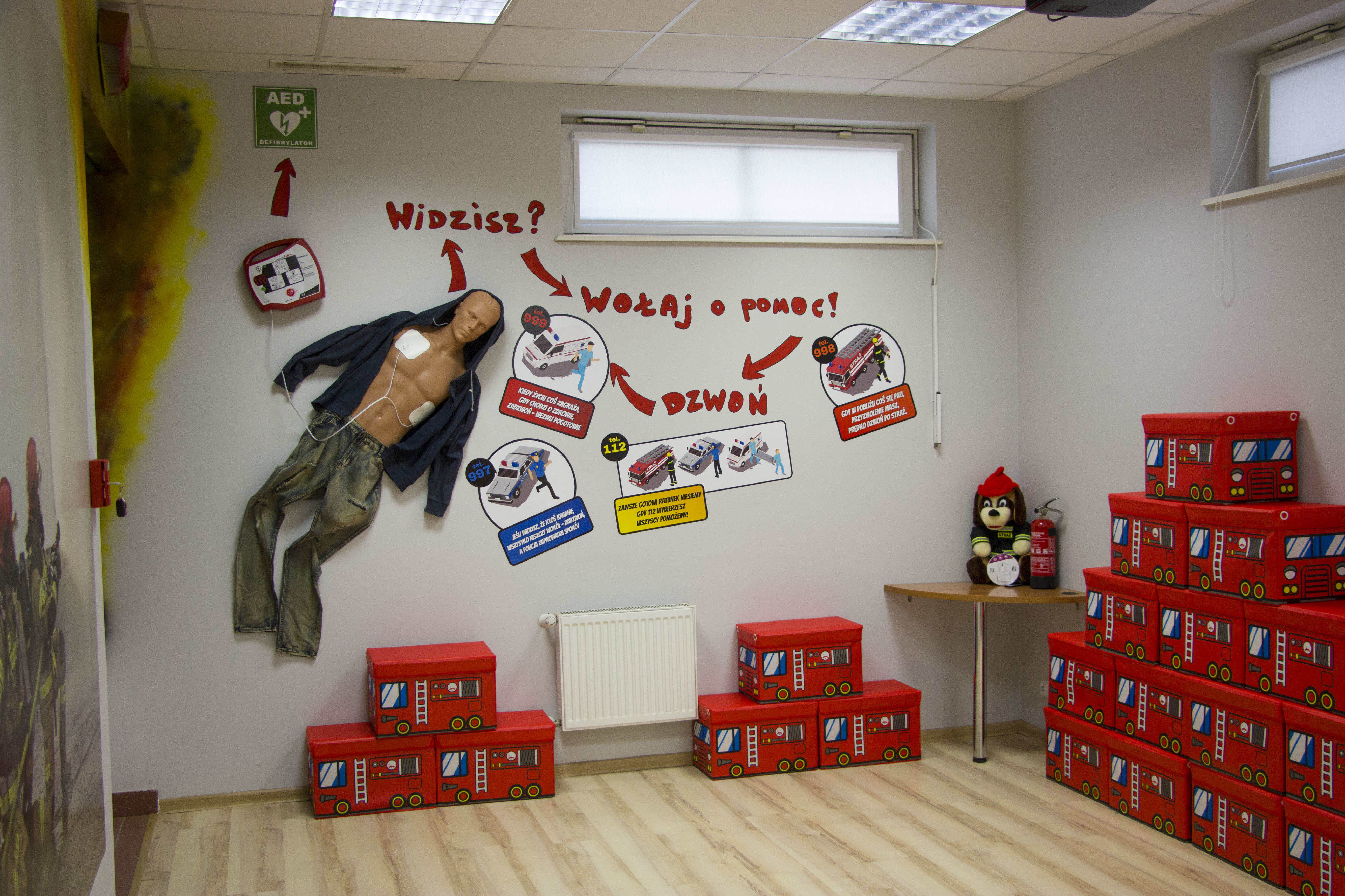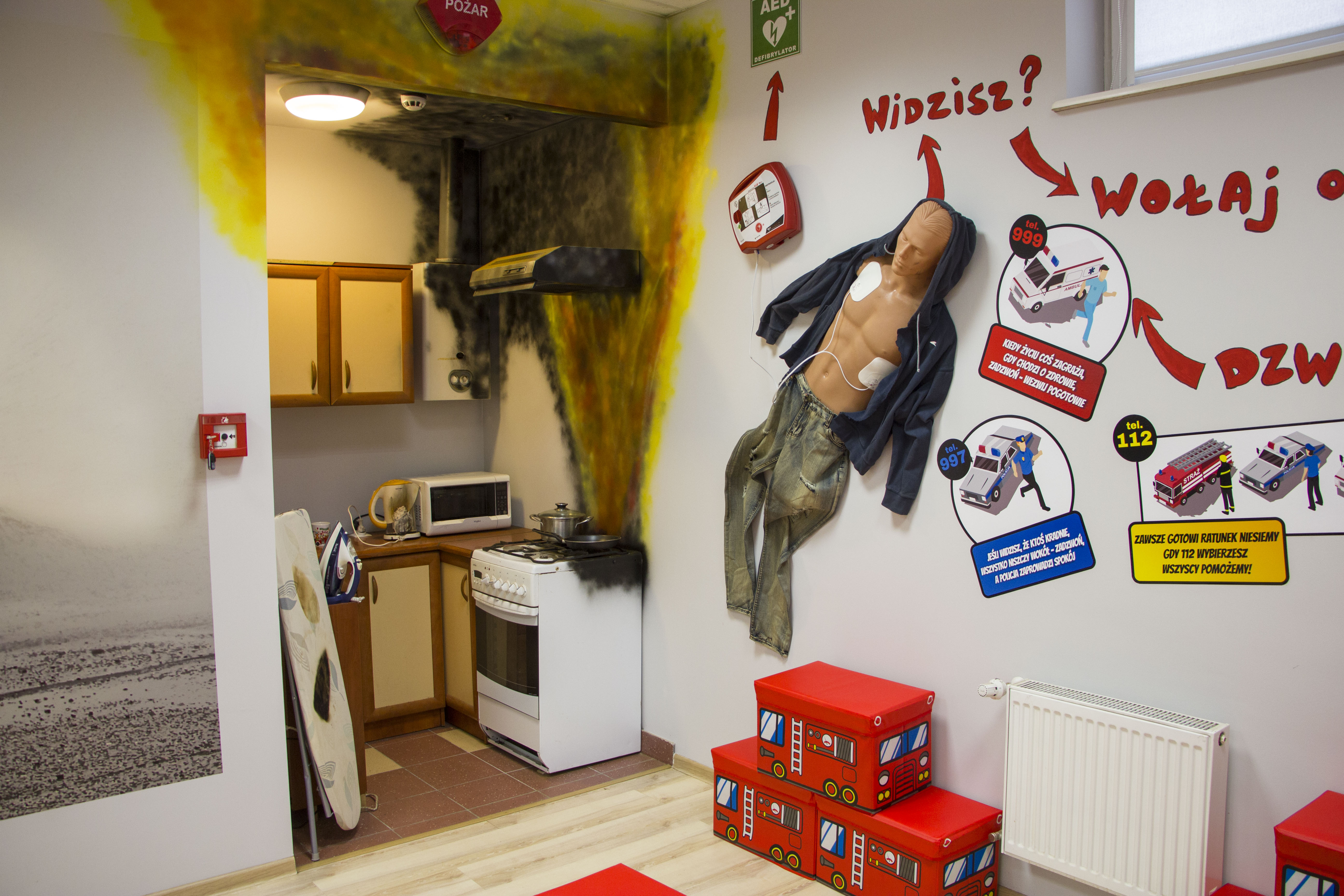 W salce edukacyjnej zaprezentowano tablice z podstawowymi znakami bezpieczeństwa oraz zorganizowano miejsce udzielania pierwszej pomocy czy kącik obrazujący skutki po pożarowe pomieszczenia kuchennego.