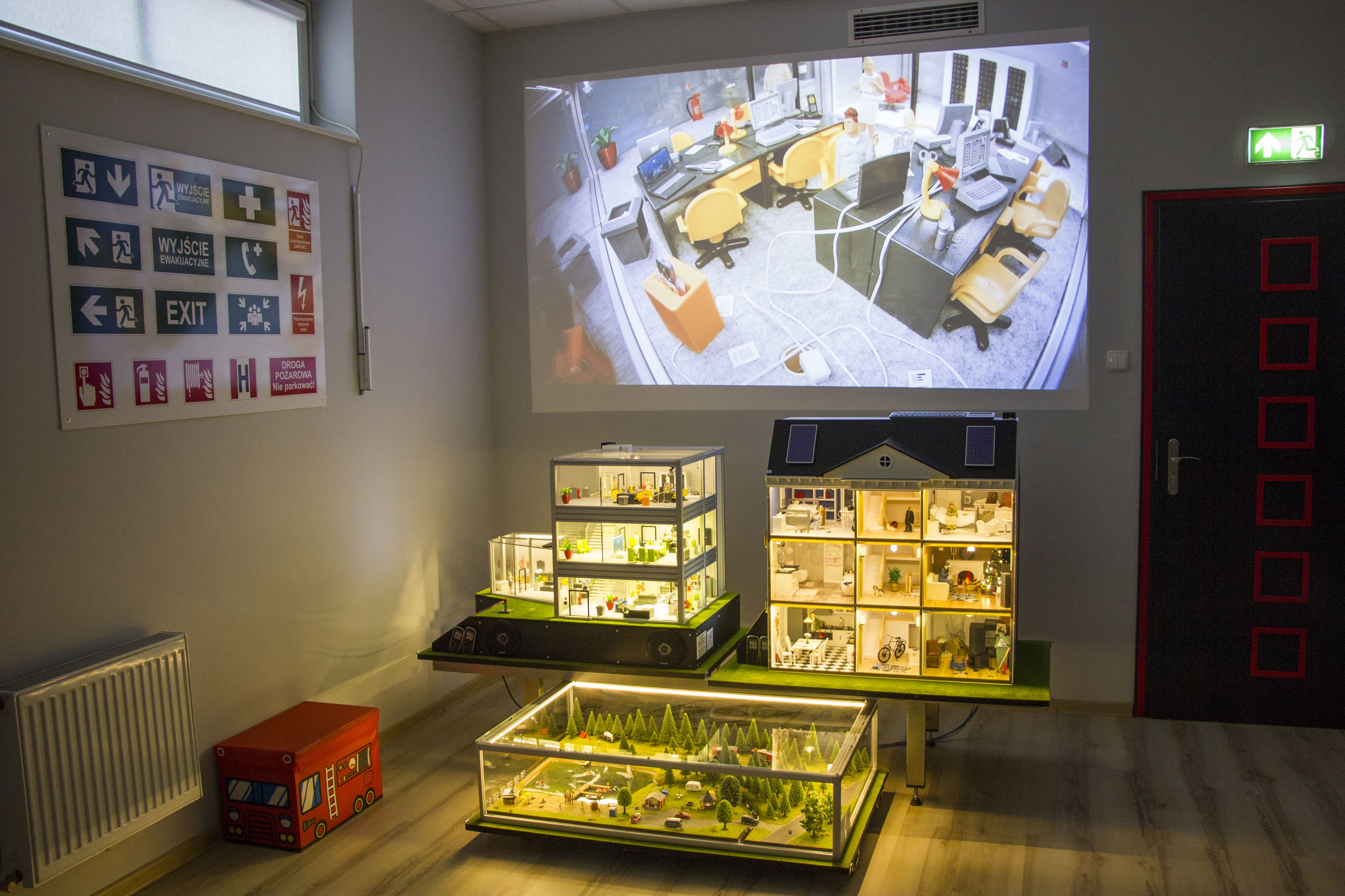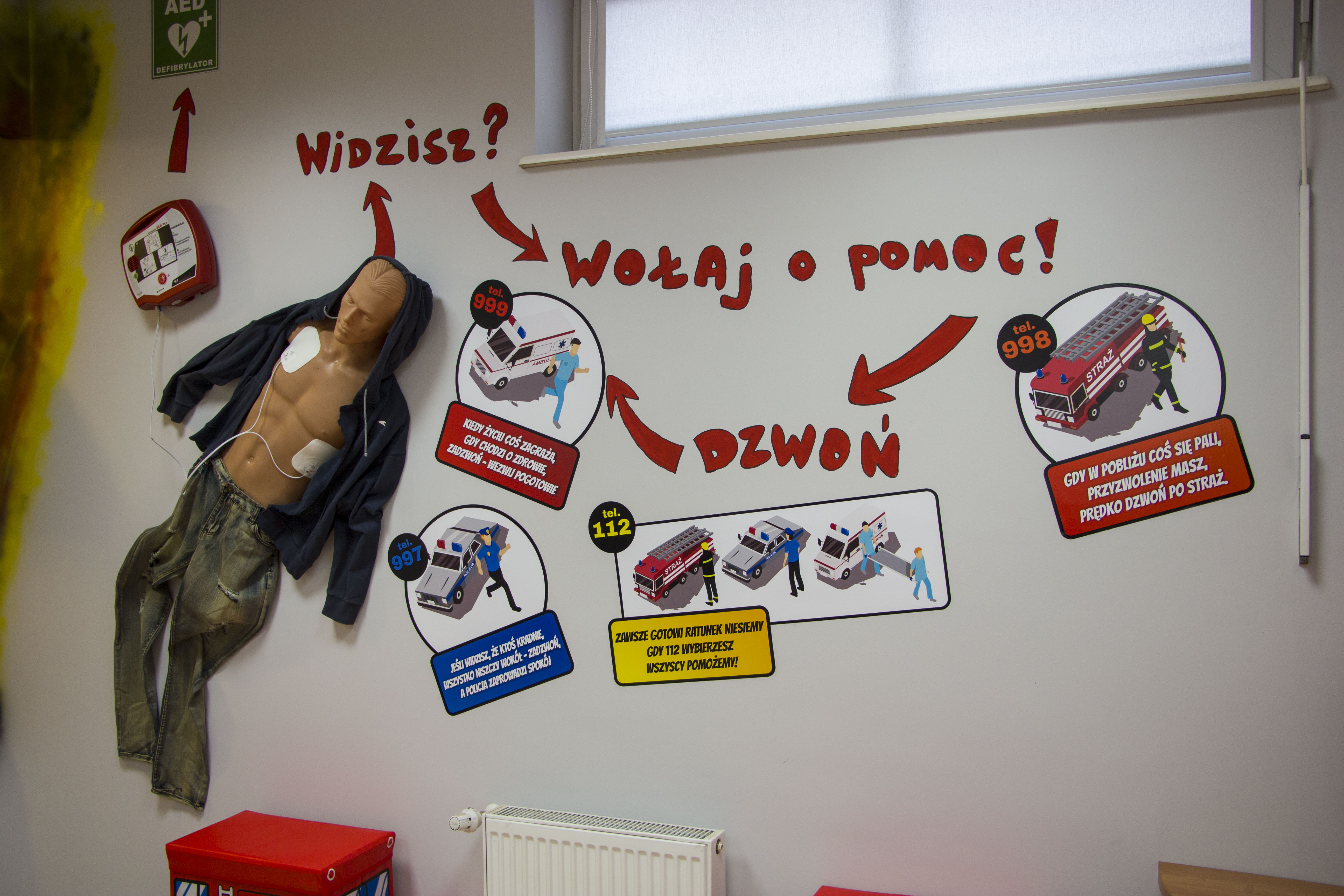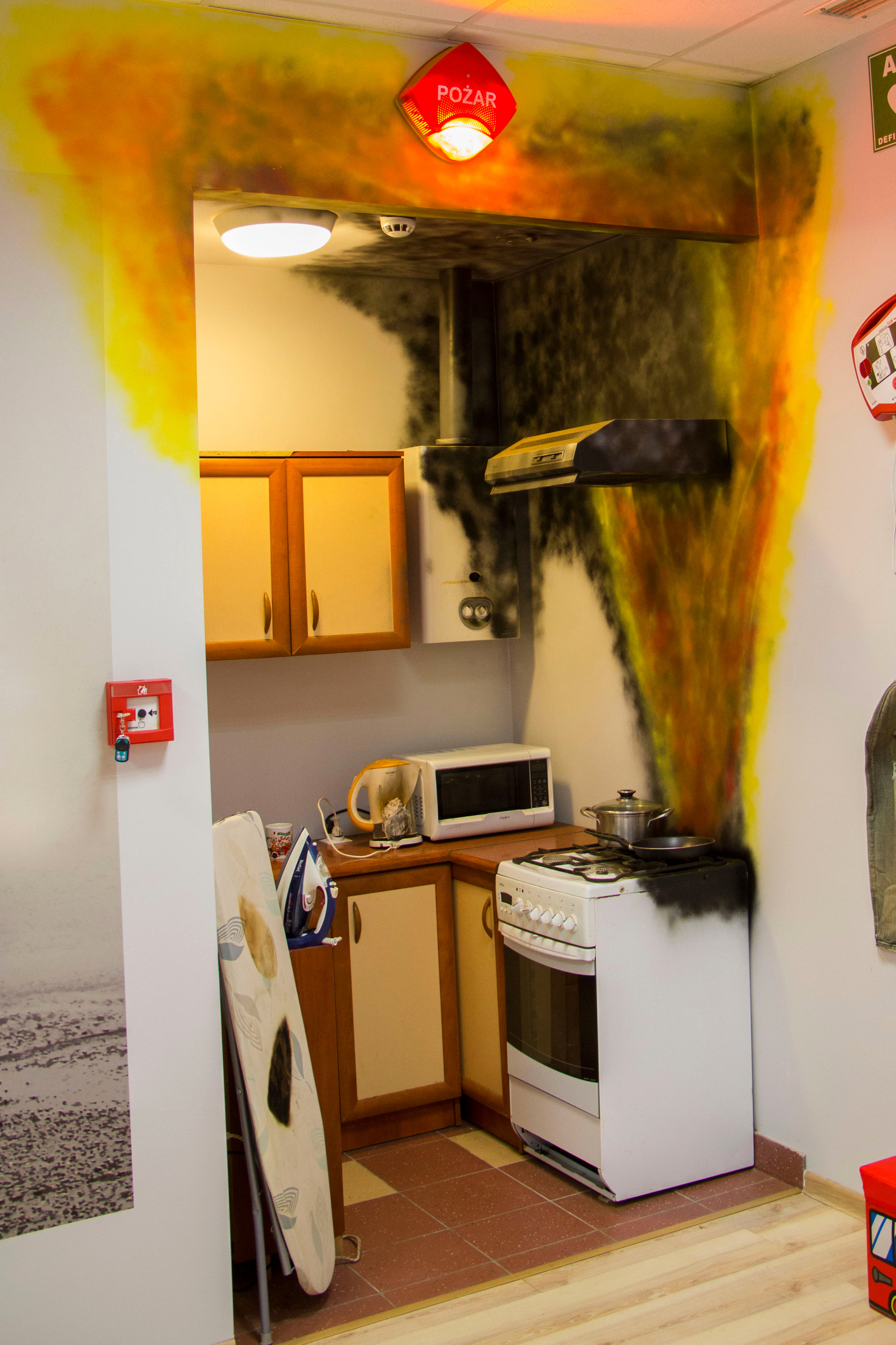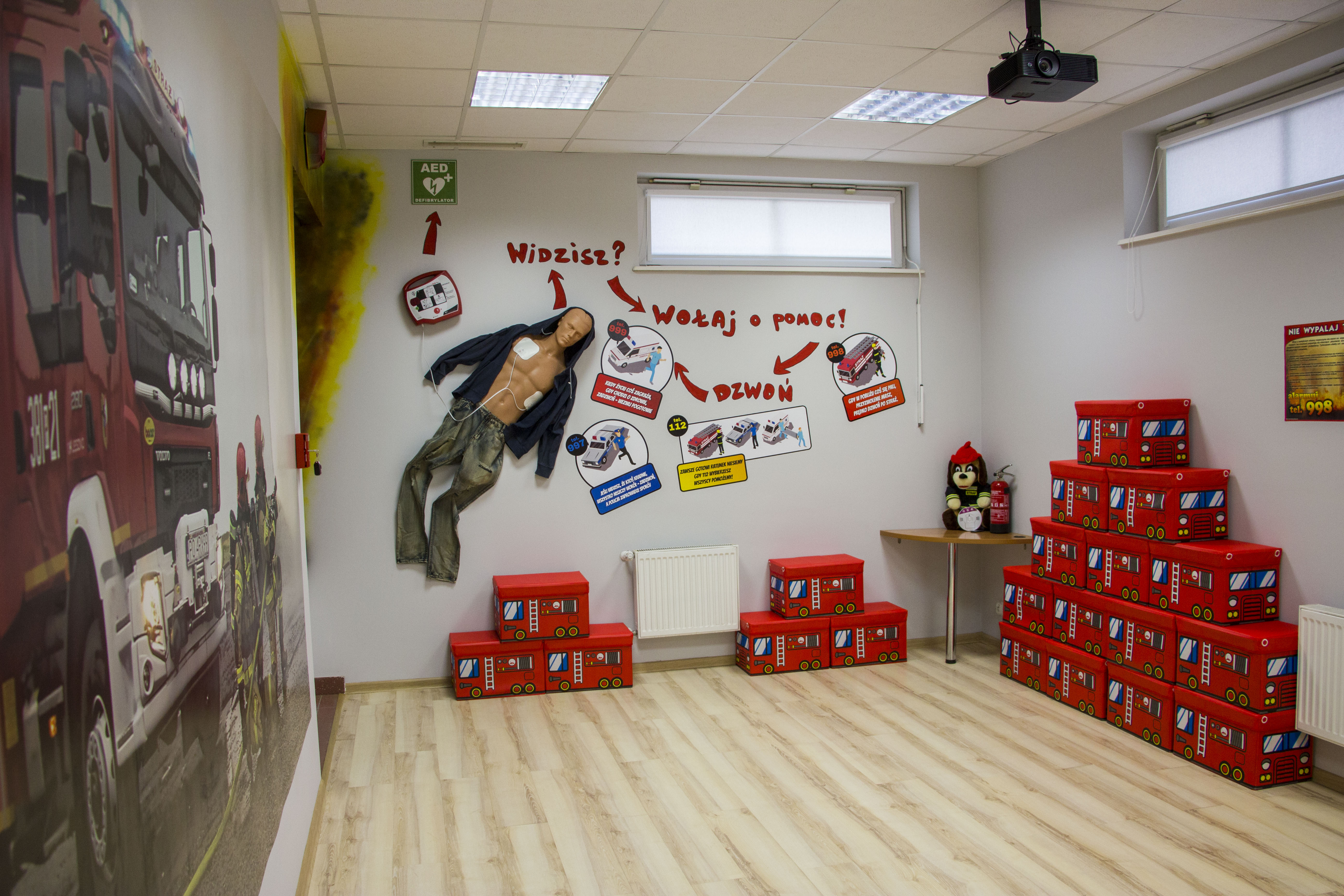 W salce edukacyjnej zaprezentowano tablice z podstawowymi znakami bezpieczeństwa oraz zorganizowano miejsce udzielania pierwszej pomocy czy kącik obrazujący skutki po pożarowe pomieszczenia kuchennego.